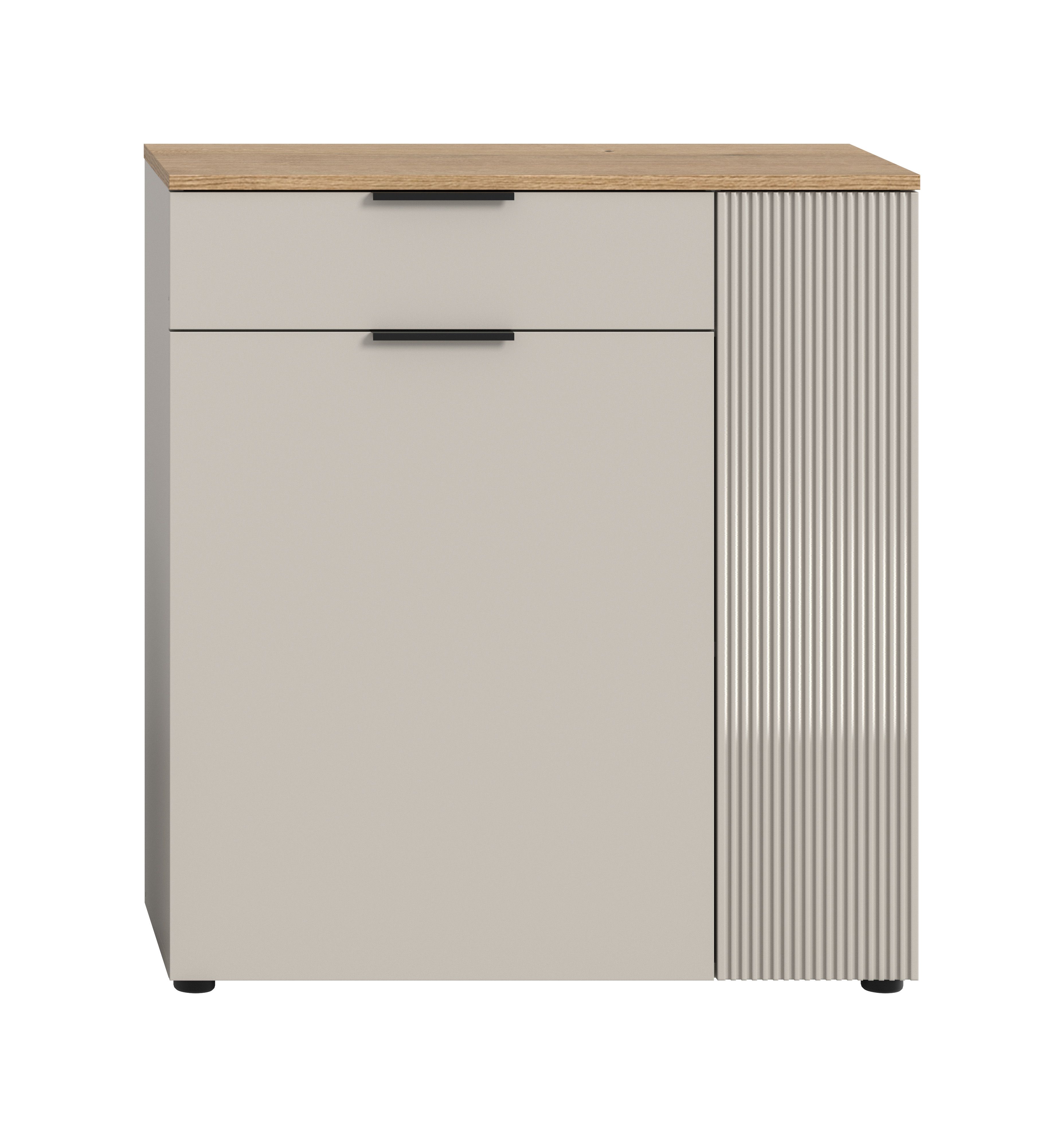 Die Garderobenkommode in Kaschmir-Nachbildung (80x88x36 cm) verbindet stilvolles Design mit praktischer Funktionalität. Mit zwei Türen, einem Schubkasten und einem herausnehmbaren Einlegeboden bietet sie vielseitigen Stauraum für bis zu sechs Paar Schuhe. Die Front mit eleganter Längstfräsung setzt dabei einen modernen Akzent und sorgt für ein aufgeräumtes Ambiente im Eingangsbereich. Robust und zugleich ansprechend – ideal für eine ordentliche und einladende Garderobe.