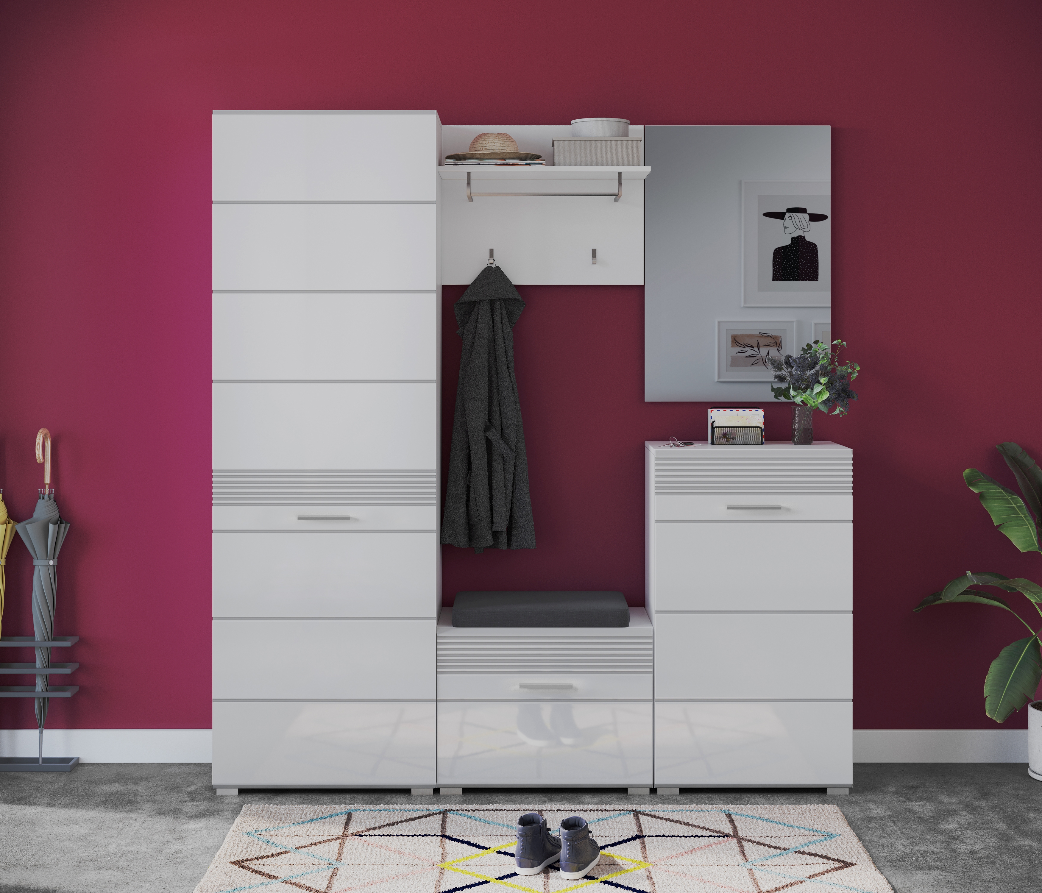 - Design/Stil: Modernes und elegantes Design mit einer Kombination aus weißer Nachbildung und weißem Hochglanz tiefzieh, das eine stilvolle und zeitgemäße Ästhetik für den Flur, die Diele oder den Hauswirtschaftsraum bietet.