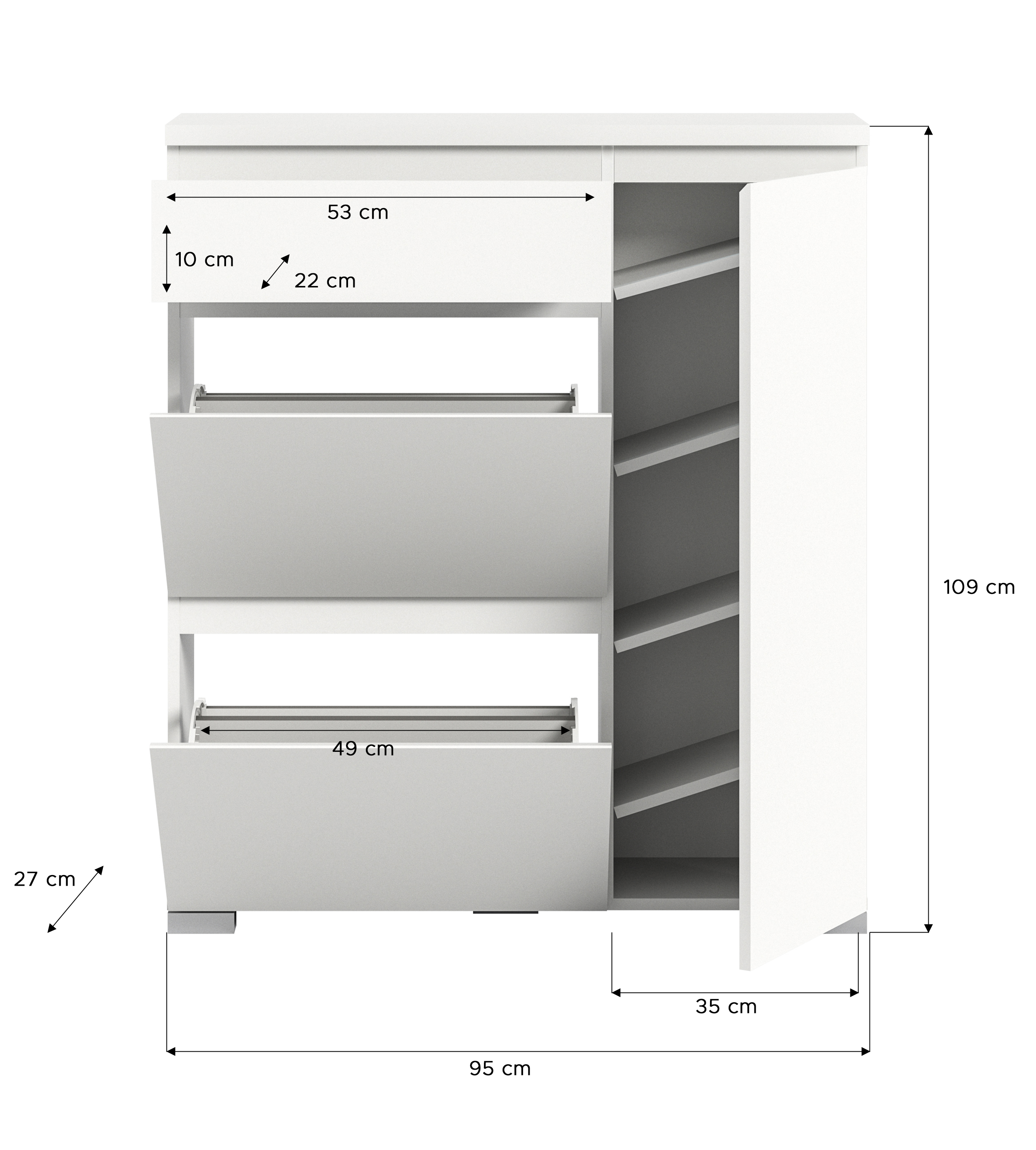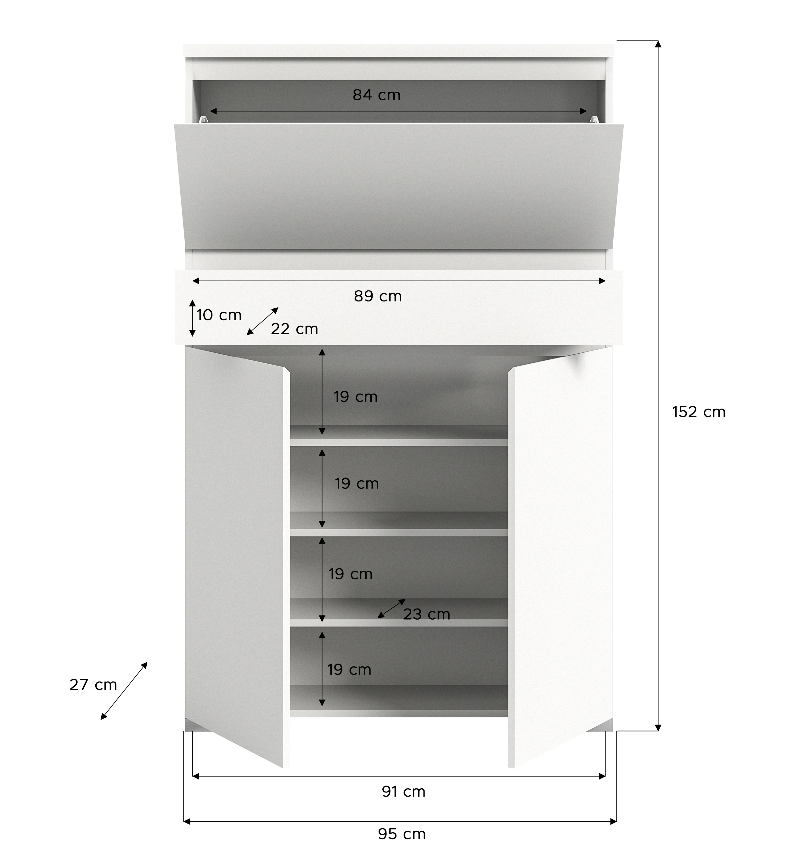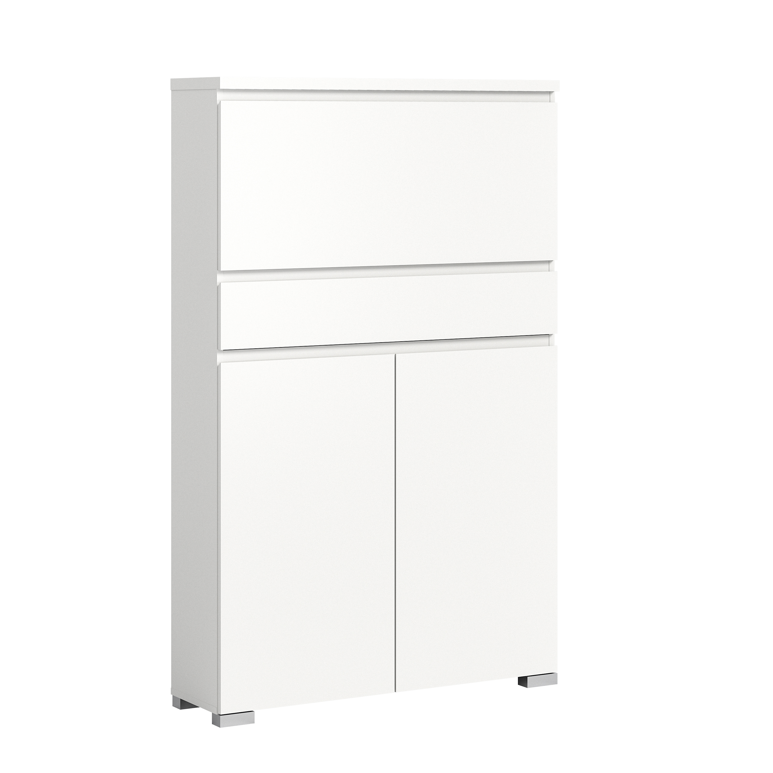 1 Schuhkipper hoch mit 1 Schubkasten, 1 Klappe, 2 Türen und 3 Einlegeböden