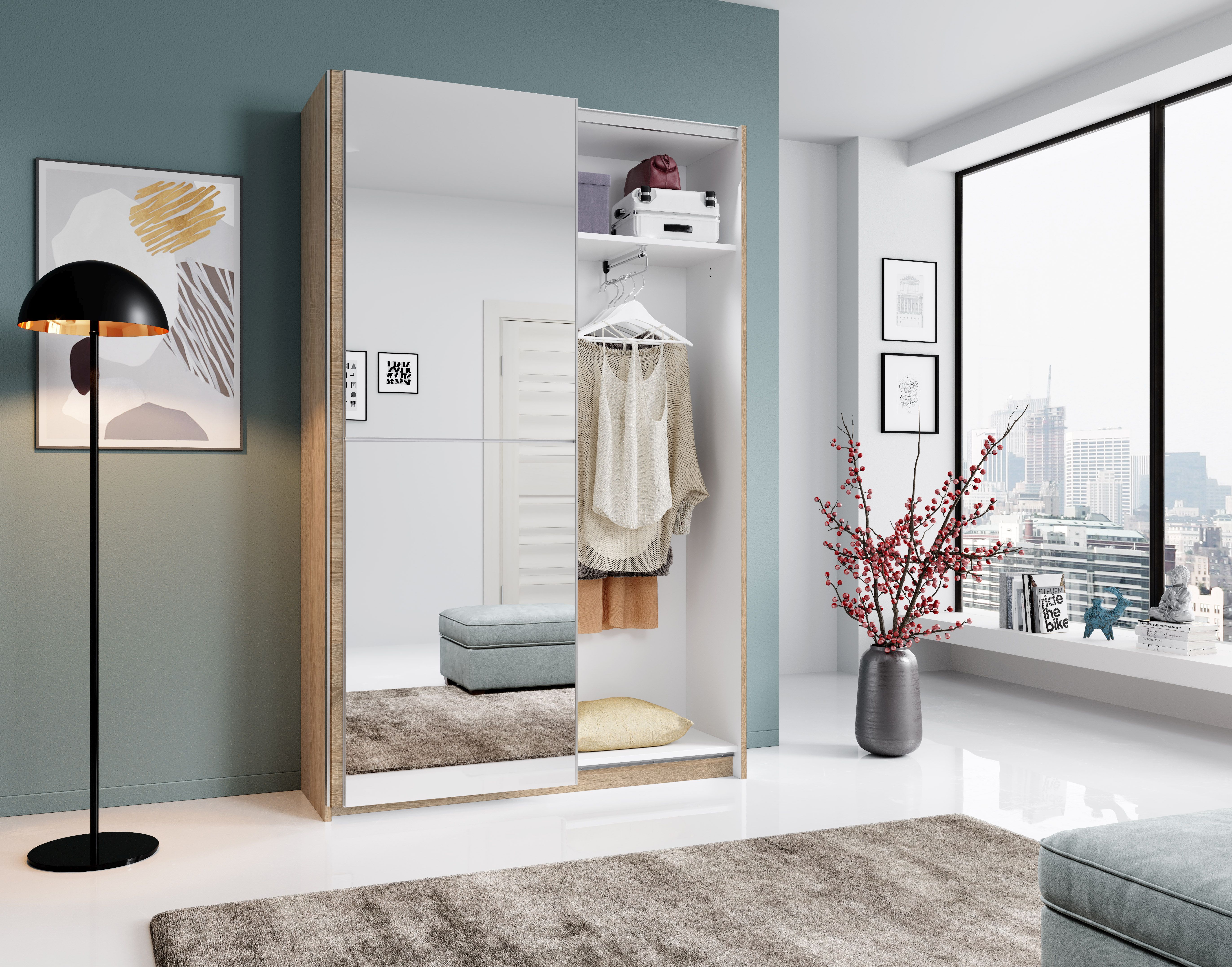 Moderne Farben - Verschiedene Farben sind hier perfekt umgesetzt. Sie können zwischen Sonoma Eiche und Weiß wählen und sich so Ihren passenden Schrank für Ihr Schlafzimmer oder Ihre Garderobe aussuchen.