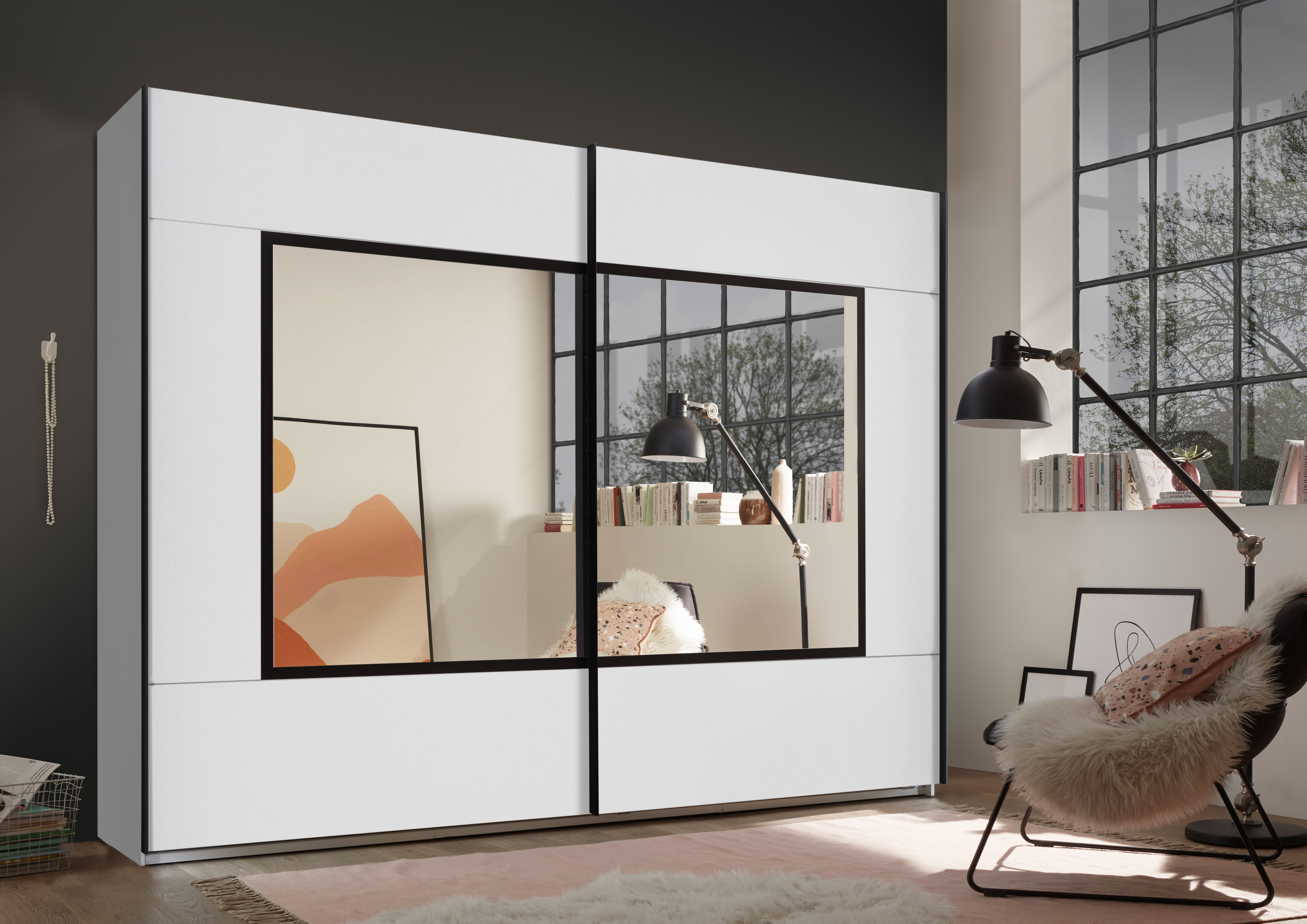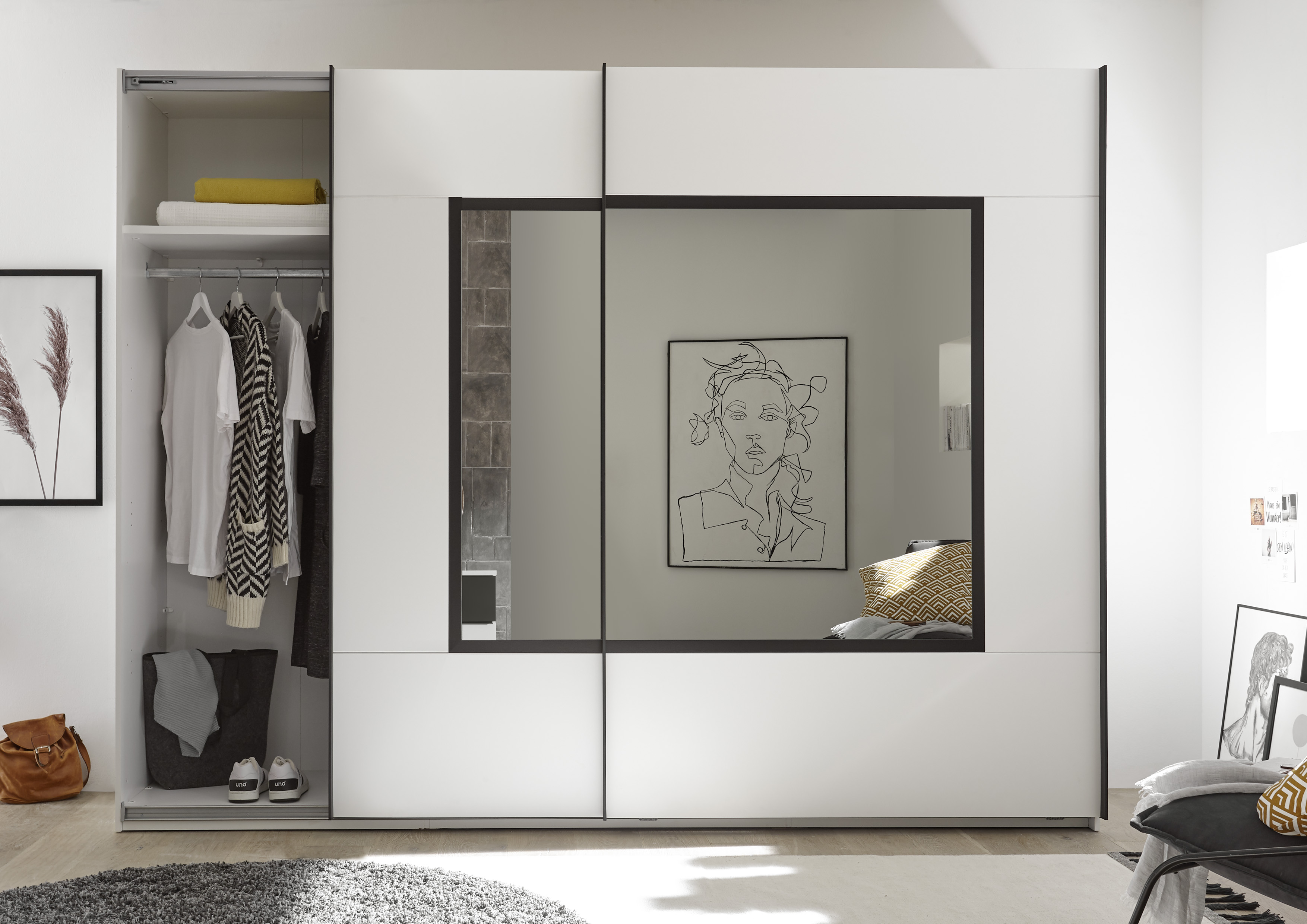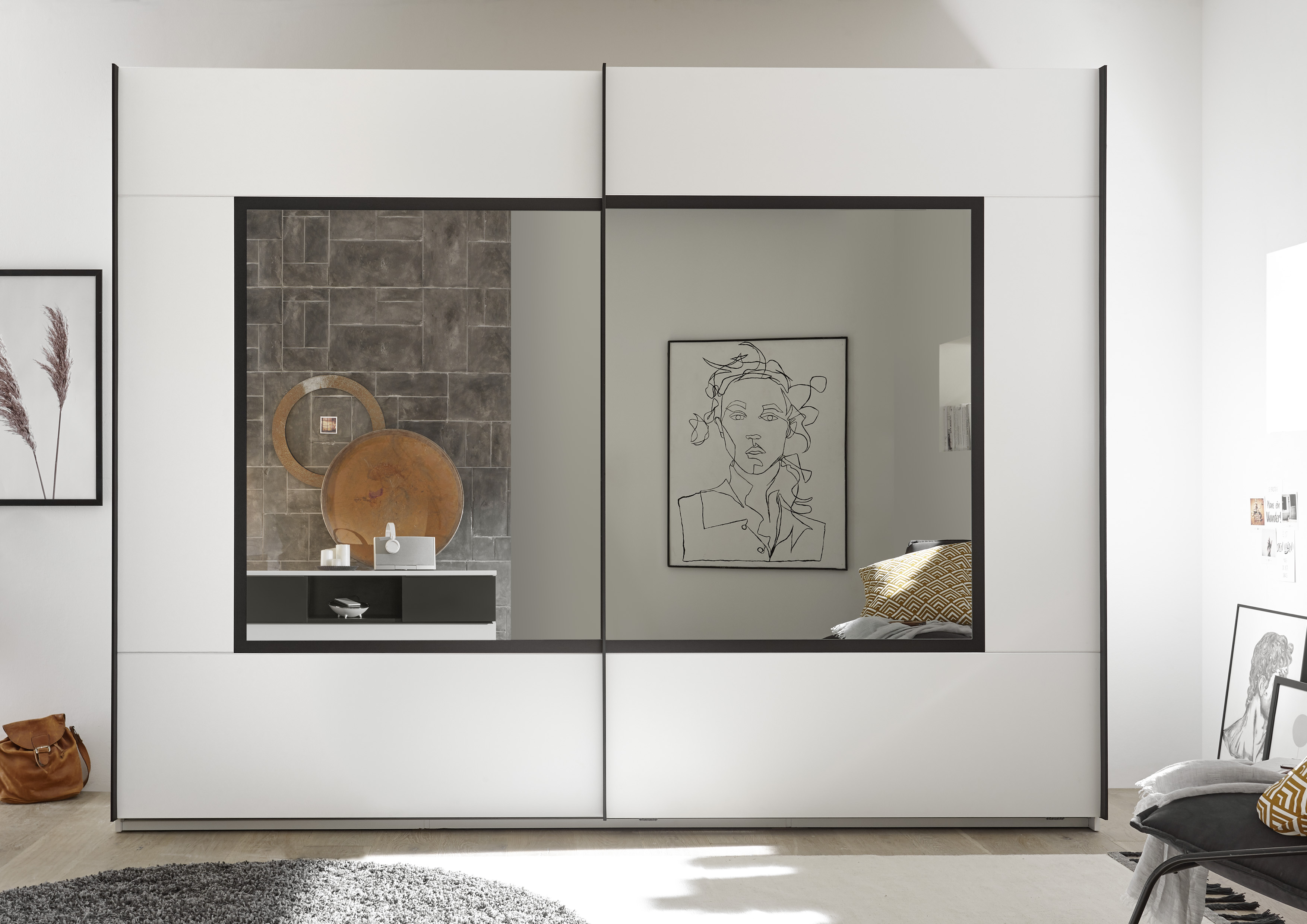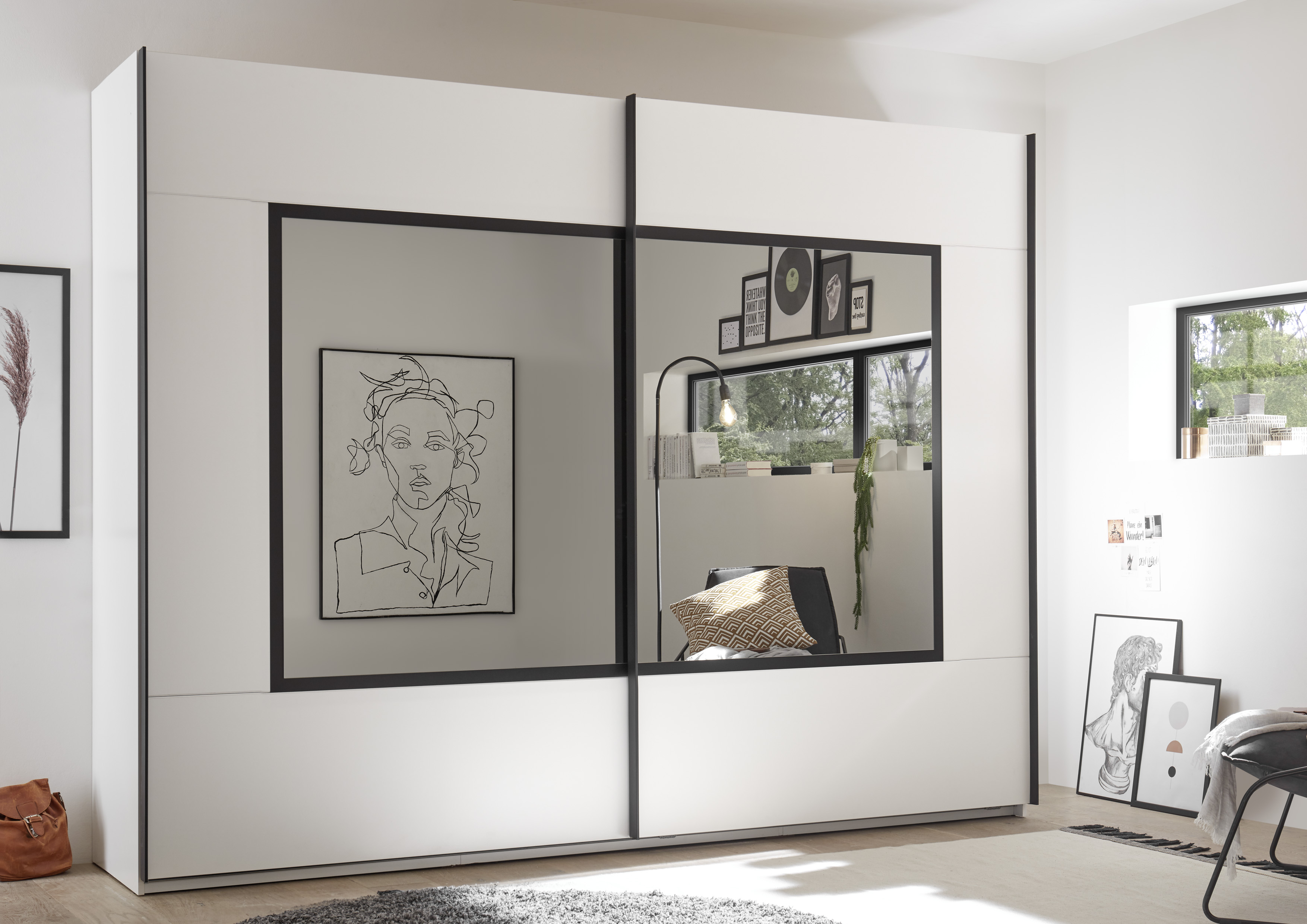 Front: Weiß Holznachbildung kombiniert mit Absetzungen in Schwarz / Spiegel