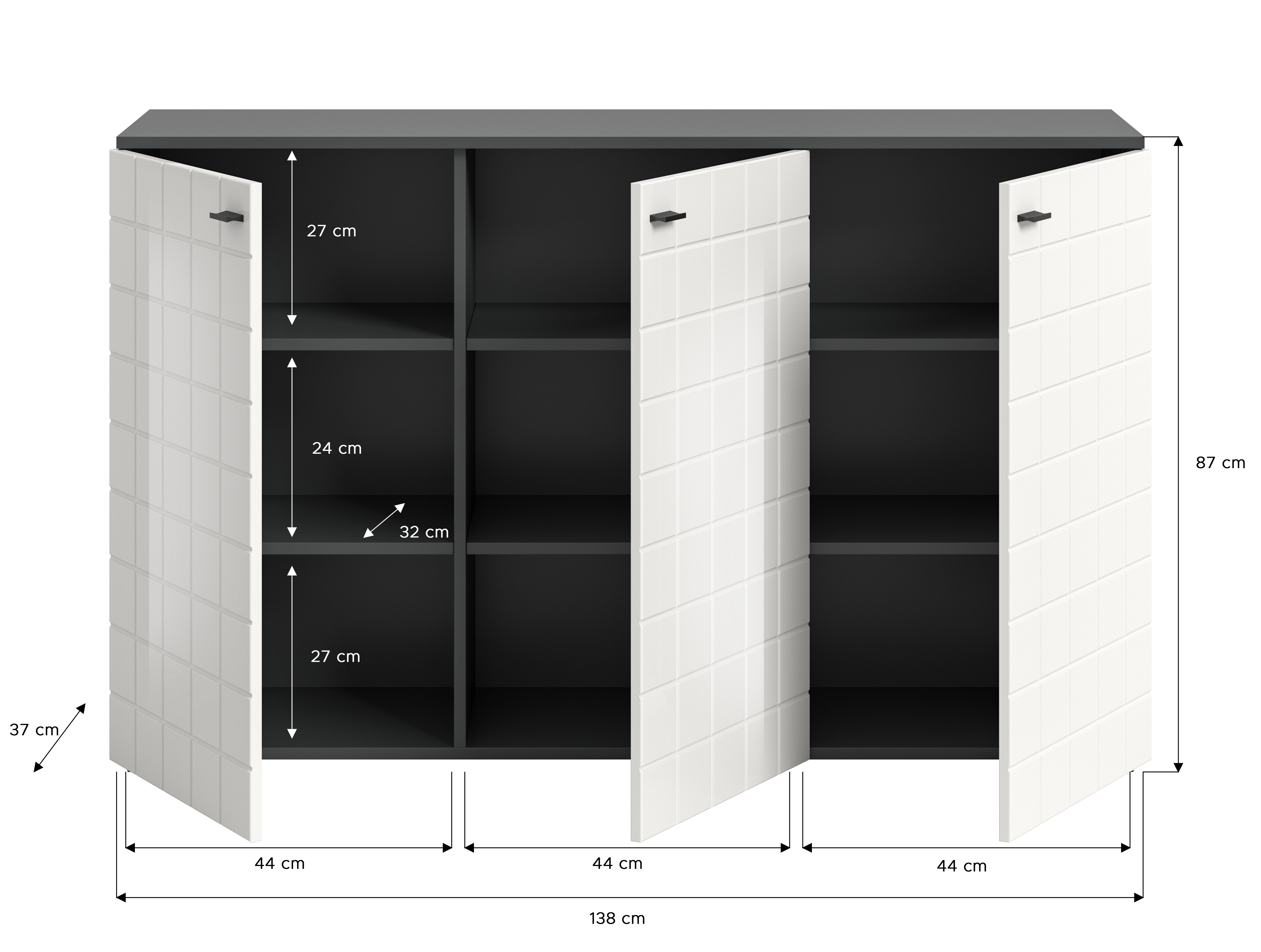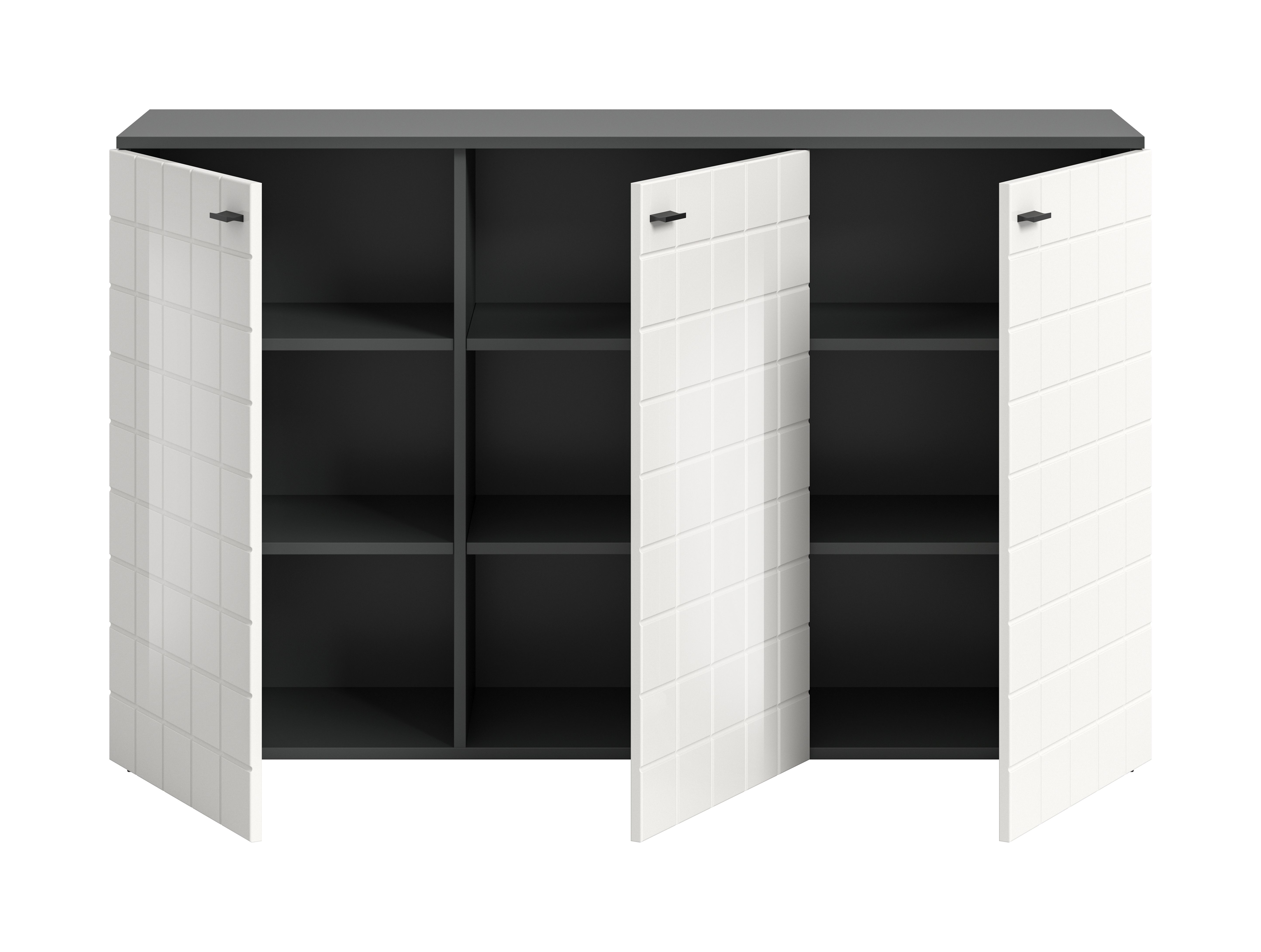 Ein Sideboard mit den Maßen 138x86x37 cm in weißem Hochglanz und anthrazit klingt nach einem eleganten und funktionalen Möbelstück für dein Zuhause. Diese Größe bietet ausreichend Stauraum und die Kombination von weißem Hochglanz MDF und anthrazit Nachbildung verleiht der Kommode ein modernes und stilvolles Aussehen, das zu verschiedenen Einrichtungsstilen passt. Der Hochglanzeffekt kann einen Hauch von Eleganz hinzufügen, während die anthrazitfarbene Nachbildung für Kontrast sorgt.