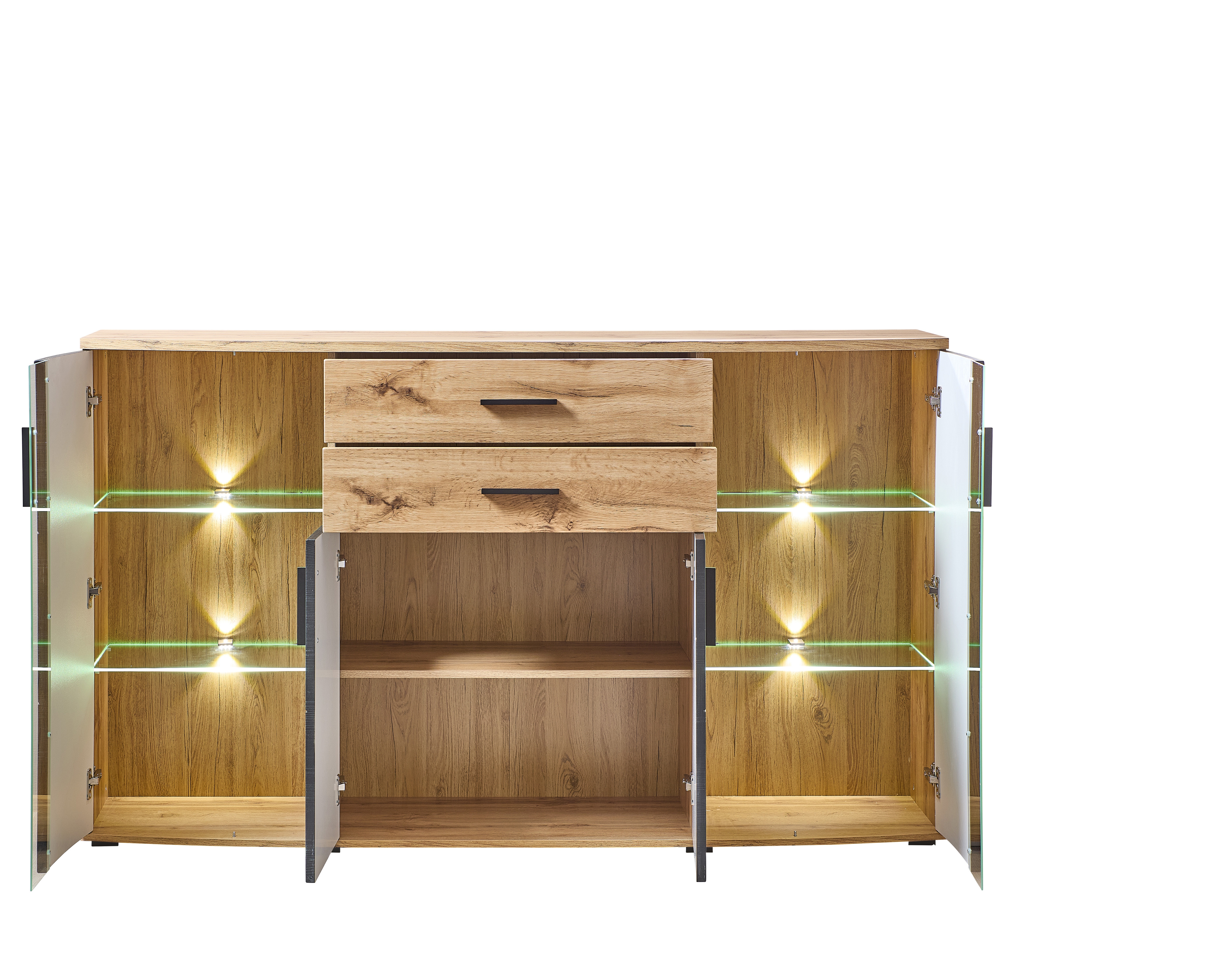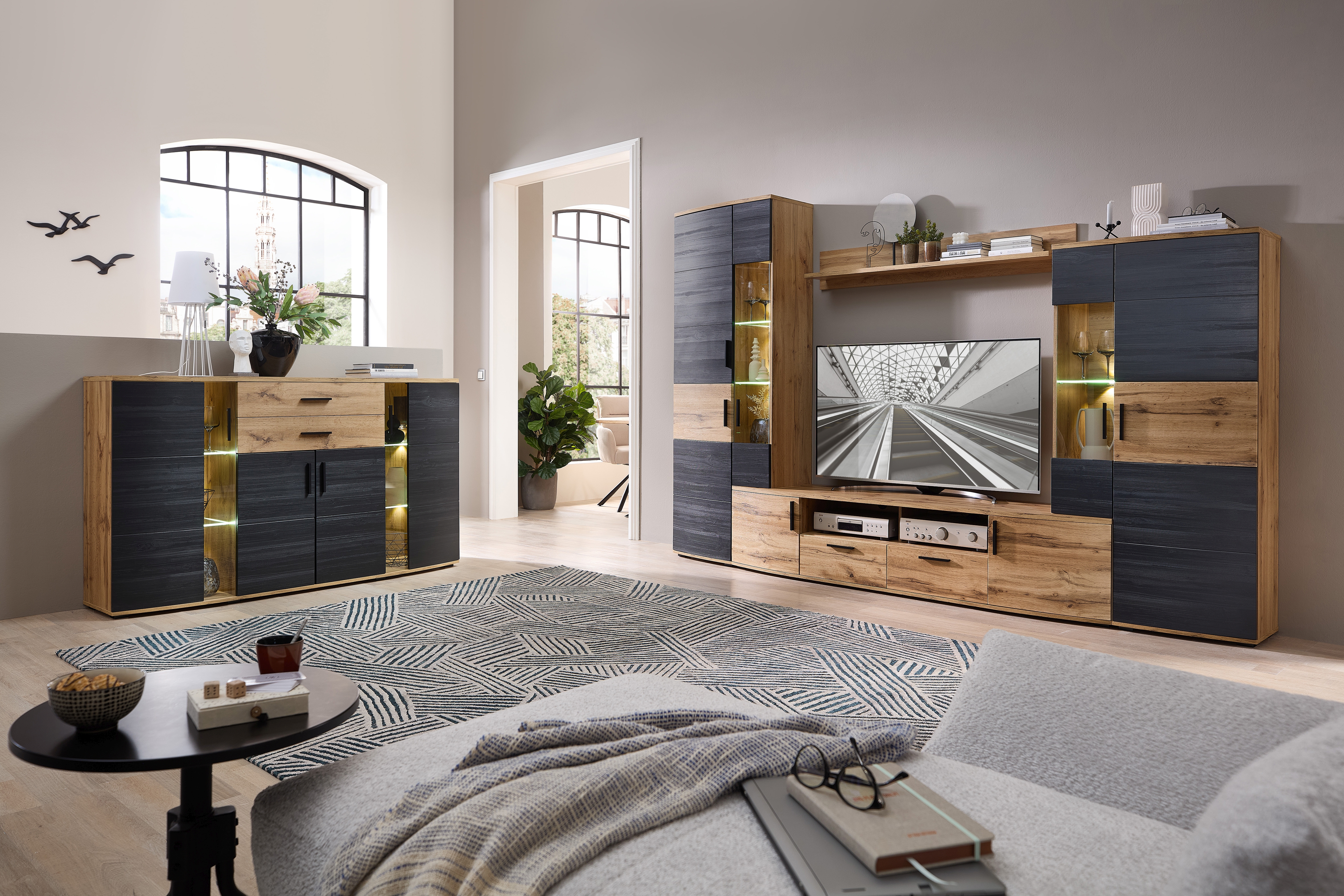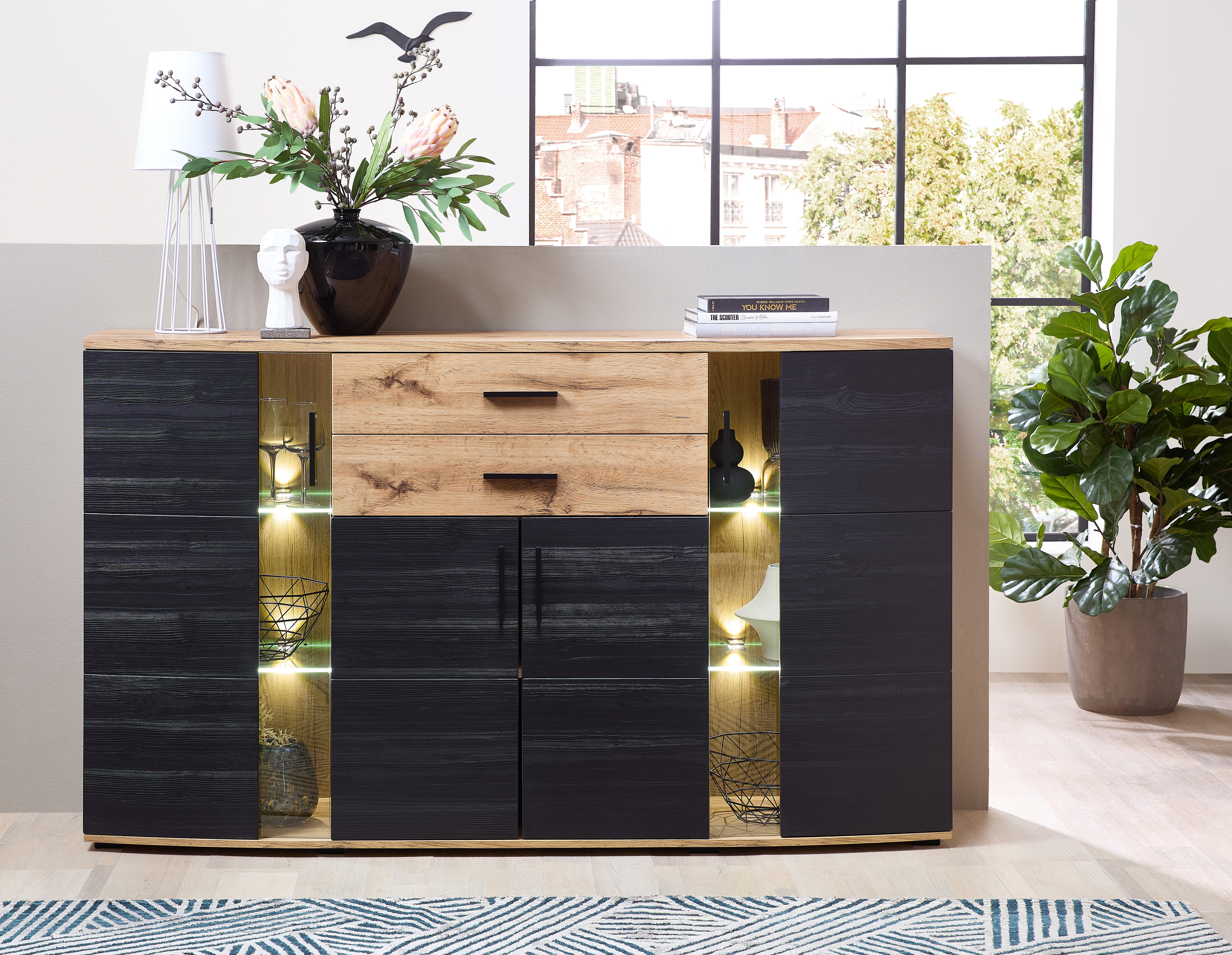 Front: Schwarz Struktur MDF (Mitteldichte Holzfaserplatte) mit Absetzungen in Eiche Altholz MDF / Klarglas