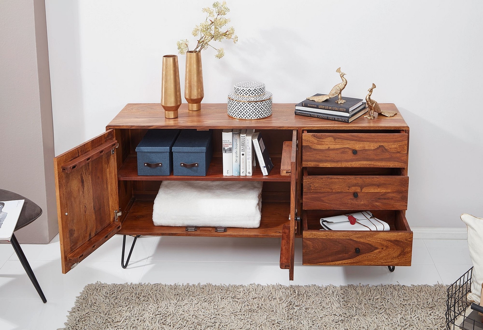 - EXTRAVAGANT ✔ Das massive Sideboard aus dem exotischen Sheeshamholz bringt frischen Wind in Ihre vier Wände. Durch den gekonnten Mix aus robustem Landhausstil und den modernen Designelementen überzeugt die Kommode in Sachen Optik auf ganzer Linie! Insgesamt zwei Türfächer und drei Schubladen bieten zudem den Stauraum, den Sie in Ihrem Zuhause benötigen.