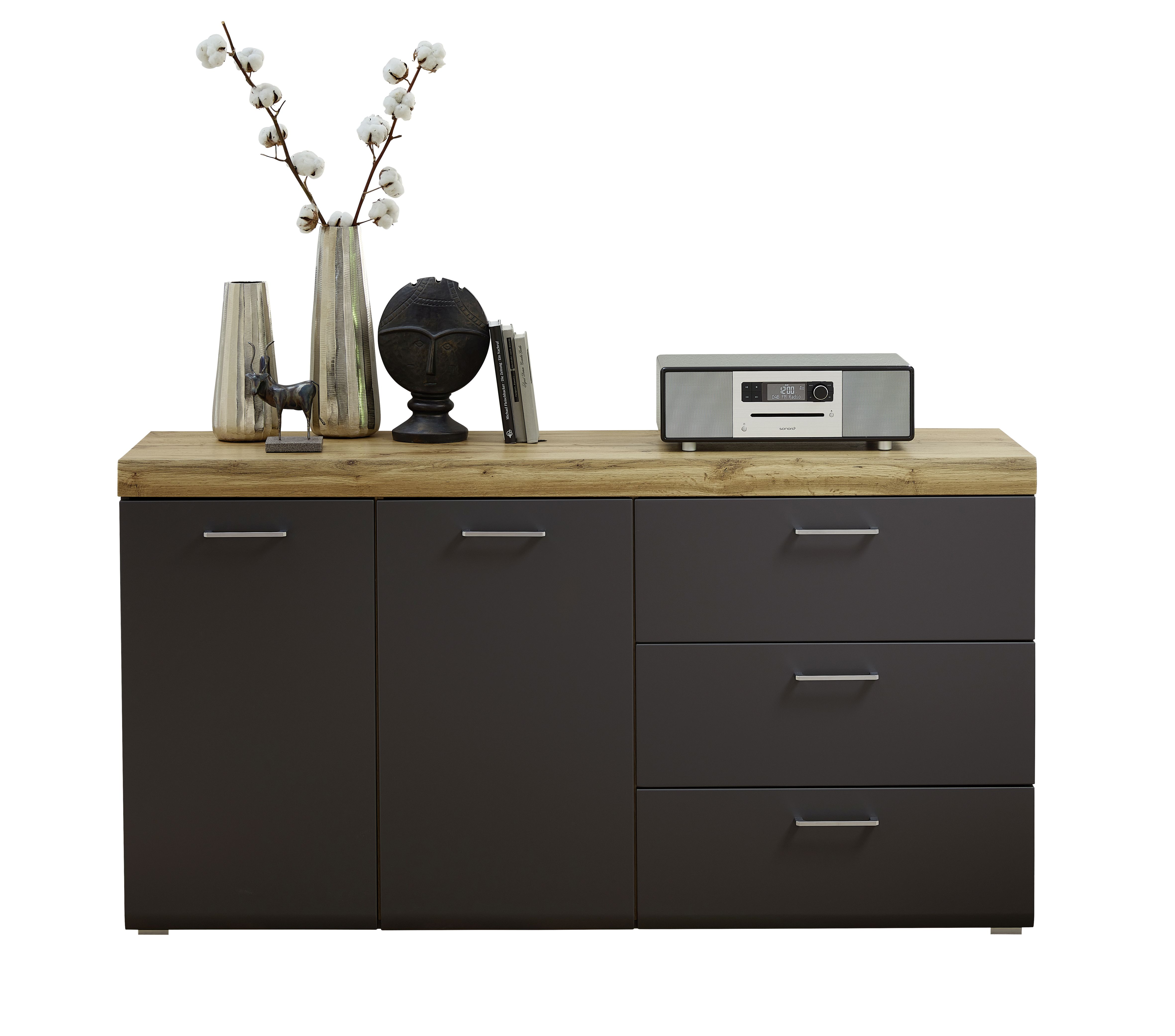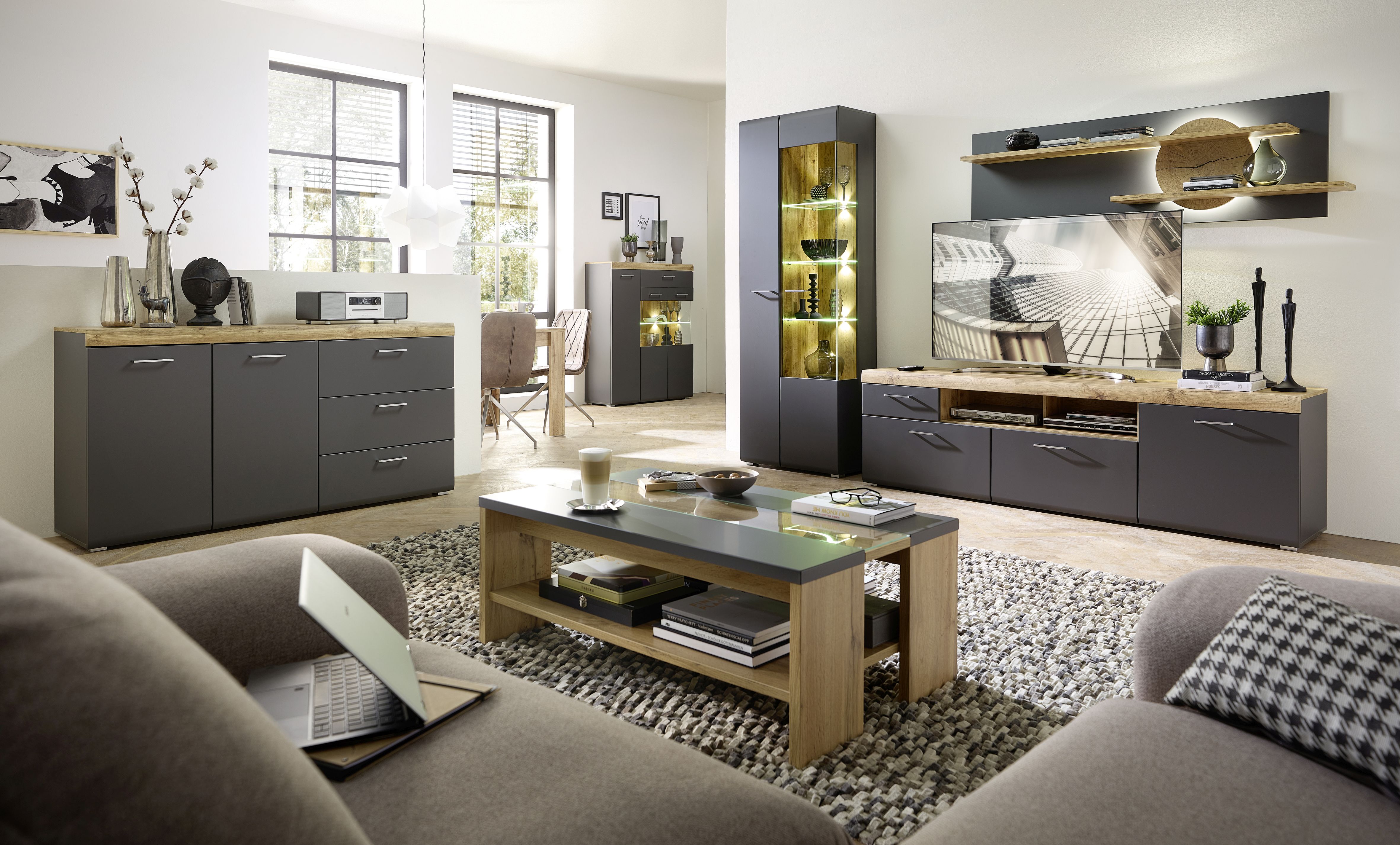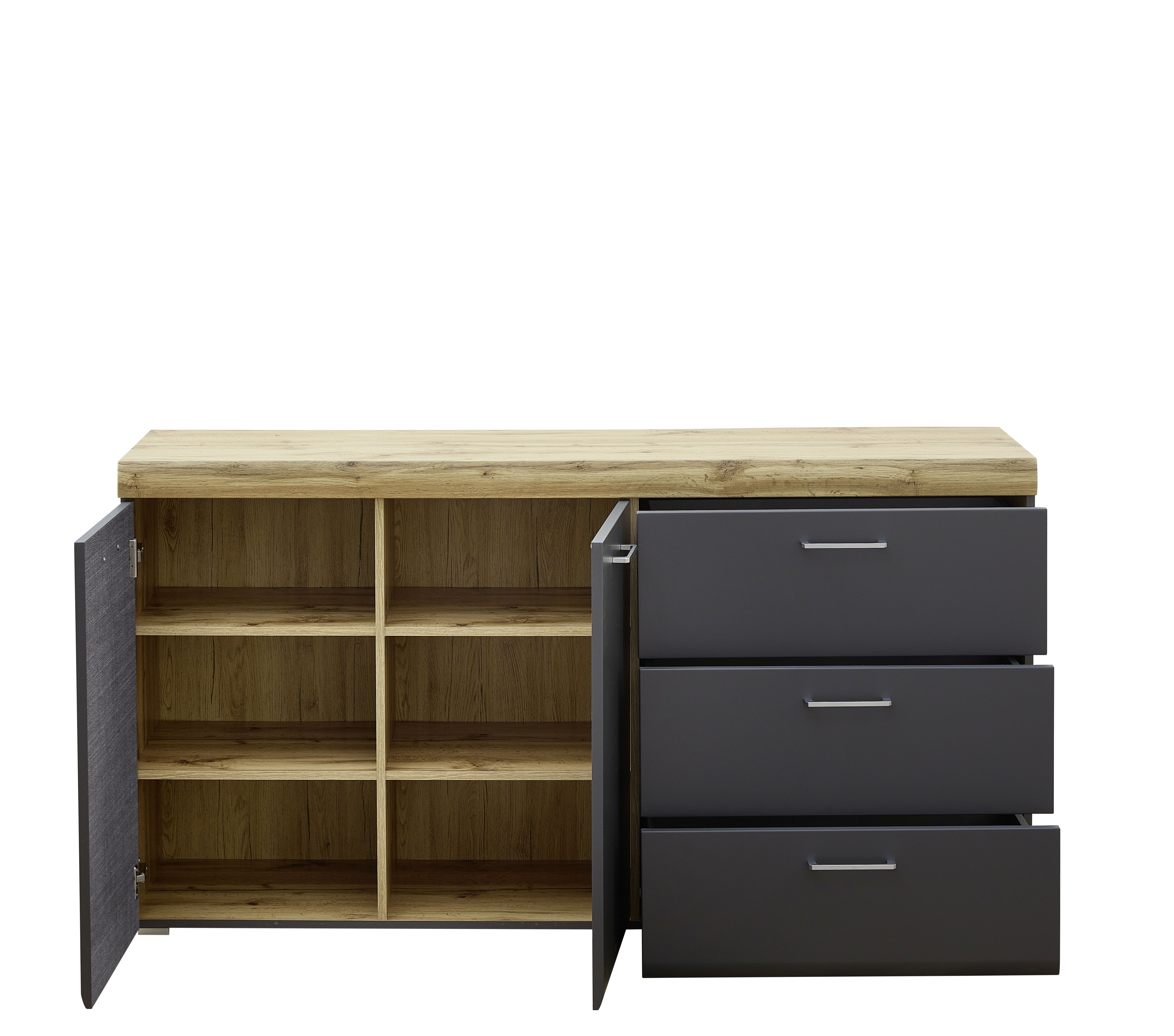 Korpus: außen graphit, innen Eiche Altholz Holznachbildung mit einer Oberplatte in Eiche Altholz Holznachbildung