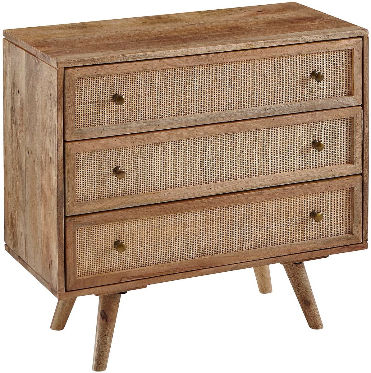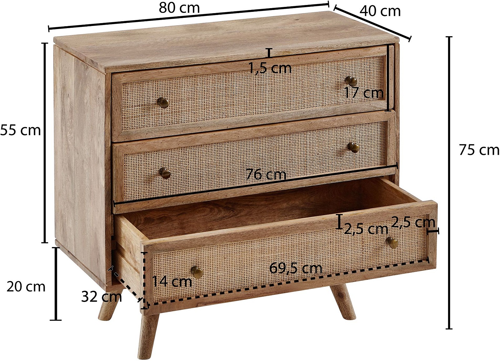 MATERIAL ✔ Der Korpus besteht aus massiven Mangoholz, welches mit schützendem Klarlack beschichtet ist. Die Schubladenfronten ziert ein Geflecht aus Schilfrohr. Lackiertes Eisen bildet das Material der Griffe.