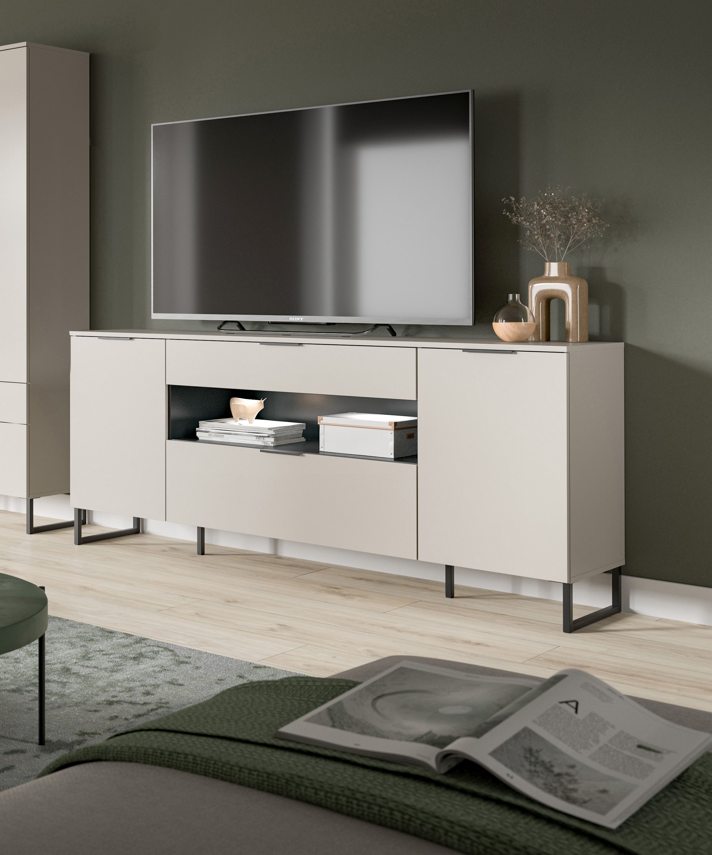 Das Sideboard in Kaschmir Nachbildung (185 x 80 x 41 cm) bietet mit zwei Türen, zwei Einlegeböden, fünf geschlossenen Fächern, einem offenen Fach, einem Schubkasten und einer Klappe viel Stauraum für deine Wohnaccessoires. Die hochwertig verarbeitete, pflegeleichte Oberfläche in trendiger Farbausführung sorgt für eine moderne und elegante Optik. Dieses Sideboard ist ideal, um Ordnung zu schaffen und gleichzeitig stilvolle Akzente in deinem Wohnraum zu setzen. Die Kombination aus Funktionalität und Design macht es zu einem vielseitigen Möbelstück, das sich harmonisch in verschiedene Einrichtungsstile einfügt.