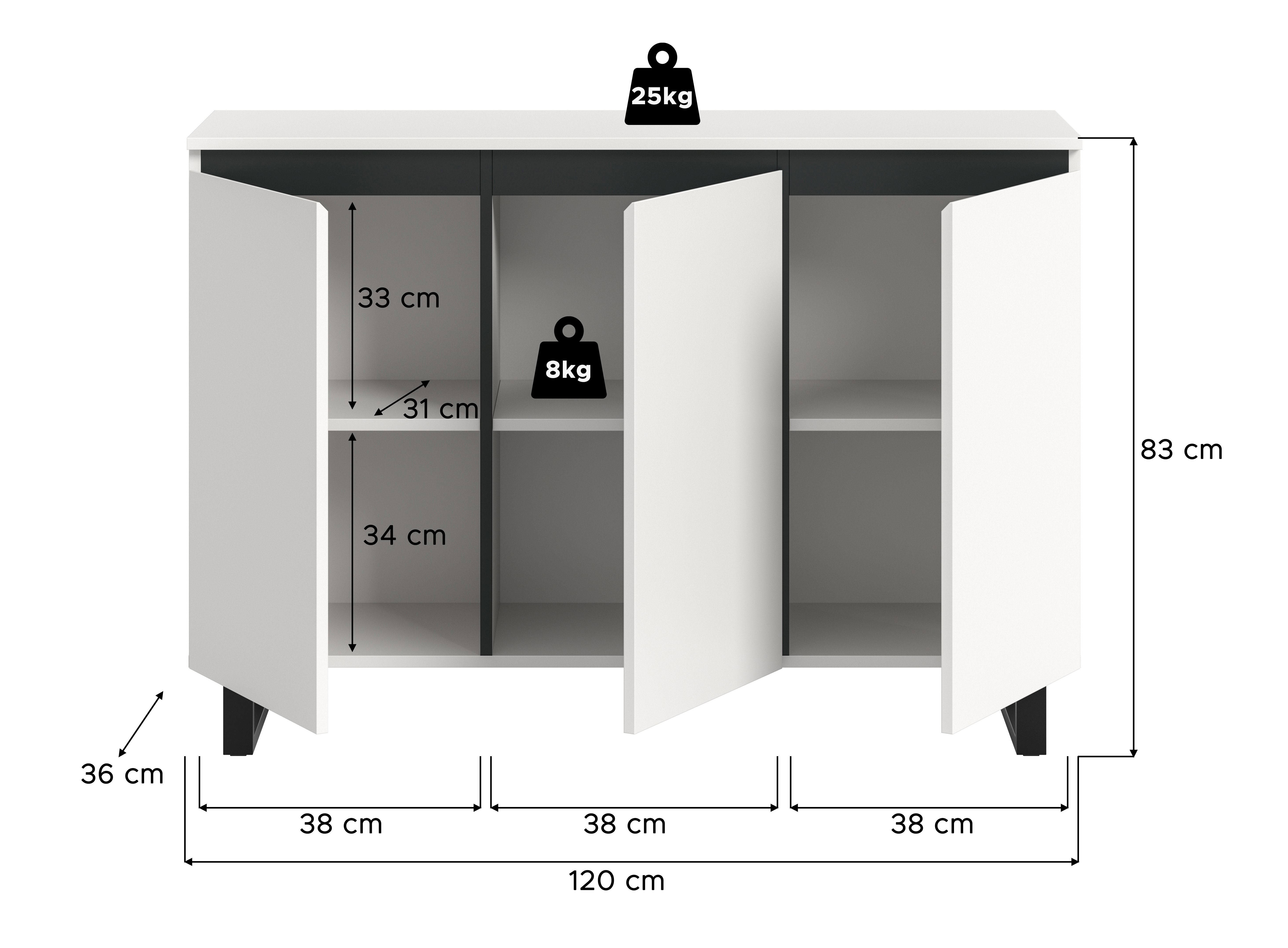 - 3 Türen, 3 höhenverstellbare Einlegeböden, 6 Fächer