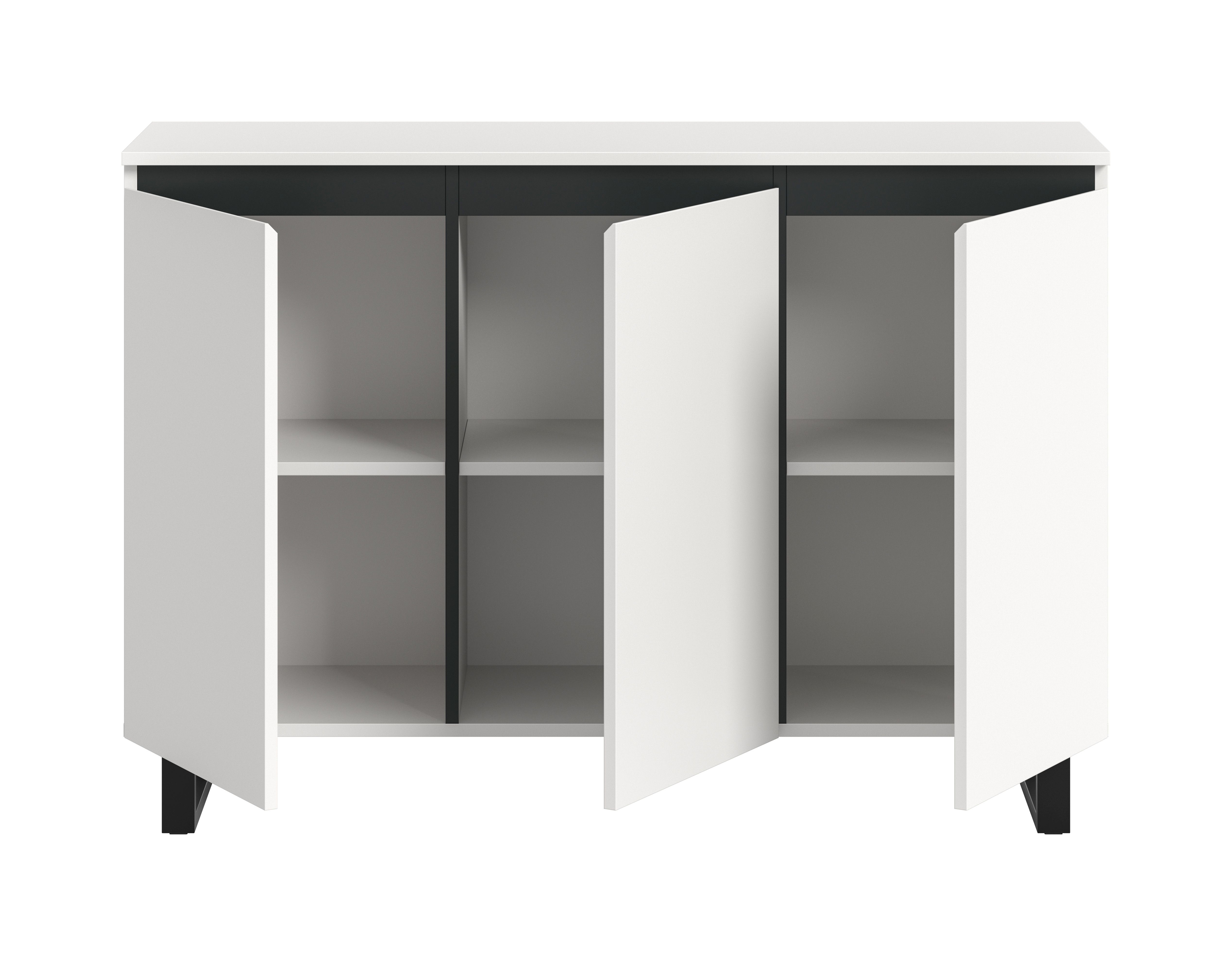 Das Sideboard in Weiß Melamin (120 x 84 x 36 cm) bietet mit drei Türen, drei höhenverstellbaren Einlegeböden und sechs Fächern großzügigen Stauraum für deine Wohnräume. Die hochwertig verarbeitete, pflegeleichte Oberfläche mit abgesetzer schwarzer Schattenfuge sorgt für eine moderne und elegante Optik. Dieses Möbelstück ist ideal, um Ordnung zu schaffen und gleichzeitig stilvolle Akzente zu setzen. Die robuste Konstruktion garantiert Langlebigkeit und Stabilität. Das Sideboard lässt sich vielseitig kombinieren und ist eine perfekte Ergänzung für Wohnzimmer, Esszimmer oder Flur. Mit diesem Sideboard schaffst du ein harmonisches und funktionales Zuhause.