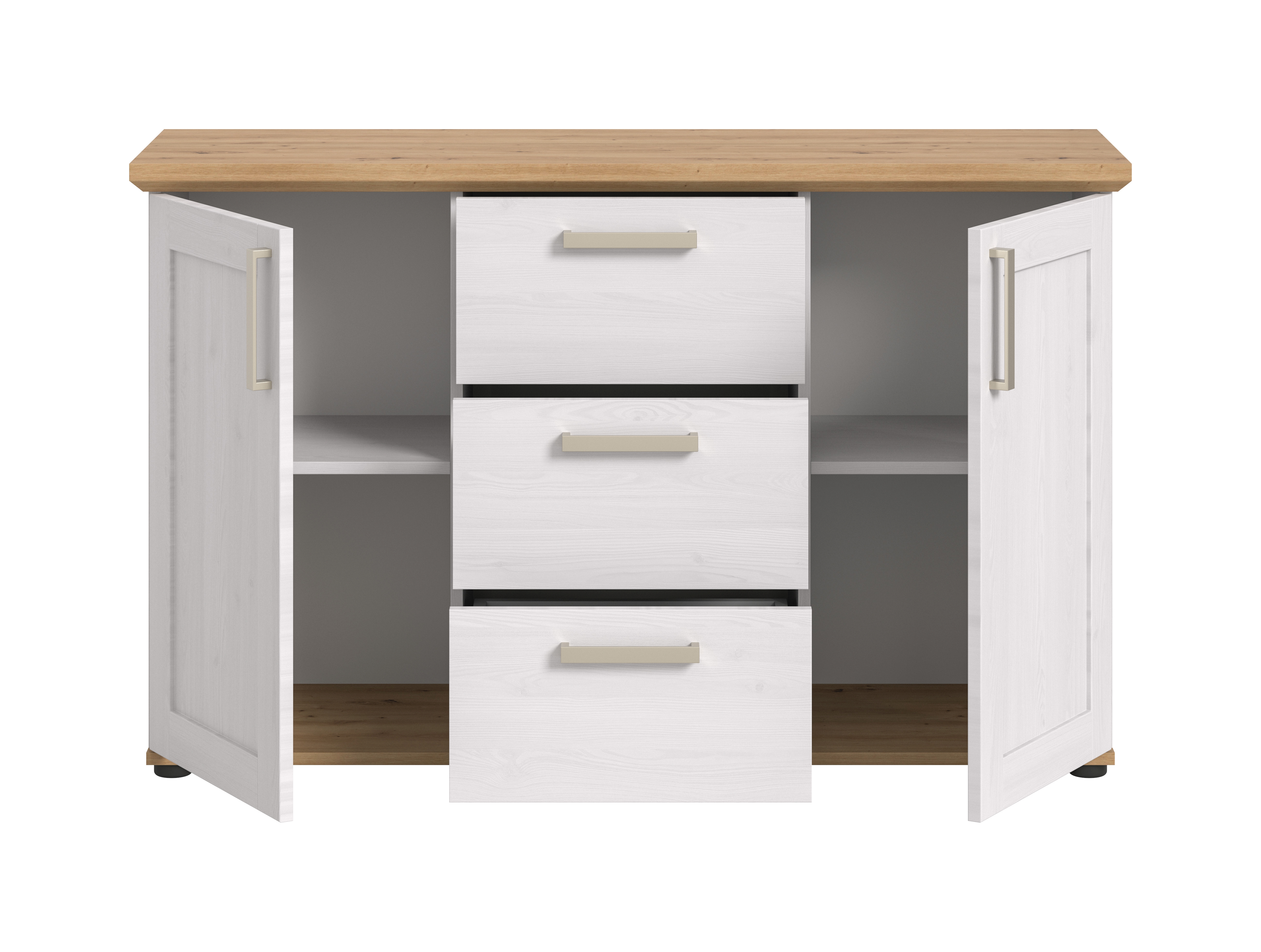 Schaffen Sie Ordnung und Stil mit unserem modernen Sideboard im charmanten Landhaus-Look! Mit zwei Türen, zwei herausnehmbaren und höhenverstellbaren Einlegeböden, drei schmalen Schubkästen sowie vier Fächern bietet dieses Möbelstück viel Stauraum. Der farblich abgesetzte Ober- und Unterboden verleiht dem Sideboard eine ansprechende Optik, die perfekt in jedes Zuhause passt.