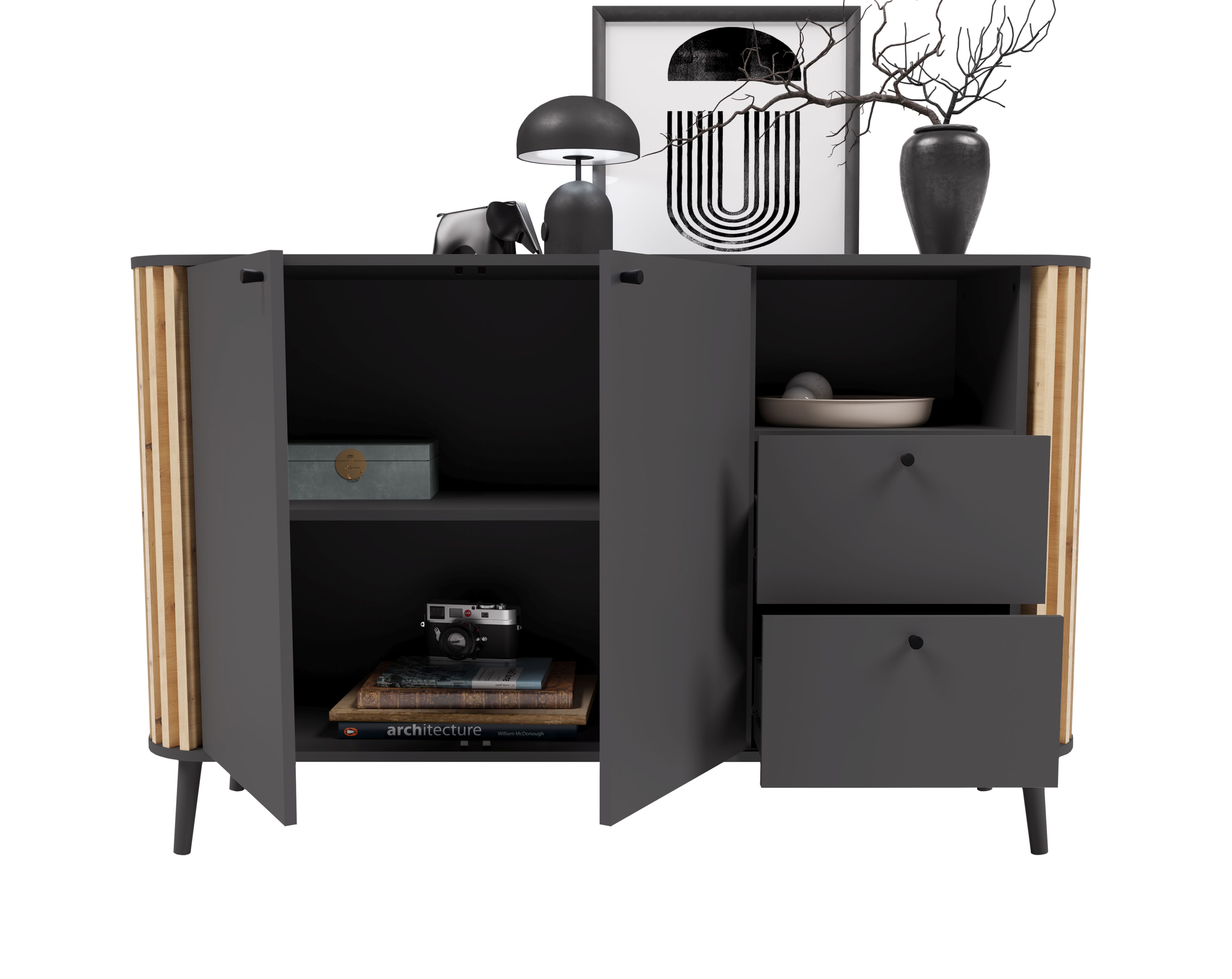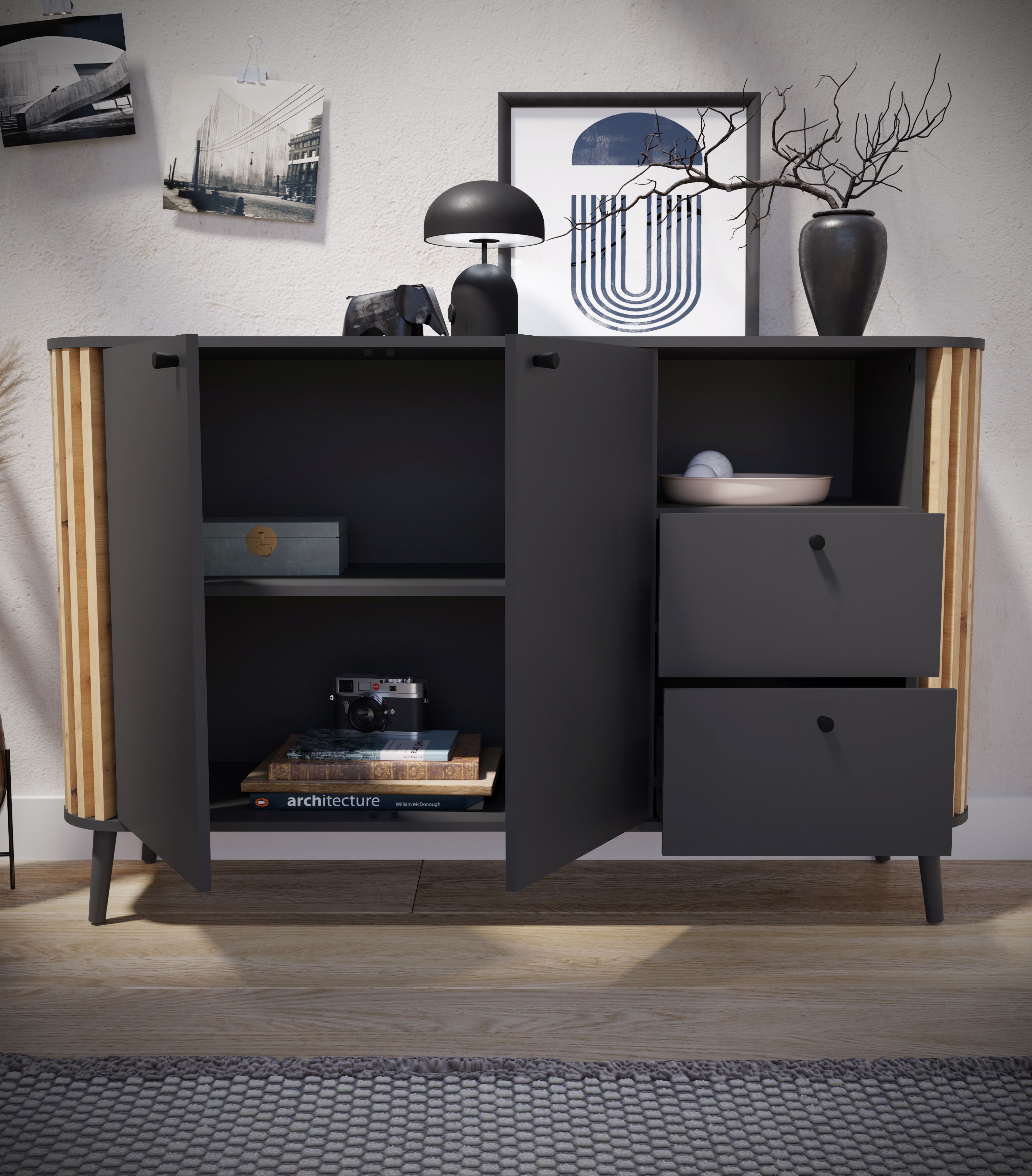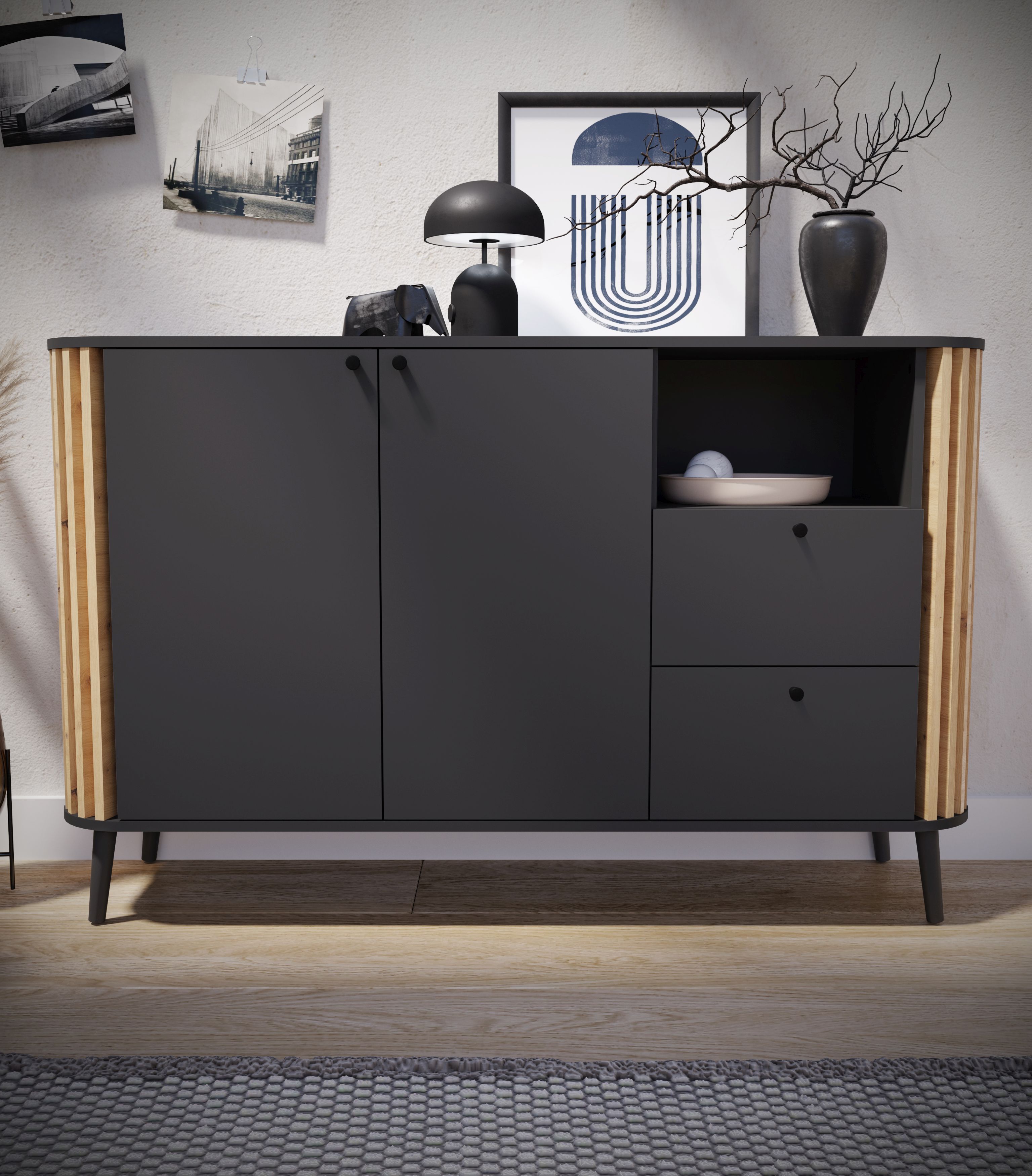 Entdecken Sie unser großzügiges Sideboard in moderner grauer Nachbildung – perfekt für Schlafzimmer, Jugendzimmer oder Gästezimmer. Sie bietet nicht nur reichlich Stauraum für Kleidung und Accessoires, sondern verleiht Ihrem Raum auch eine stilvolle Note. Entscheiden Sie sich für dieses vielseitige Sideboard, um Ihre Wohnräume funktional und ästhetisch zu gestalten.