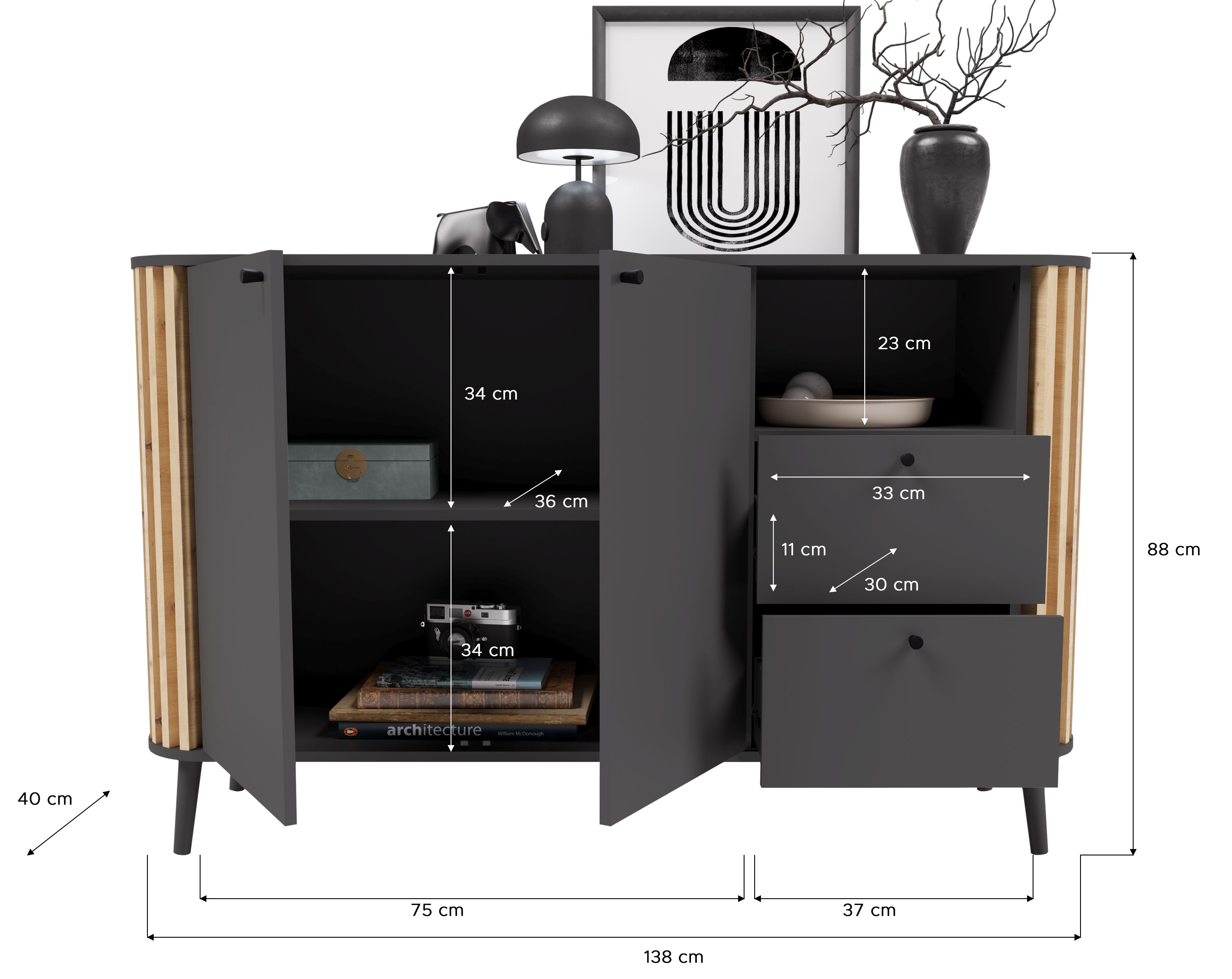- Einsatzbereich: Vielseitig einsetzbar in Wohnzimmer, Esszimmer, Flur, Arbeitszimmer, Jugendzimmer, Studio, Büro oder Appartement, bietet das Sideboard eine praktische Aufbewahrungslösung und dient als dekoratives Element, um Ordnung und Stil in Ihrem Zuhause zu schaffen.