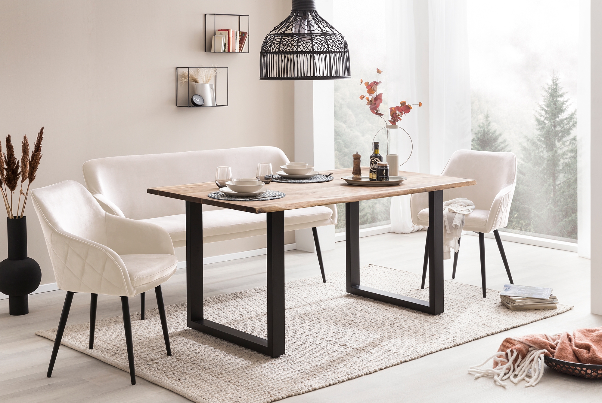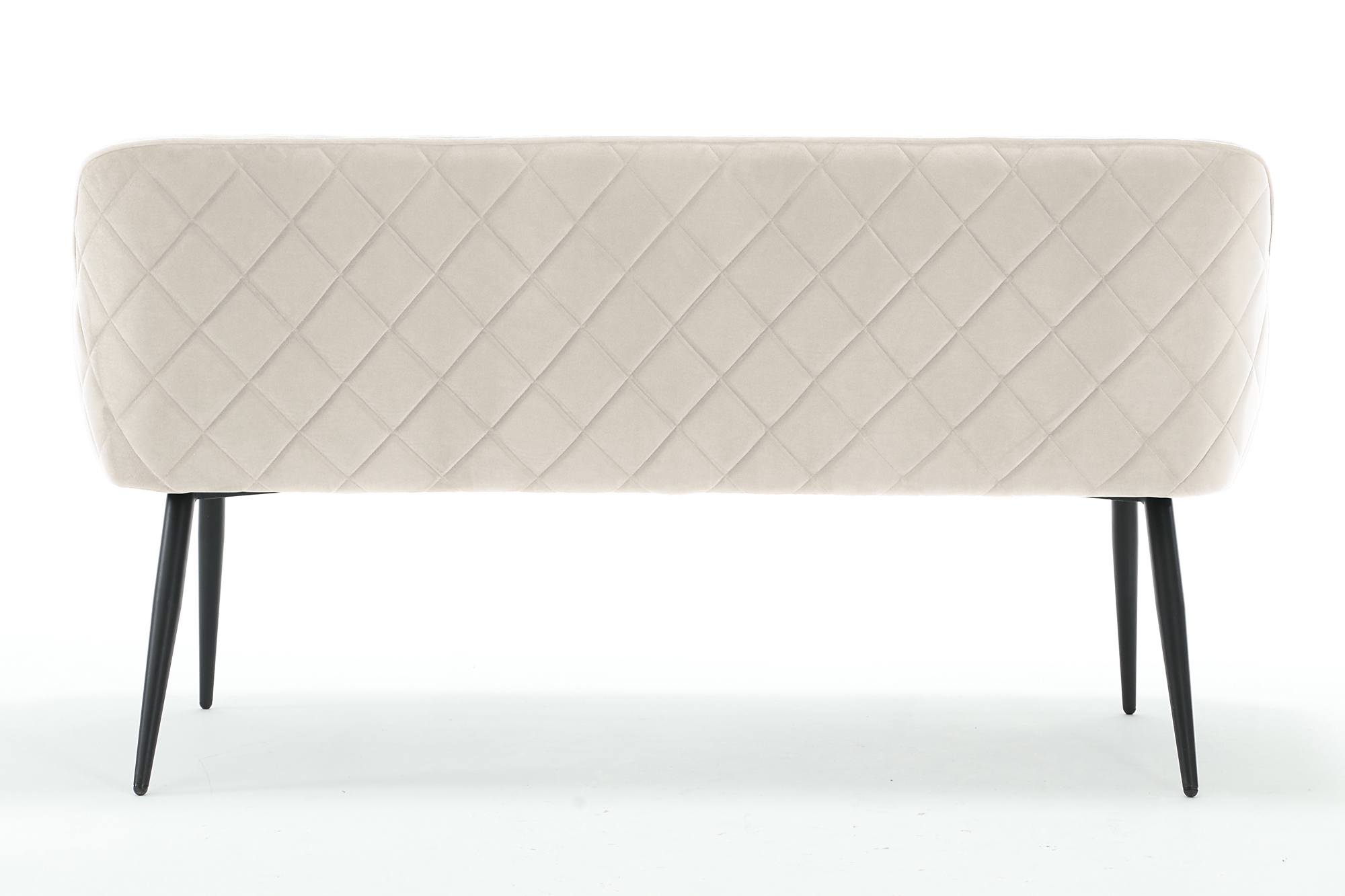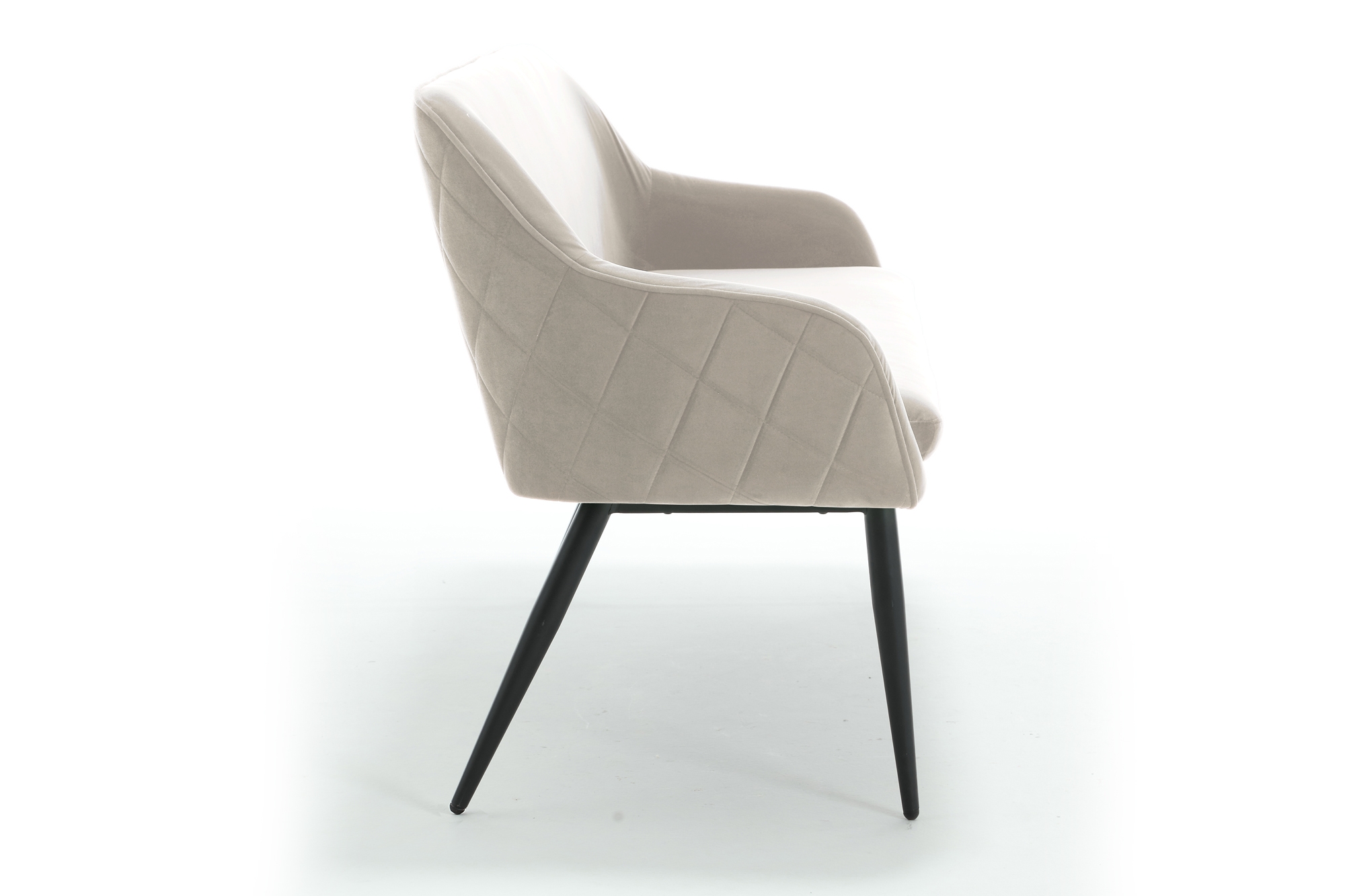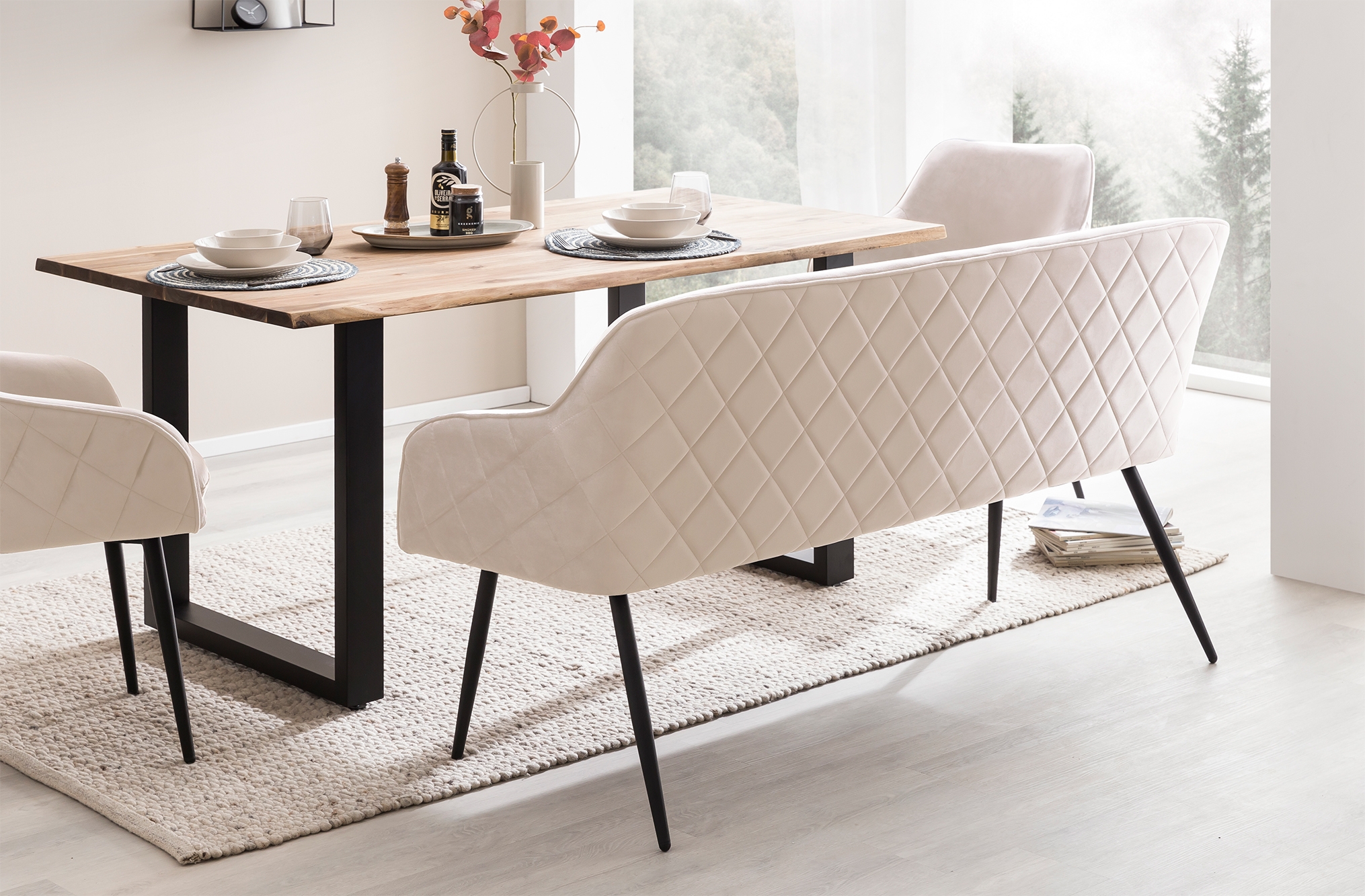 Wer eine außergewöhnliche Einrichtung für das Esszimmer sucht, trifft mit dieser modernen Polsterbank im edlen Samt-Look die richtige Wahl. Eingesetzt als Esszimmerbank bietet die Bank viel Platz und wird zum optischen Highlight. Ein besonderes Detail ist die Rückenlehne mit Diamant-Steppung. In Kombination mit dem glamourös schimmernden Samtbezug, entsteht so ein luxuriöses Gesamtbild. Die hohen, gepolsterten Armlehnen sorgen für optimalen Sitzkomfort. Doch auch im Wohn- oder Gästezimmer findet die Polsterbank garantiert einen nützlichen Platz. Dem Einsatzbereich des Sitzmöbels sind hier keine Grenzen gesetzt. Besonderer Clou: Die passenden Stühle im dazugehörigen Design sind ebenfalls im Sortiment erhältlich. So können Sie ein harmonisches Design-Ensemble zusammenstellen, oder aber die Polsterbank als Einzelstück glänzen lassen.