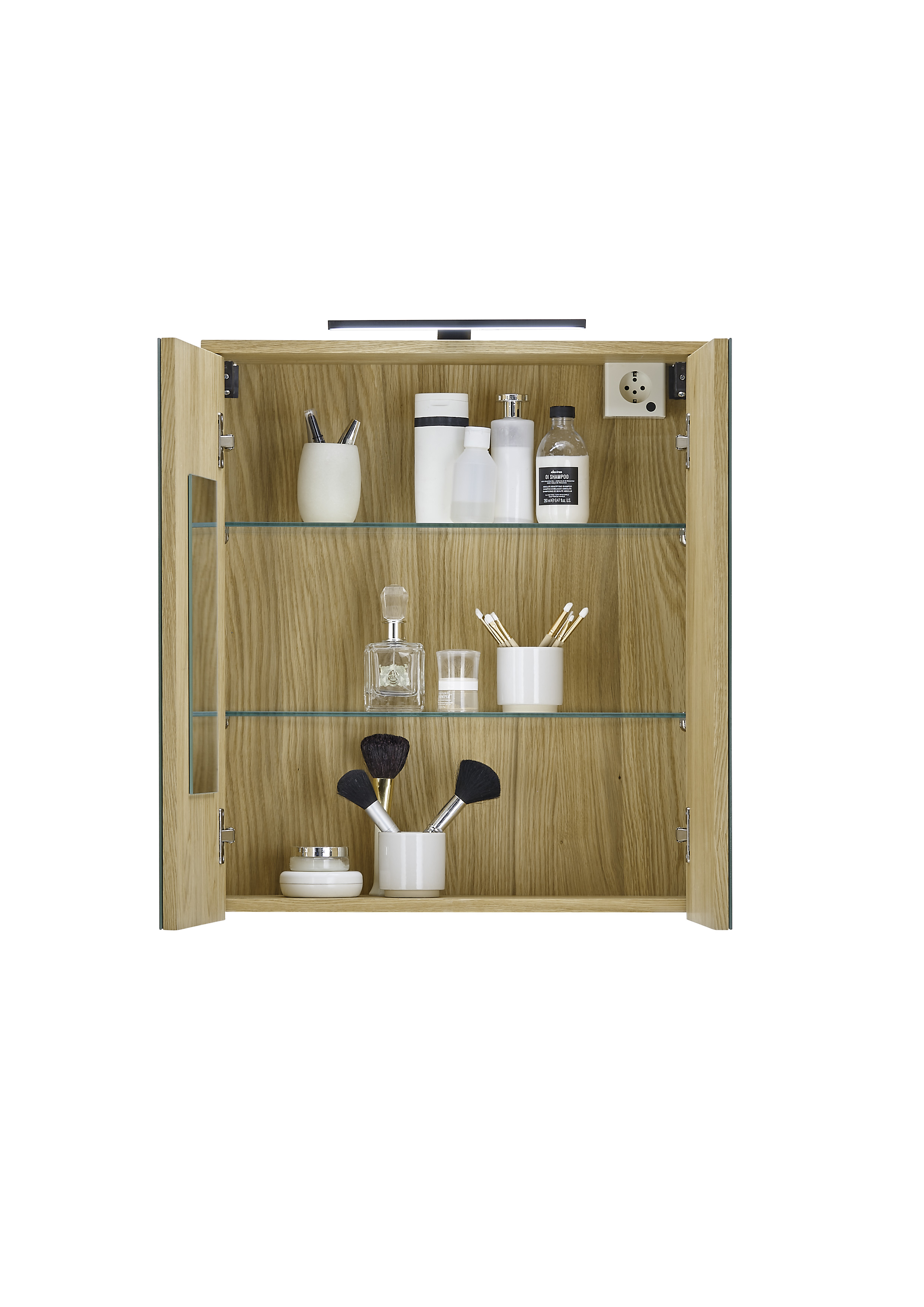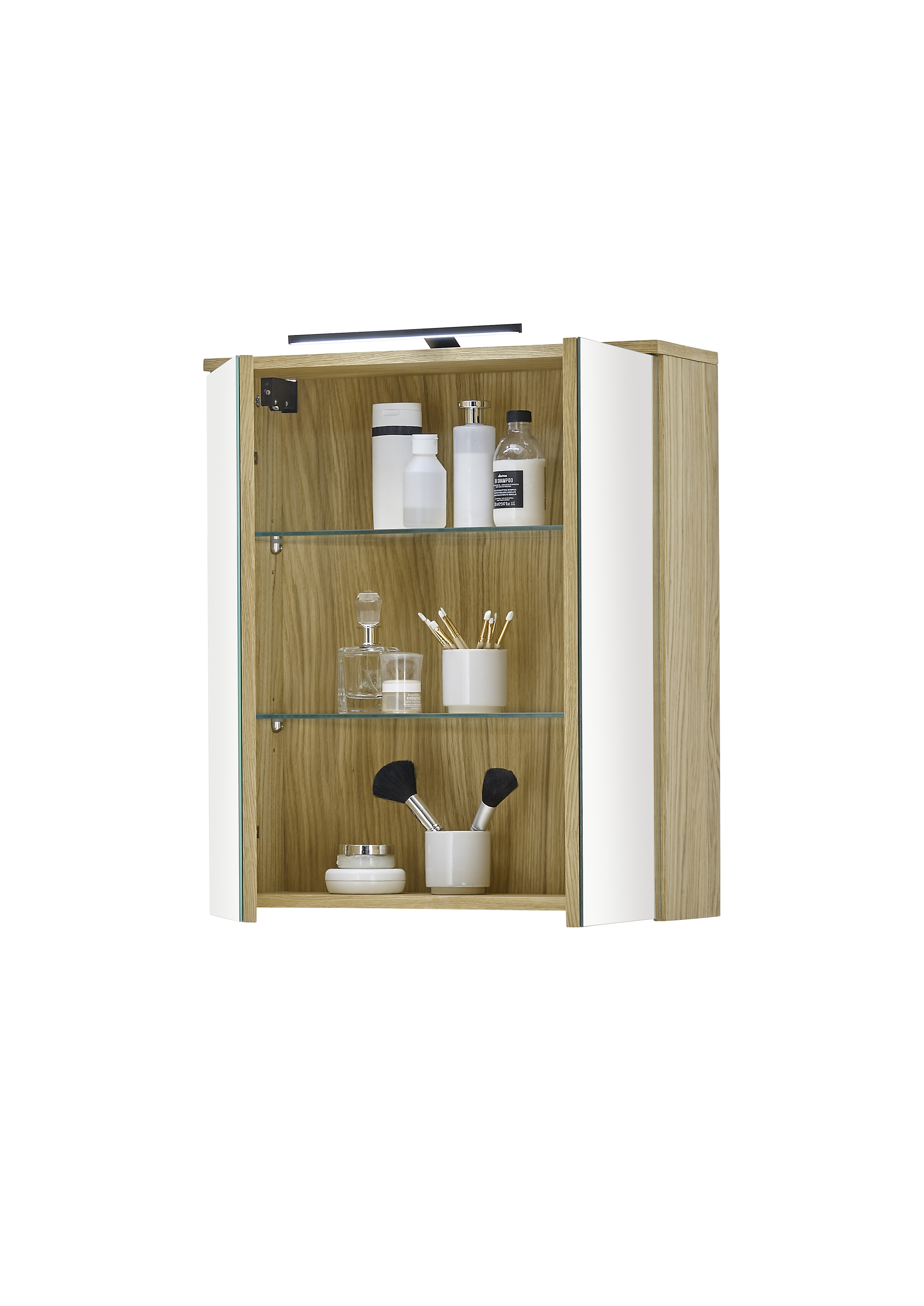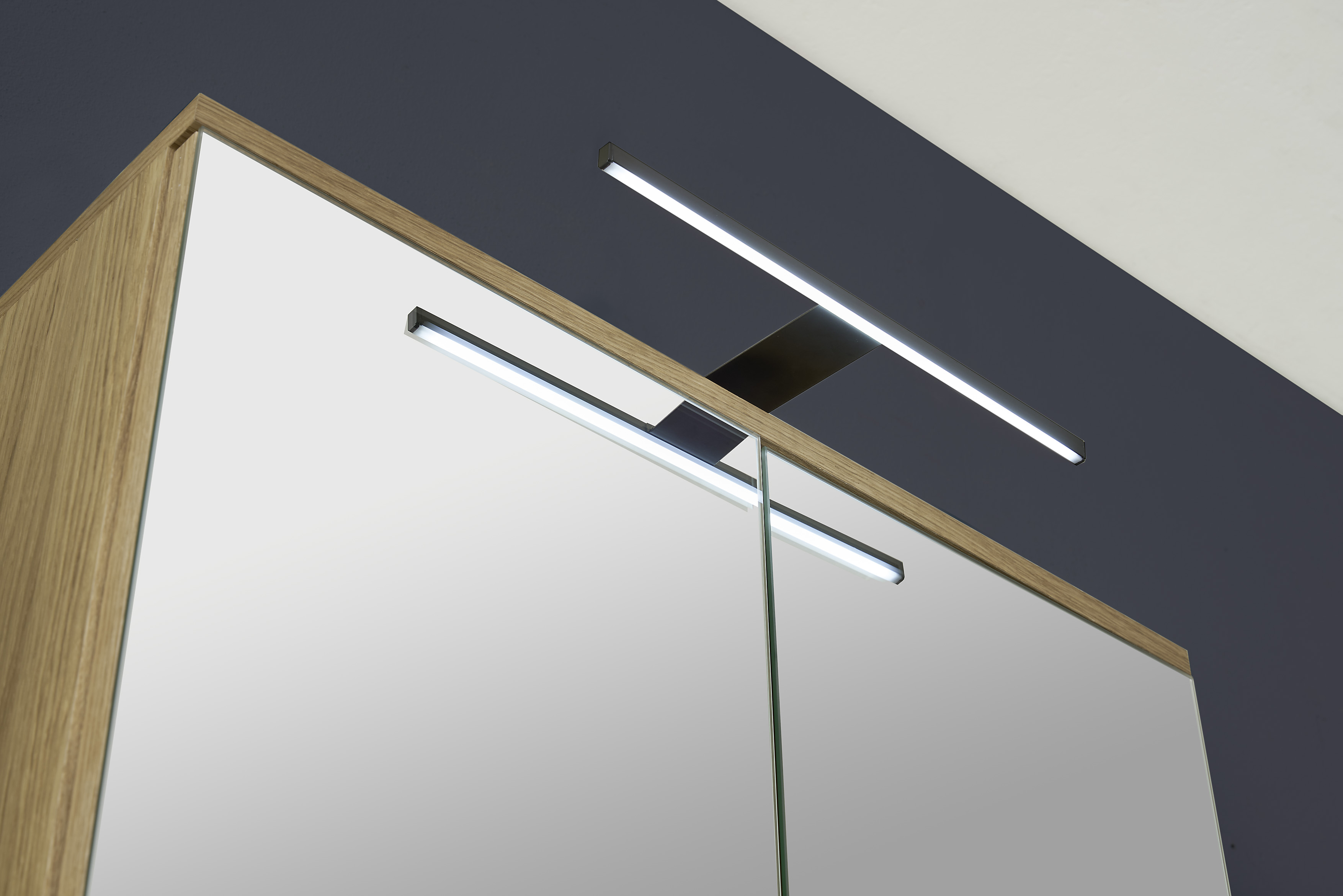 Die integrierte LED-Beleuchtung sorgt für eine gleichmäßige, angenehme Ausleuchtung und unterstützt optimale Lichtverhältnisse am Waschplatz. Der Spiegelschrank bietet stilvollen Stauraum und fügt sich harmonisch in moderne Badkonzepte ein.
