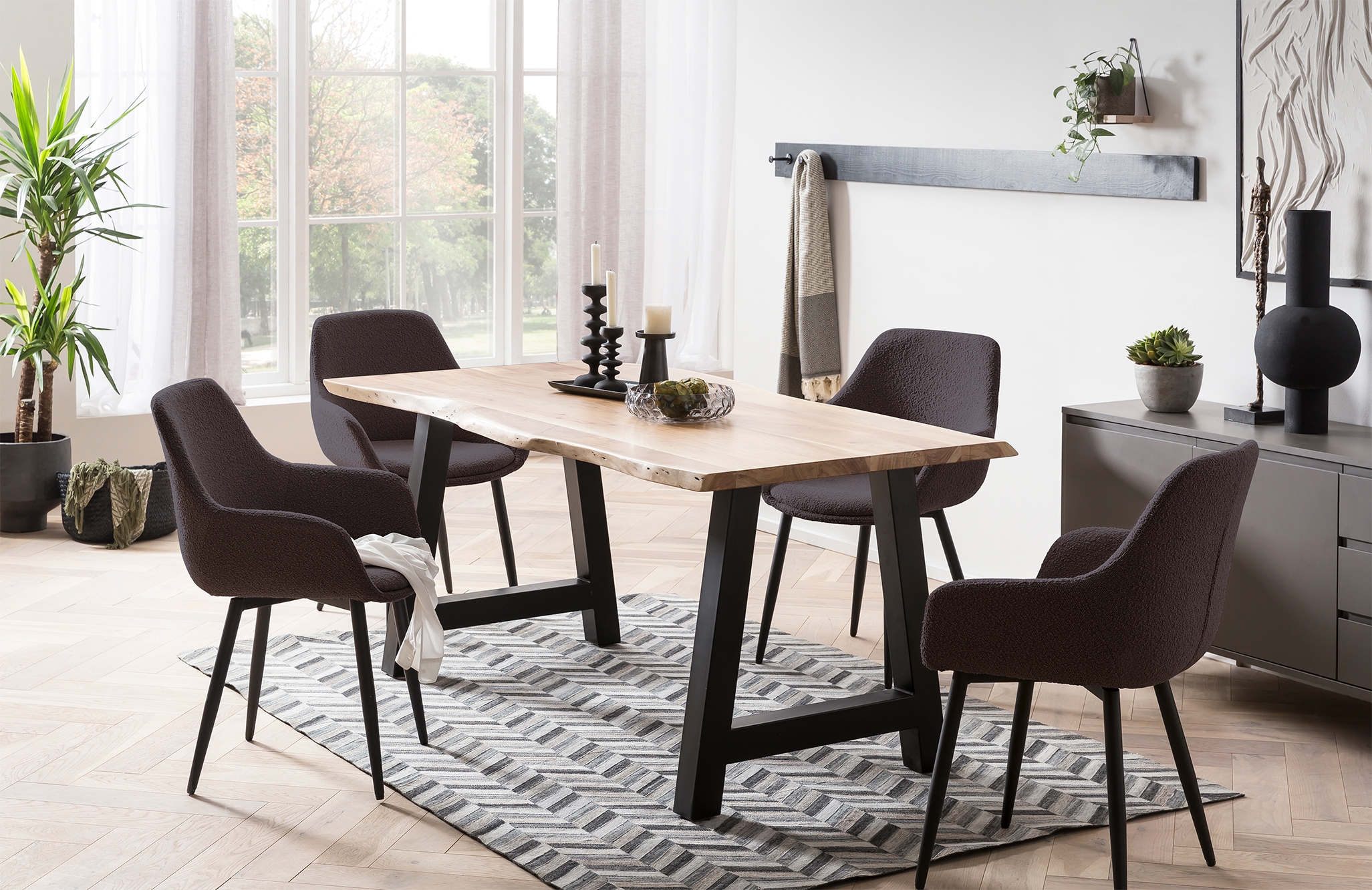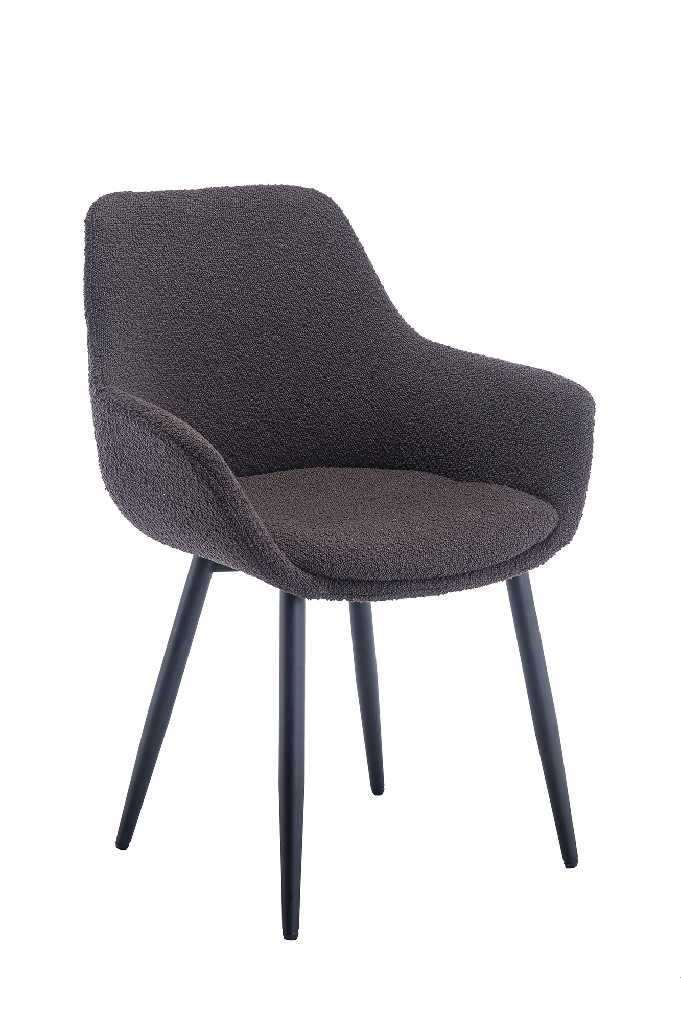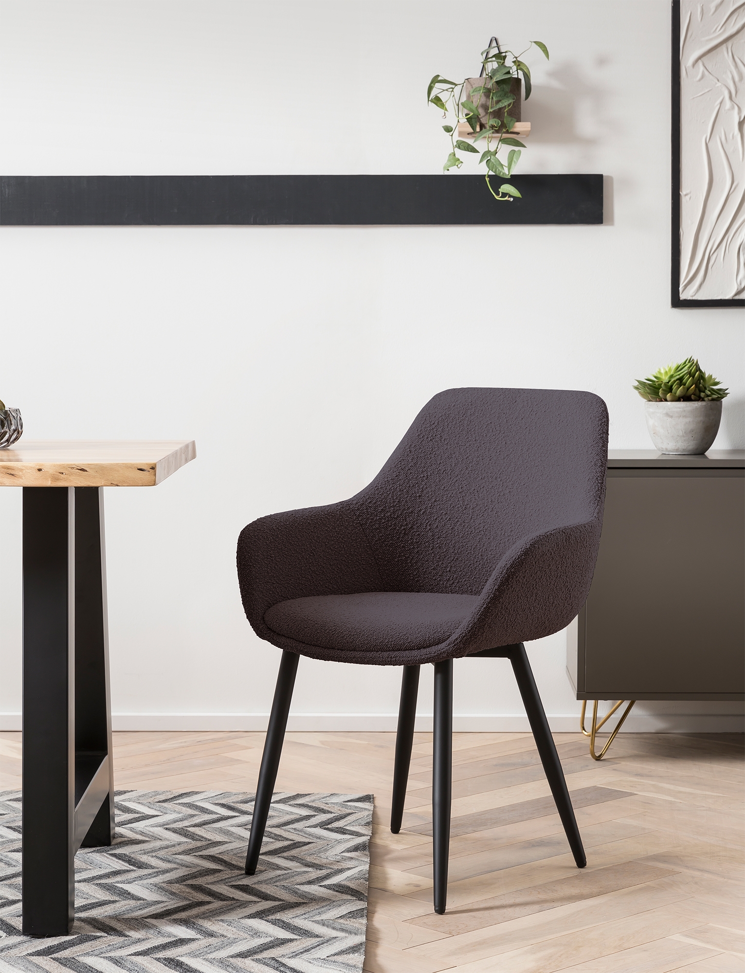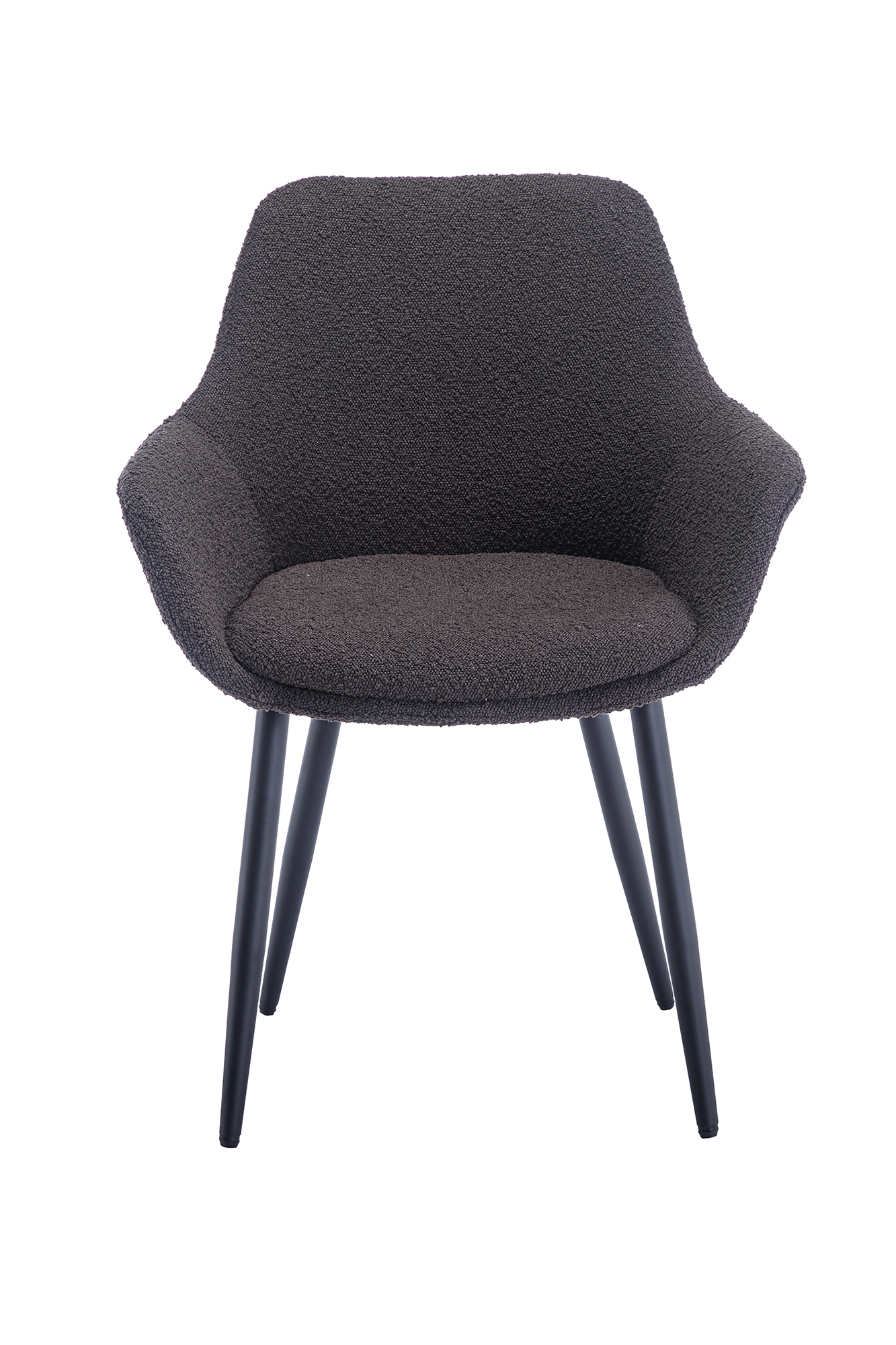 Der moderne Armlehnstuhl im 2er Set überzeugt mit seinem Texturstoff in Bouclé-Optik. Das robuste 4 Fuß Gestell aus pulverbeschichtetem Metall in matt schwarz gewährleistet einen sicheren Stand und bietet einen großartigen Kontrast zum Bezug des Stuhles. Durch die abgerundete Rückenfläche und die angenehme Polsterung entsteht ein Sitzkomfort der Extraklasse. Ein optisches Highlight sind die ausgestellten Armlehnen. Durch das stylische Design können die Stühle im Essbereich, als Sitzgelegenheit im Wartebereich oder in einem Konferenzraum eingesetzt werden. Aber auch als Einzelstuhl wird dieses Möbel zum echten Hingucker. Sie und Ihre Gäste werden Ihre neue Sitzgelegenheit lieben.