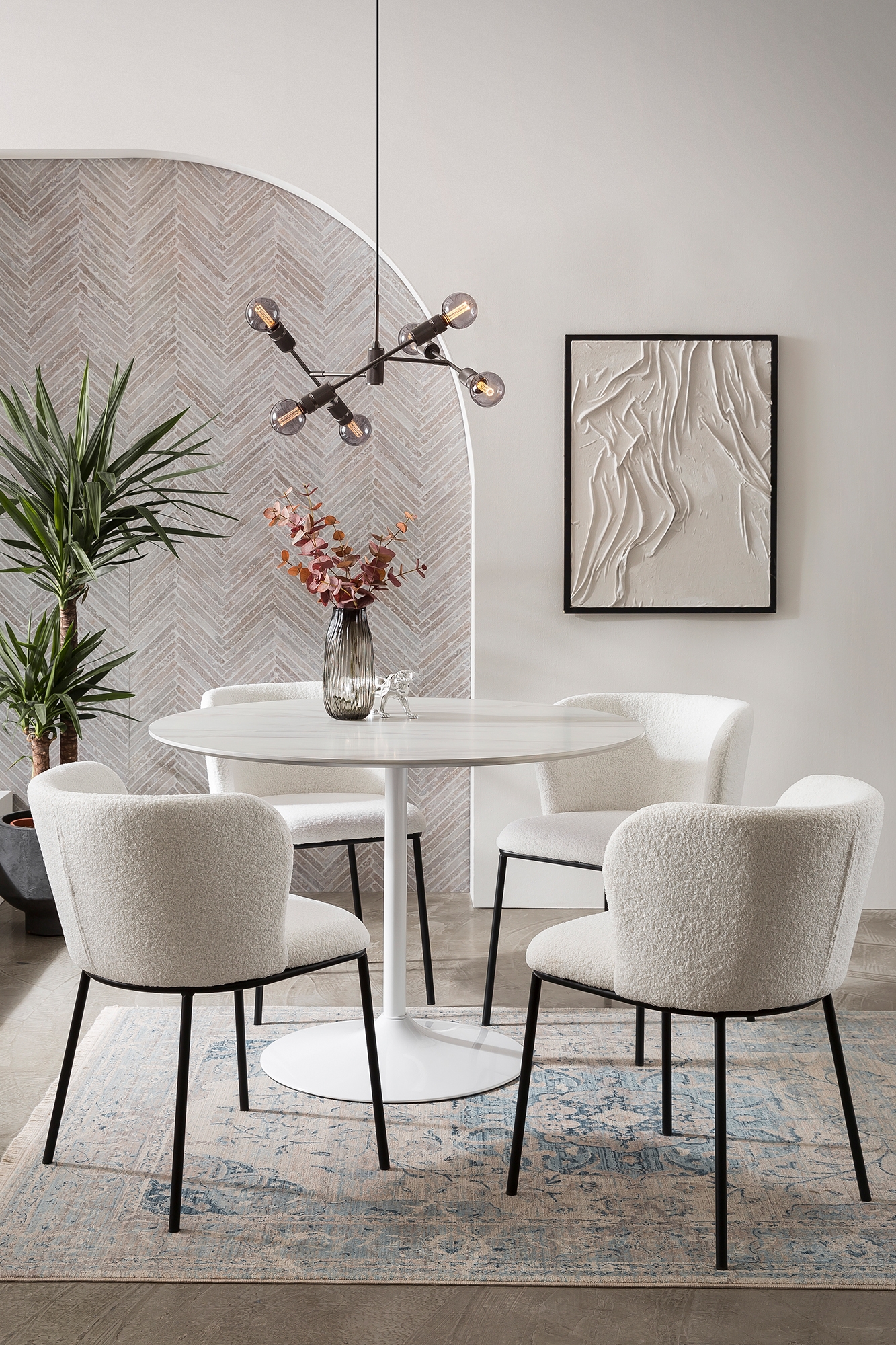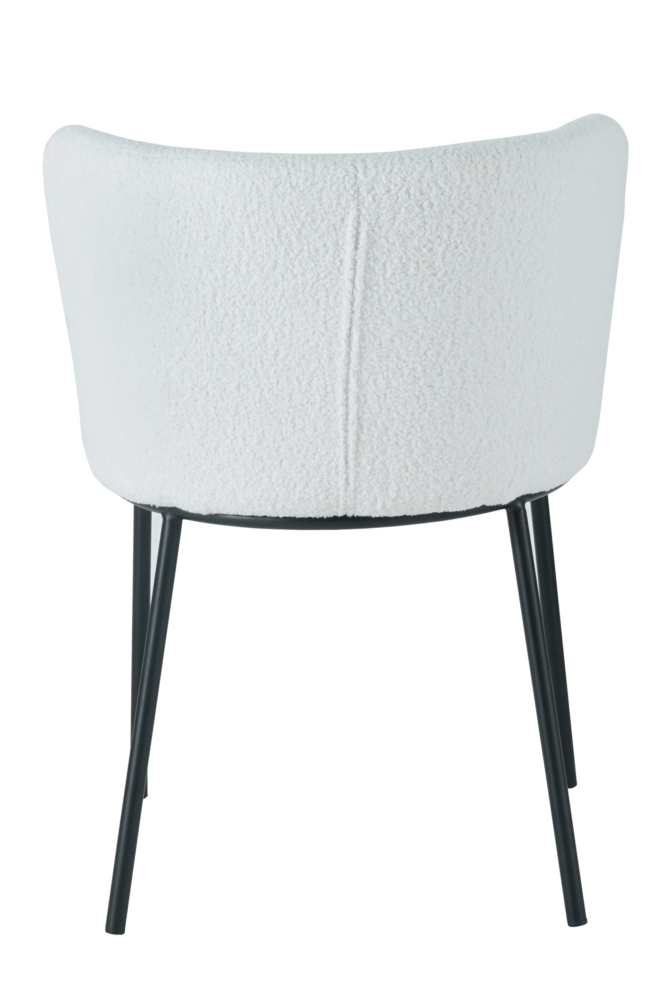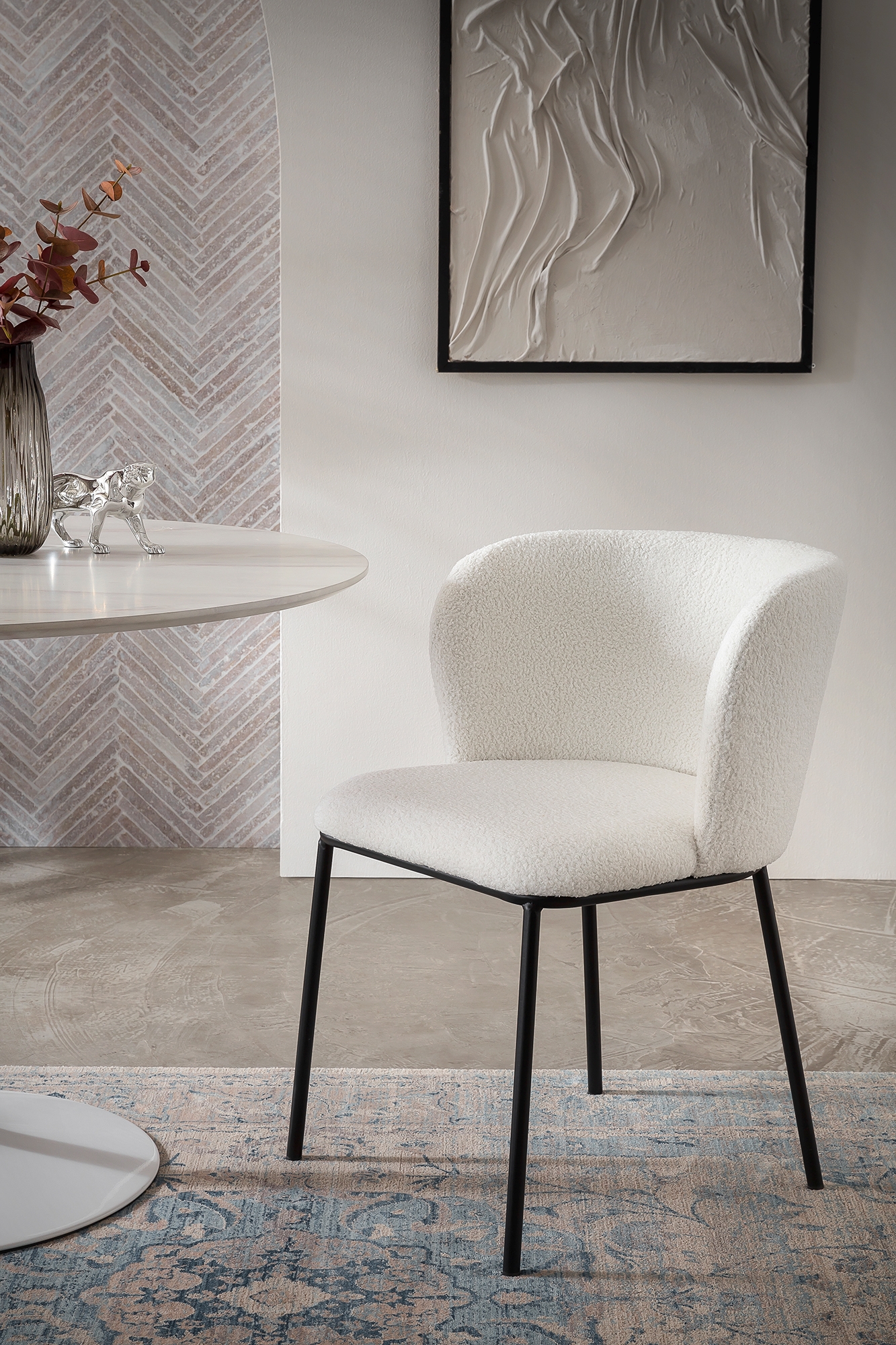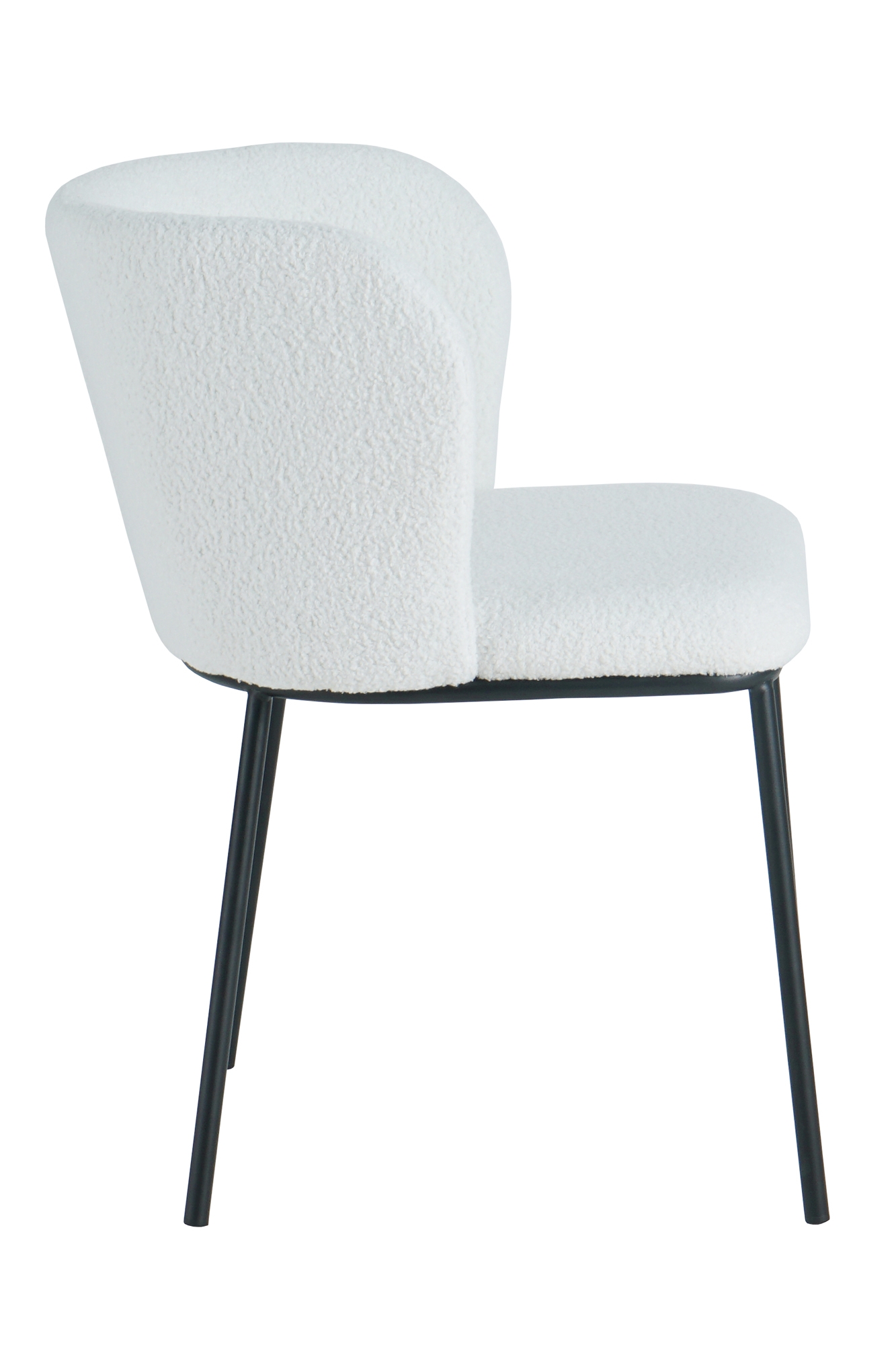 Skandinavisches Design durch und durch – wollige Bouclé-Optik, organische Formen und der schlichte nordische Look verleihen diesem Stuhl-Set Hygge pur. Die abgerundete Rückenlehne fasst einen komfortabel ein und sorgt für ein gemütliches Sitzgefühl. Das robuste 4-Fuß-Gestell garantiert zusätzlich einen festen Stand. Im schlichten Schwarz-Weiß Look ist das Stuhl-Set ein absolut zeitloser Partner für die Inneneinrichtung im beliebten Scandi Style und passt in nahezu jeden Wohnstil. Der Bouclé Stoff, der schon lange Einzug in unsere Wohn- und Schlafzimmer gehalten hat, vermittelt Wärme und Geborgenheit. Außerdem spiegelt der Stoff mit seiner wolligen Optik die Essenz des beliebten Nordic Styles gekonnt wider. Der Stuhl wird im praktischen 2er Set geliefert und ist mit wenigen Handgriffen aufgebaut.