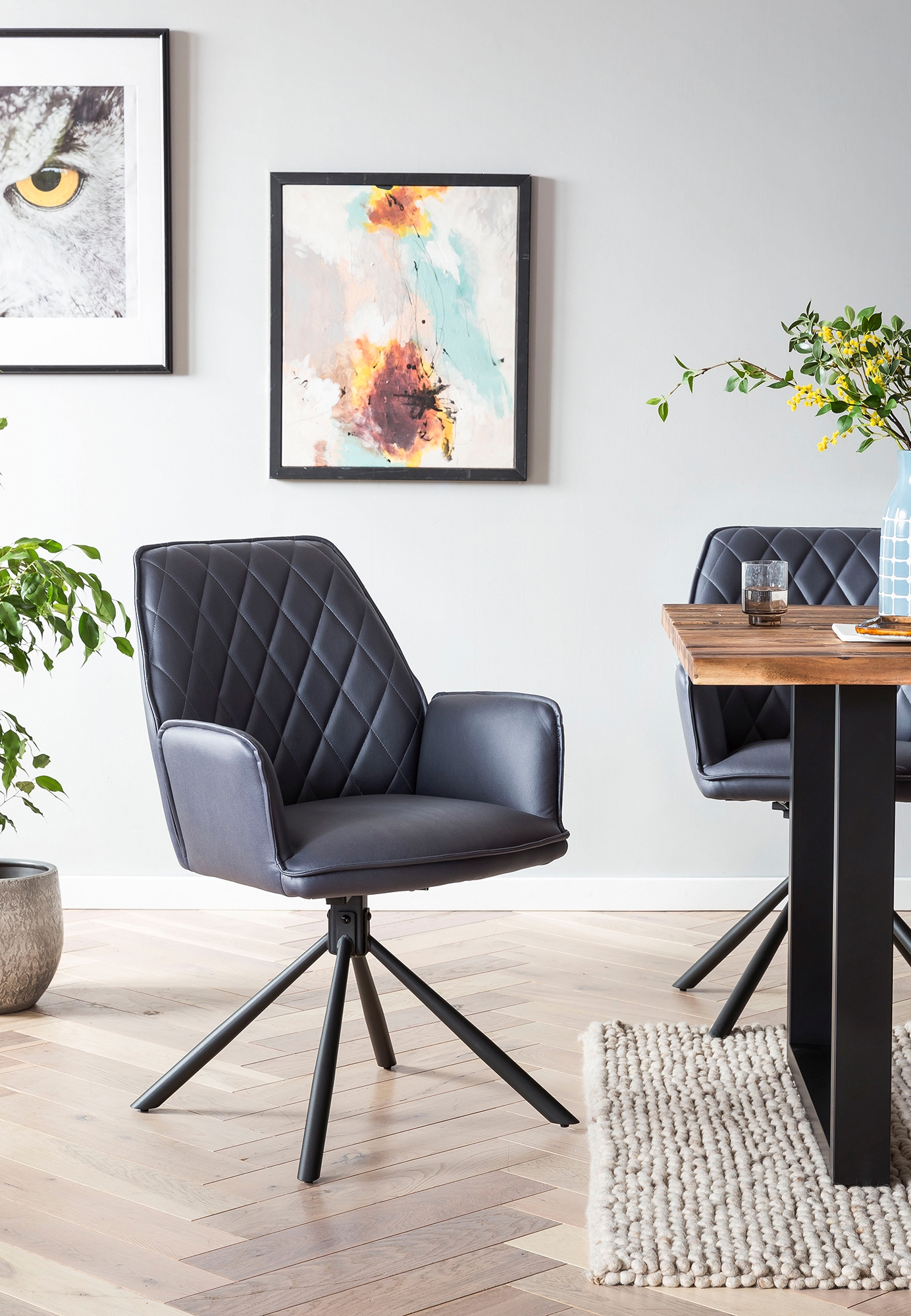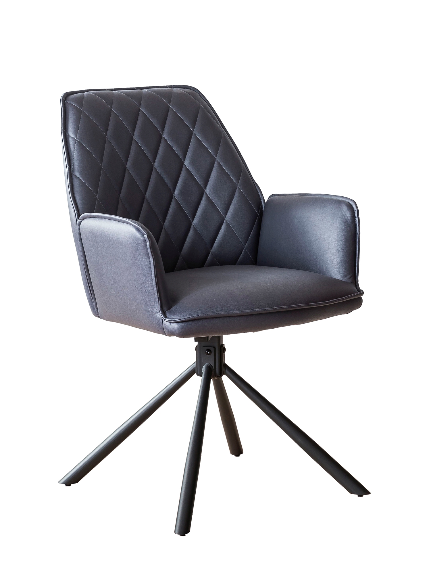 Dieser Armlehnstuhl überzeugt durch seine 360 Grad Drehfunktion. Der Microfaser-Bezug in Kunstlederoptik sieht sehr edel aus und passt perfekt zu den schwarzen Beinen. Das 4-beinige Metallgestell gewährleistet einen sicheren und stabilen Stand. Der Polsterstuhl bietet durch seine sesselartige Sitzfläche einen Sitzkomfort der Extraklasse. Ein funktionelles Highlight ist die 360 Grad Drehfunktion des Stuhles. Die Rautensteppung auf der Rückenlehne ist eine Augenweide und macht dieses Möbel zum absoluten Blickfang in Ihrem Wohnraum. Durch seine extravagante Formgebung kann dieser Polsterstuhl auch als Konferenzstuhl genutzt werden. Egal wo er zum Einsatz kommt, Sie und Ihre Gäste werden diesen Sitzkomfort lieben.