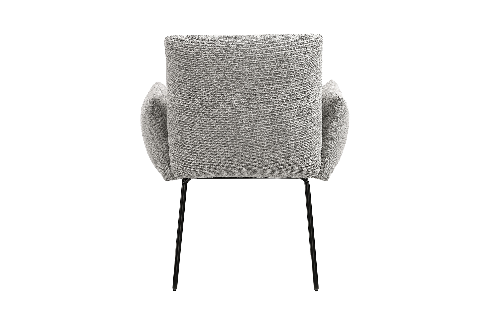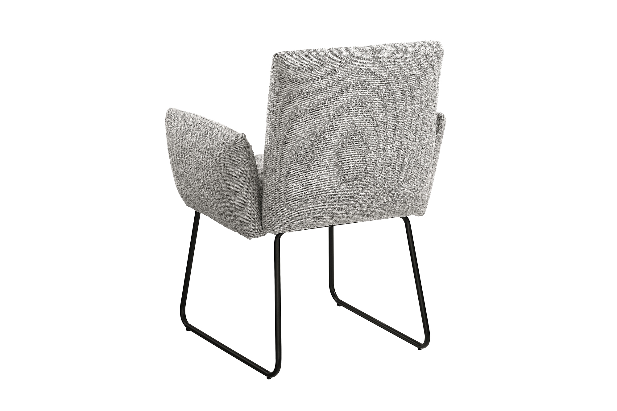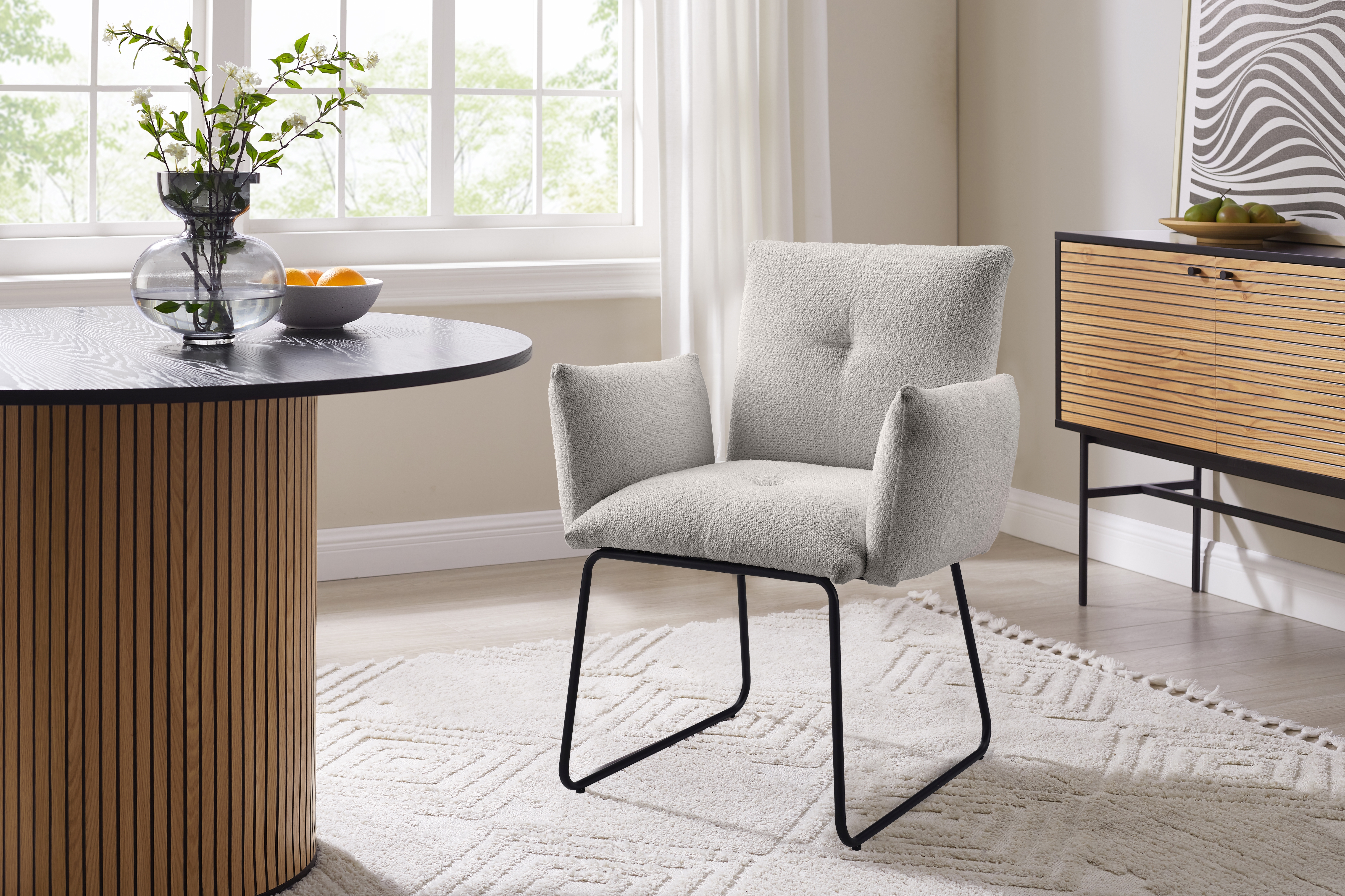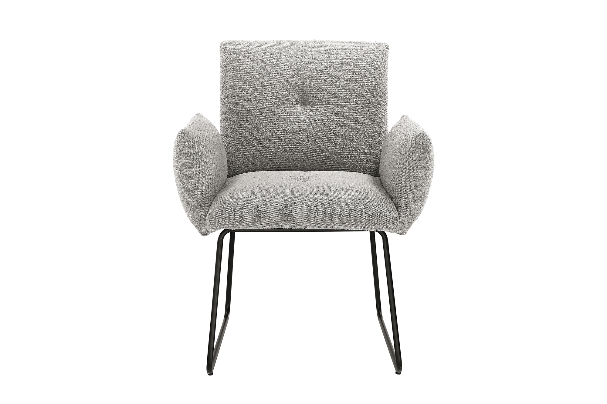 Komfort der Extraklasse – Dieser Armlehnstuhl mit topaktuellem Bouclé Bezug spielt nicht nur optisch in der oberen Liga. Die weich gepolsterte Sitzfläche besitzt eine hochwertige Wellenunterfederung, die optimalen Sitzkomfort garantiert. Zwischen der komfortablen Sitzfläche und den üppig gepolsterten Armlehnen, ist der Stuhl der ideale Partner für den Wohn- und Lifestyletrend „Cocooning“. Sich zuhause rundum wohlfühlen und einen gemütlichen Rückzugsort abseits vom Alltagsstress schaffen ist hier das Motto. Sie und Ihre Gäste können es sich auf dem Armlehnstuhl mit Bouclé Stoff so richtig bequem machen. Abgerundet wird die moderne Optik durch ein schwarzes Kufengestell aus mattschwarz pulverbeschichtetem Metall und den schlichten aber chicen Ziernähten und der Knopfheftung im Rücken.