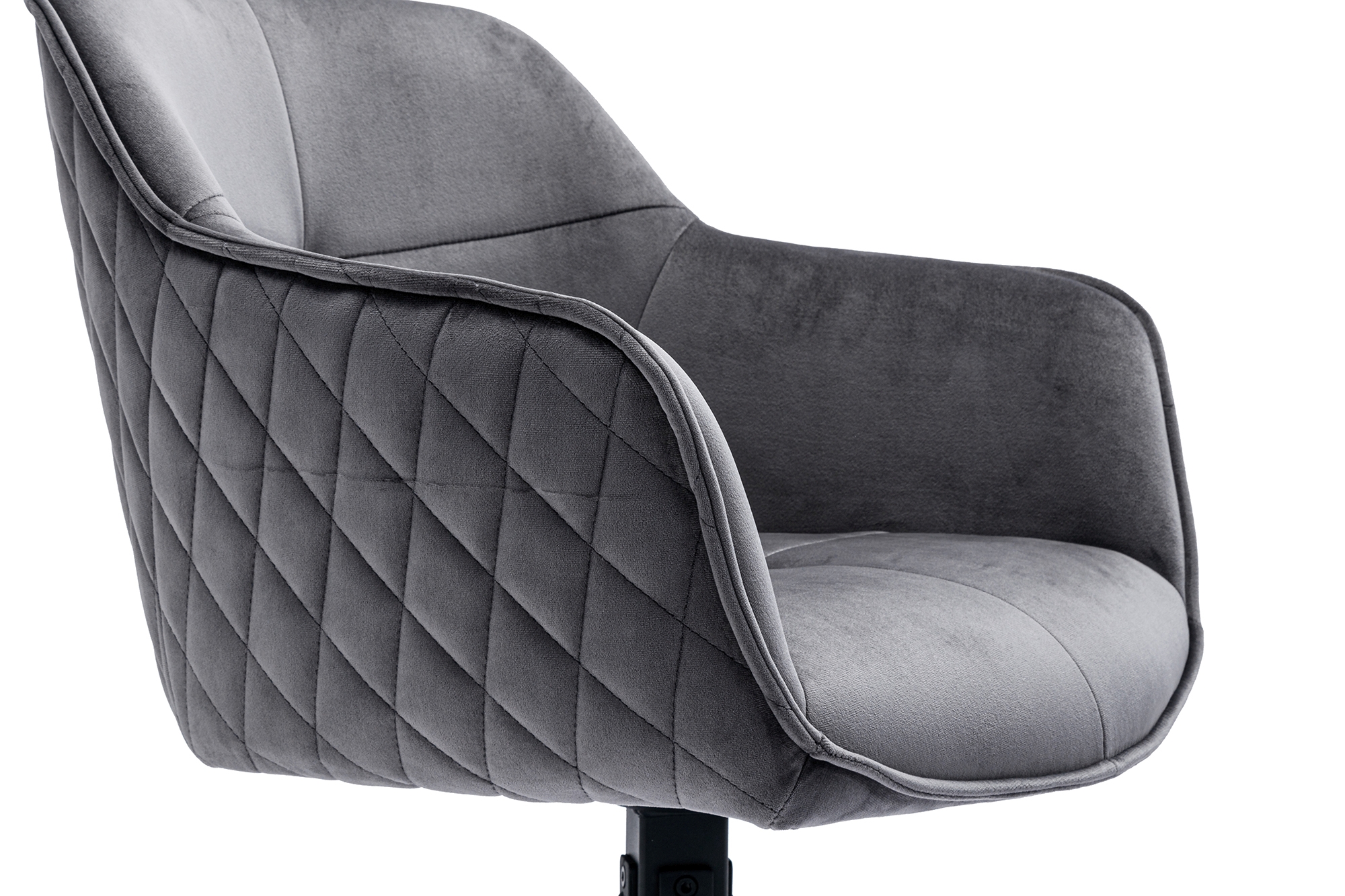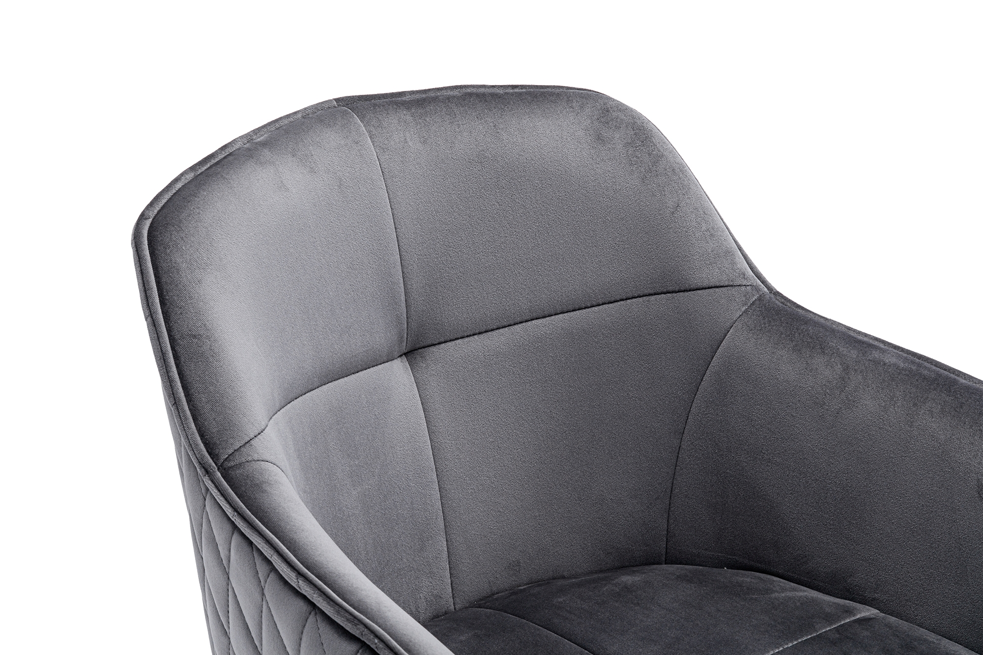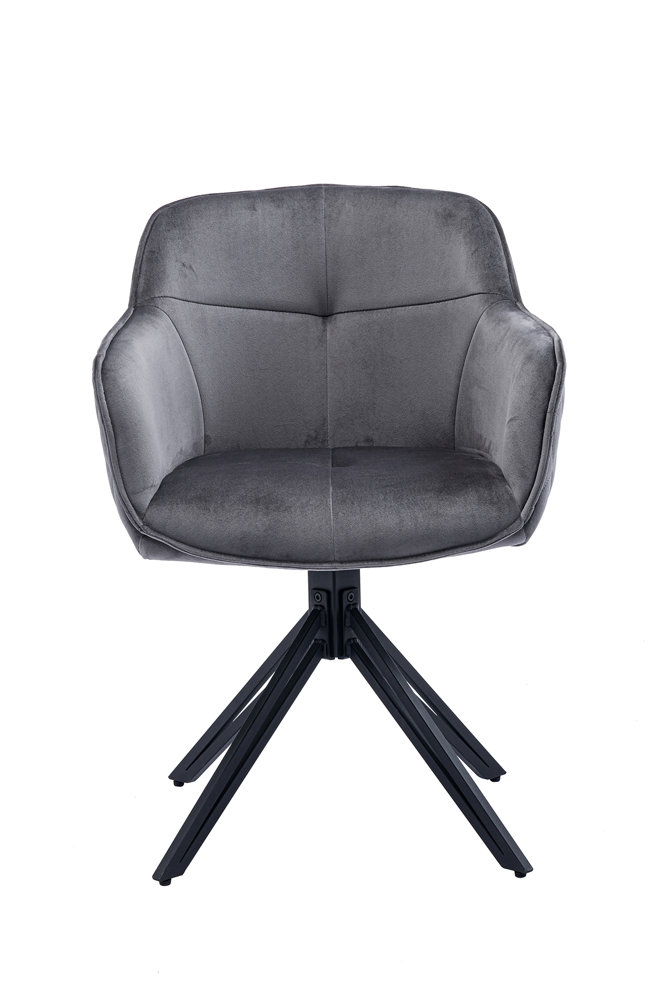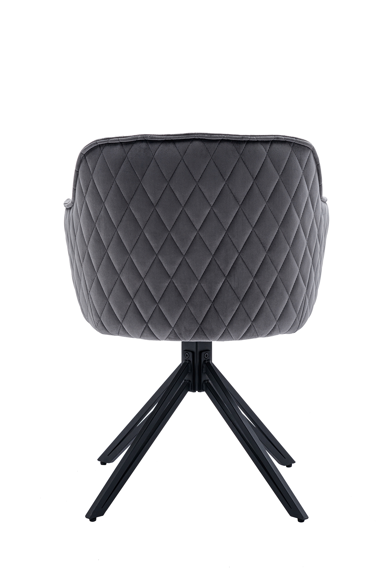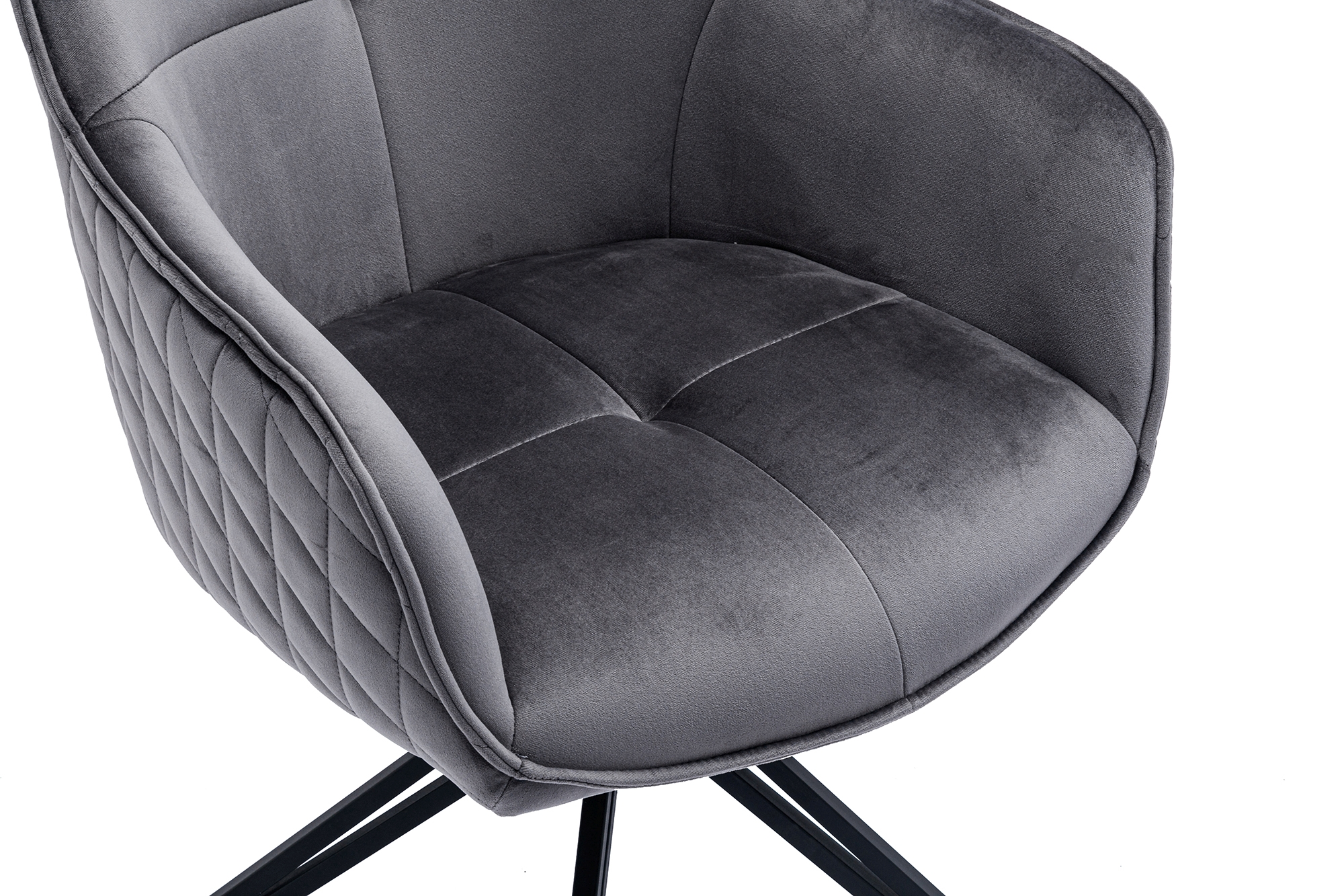 Der stylische Armlehnstuhl mit 360°-Drehfunktion bereichert mit besonders flexiblem Sitzkomfort Ihr Zuhause. Die Sitzschale lässt sich um 360° drehen und kehrt immer wieder in ihre Ursprungsposition zurück. Der besondere Retro-Look des bequemen Stuhls macht das Sitzmöbel zum absoluten Hingucker. Das außergewöhnliche Design-Gestell aus schwarzem Metall und die hochwertig Wabensteppung im Rücken sind dabei nur zwei der hochwertigen Details des Polsters. Die schwarzen Metallbeine bilden einen interessanten Kontrast zu dem edlen Samt-Bezug der Sitzschale und sorgen für einen sicheren Stand. Ein Rundum besonderer Stuhl für Ihr Zuhause!