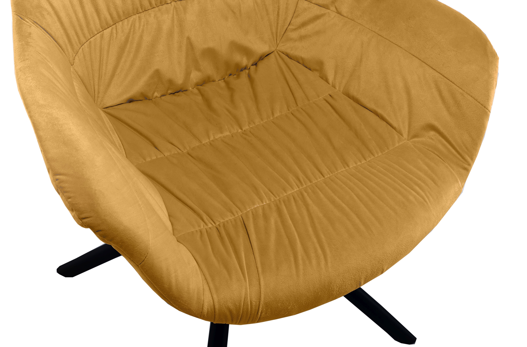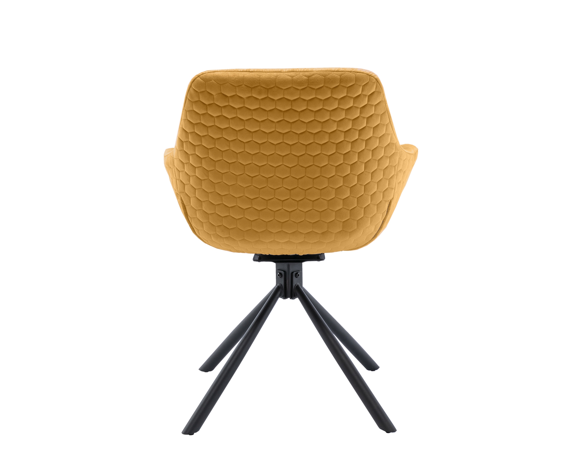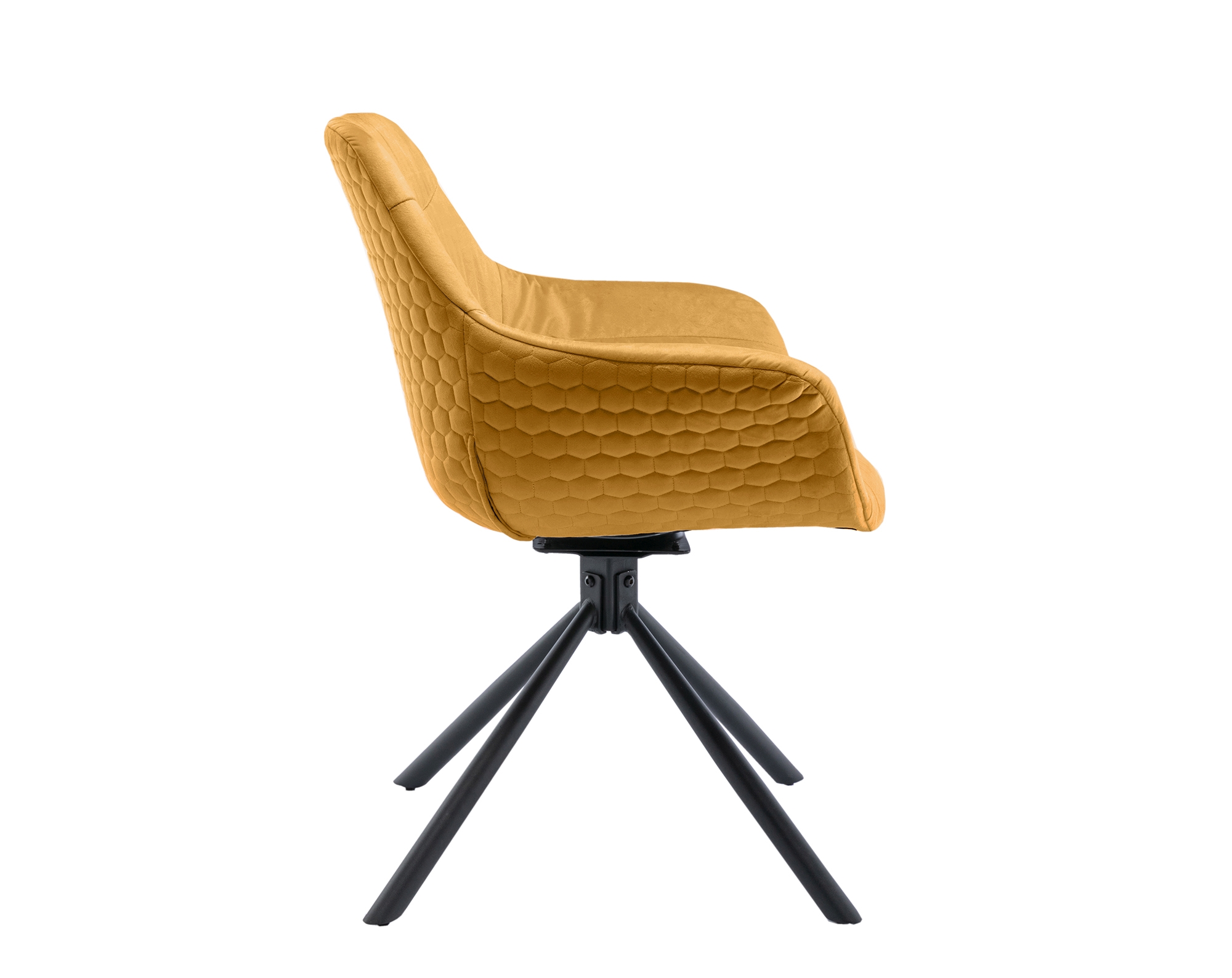 Der trendige Armlehnstuhl besticht durch seinen Stoffbezug in Samt-Optik und seinem Baseball-Gestell mit 360° Drehfunktion aus schwarz pulverbeschichtetem Metall. Die Metallbeine gewährleisten nicht nur einen sicheren Stand, sondern harmonisieren auch perfekt mit dem Bezug des Stuhles. Durch die bequeme Sitzschale mit Armlehnen erhalten Sie einen angenehmen Sitzkomfort der Extraklasse. Die Quersteppung an dem inneren Sitz- und Rückenbereich, sowie die Wabensteppung, die den äußeren Bereich schmückt, sind ein absoluter Blickfang in Ihrem Wohnraum. Durch seine extravagante Formgebung kann dieser Polsterstuhl auch als Konferenzstuhl genutzt werden. Egal wo er zum Einsatz kommt, Sie und Ihre Gäste werden diesen Sitzkomfort lieben.