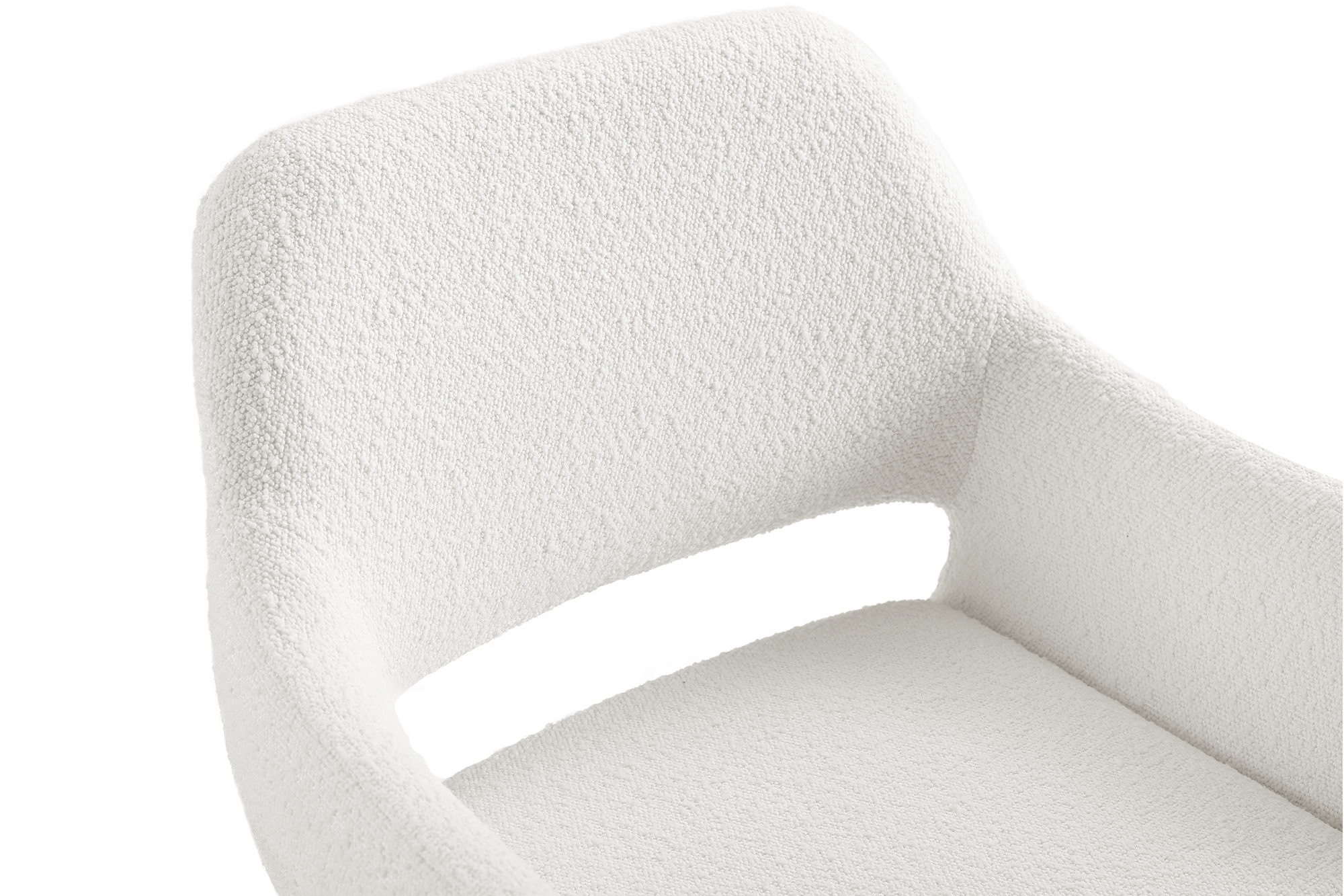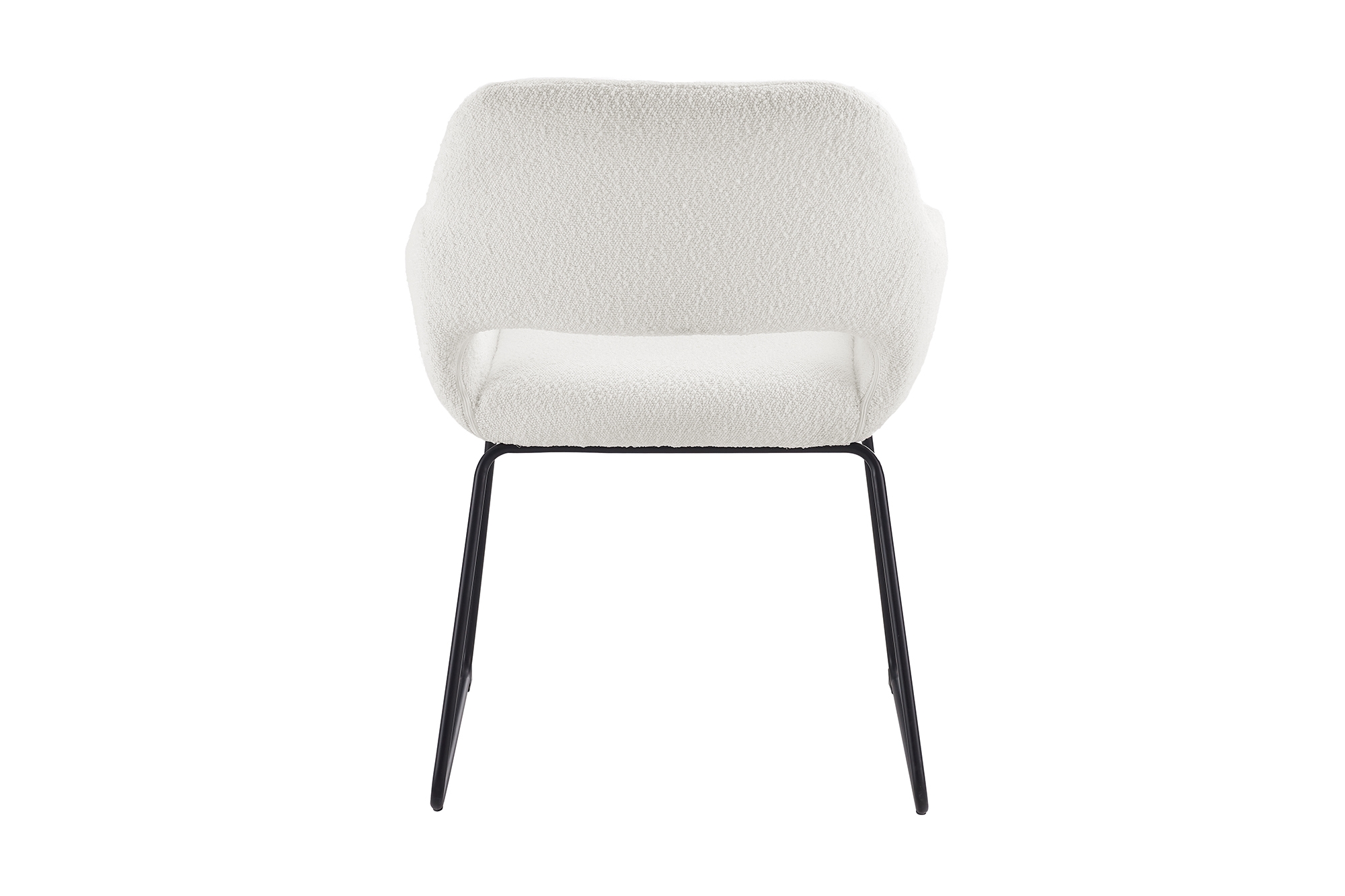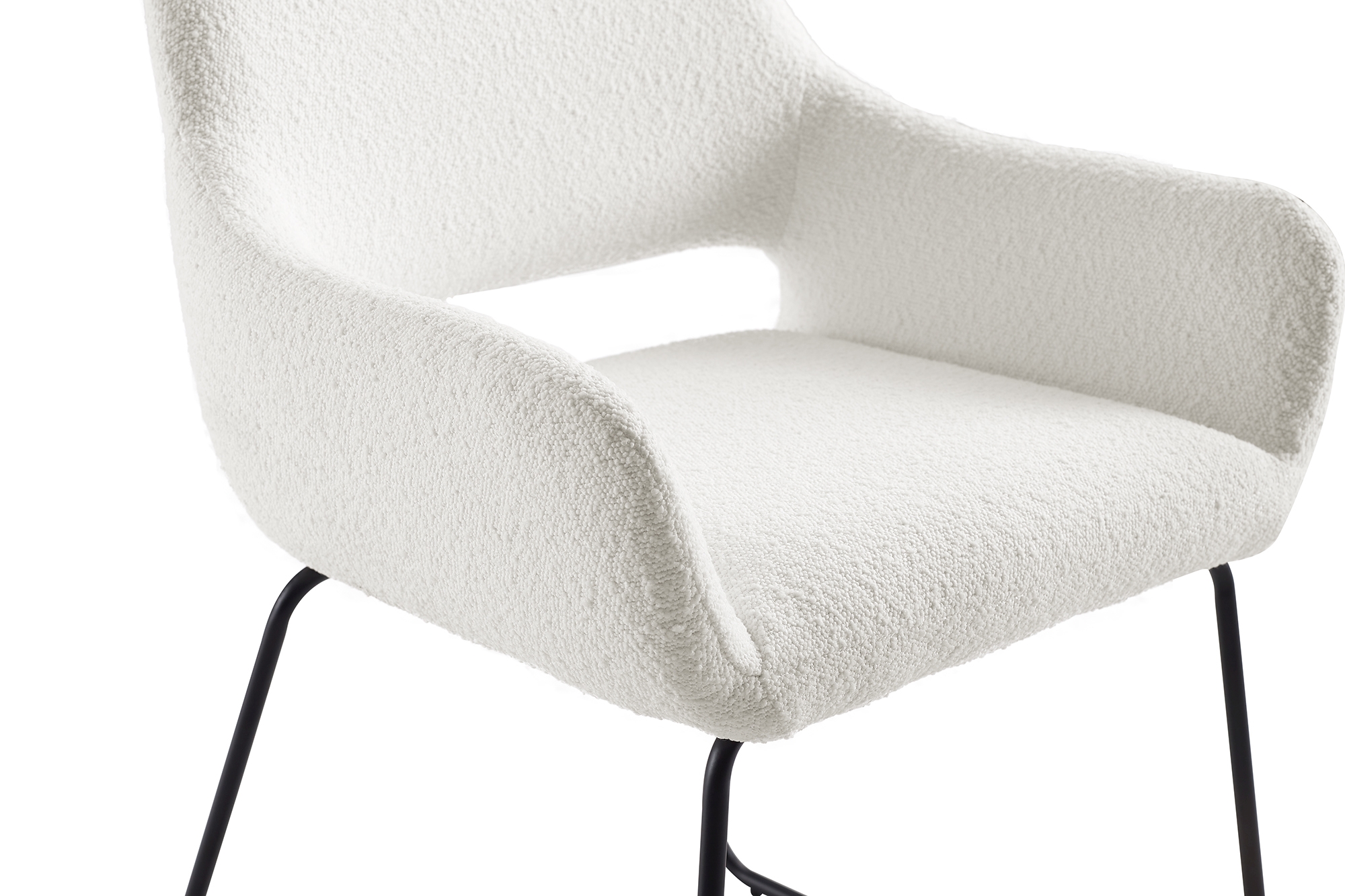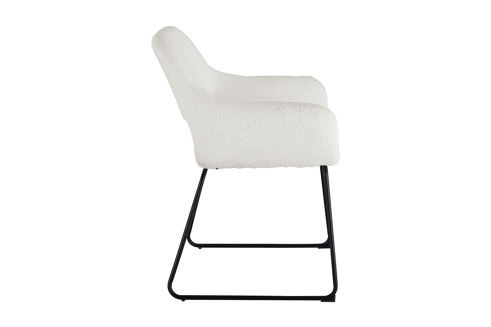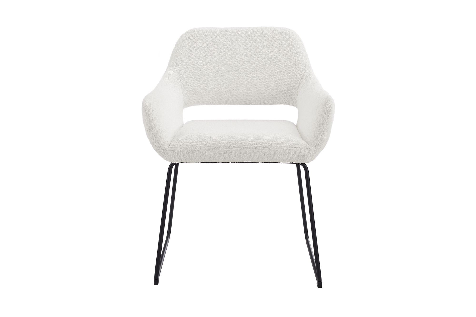Mit diesem Armlehnstuhl mit extravagantem Rücken Cout-Out holen Sie sich einen modernen Design-Kompagnon mit Gemütlichkeitsfaktor in die eigenen vier Wände. Der Bezug aus grob strukturiertem Bouclé Stoff trifft genau den Puls der Zeit und ist dabei nicht nur komfortabel, sondern punktet auch durch seine Robustheit. Die hohen gepolsterten Armlehnen runden den Sitzkomfort des Stuhles dabei gekonnt ab. Das schwarze Kufengestell aus mattschwarz pulverbeschichtetem Metall unterstreicht den modernen Look zusätzlich. Ob als Esszimmerstuhl oder als Sitzgelegenheit am Schminktisch oder in der Leseecke – Dieser Armlehnstuhl mit Bouclé Stoff macht garantiert vielerorts eine gute Figur.