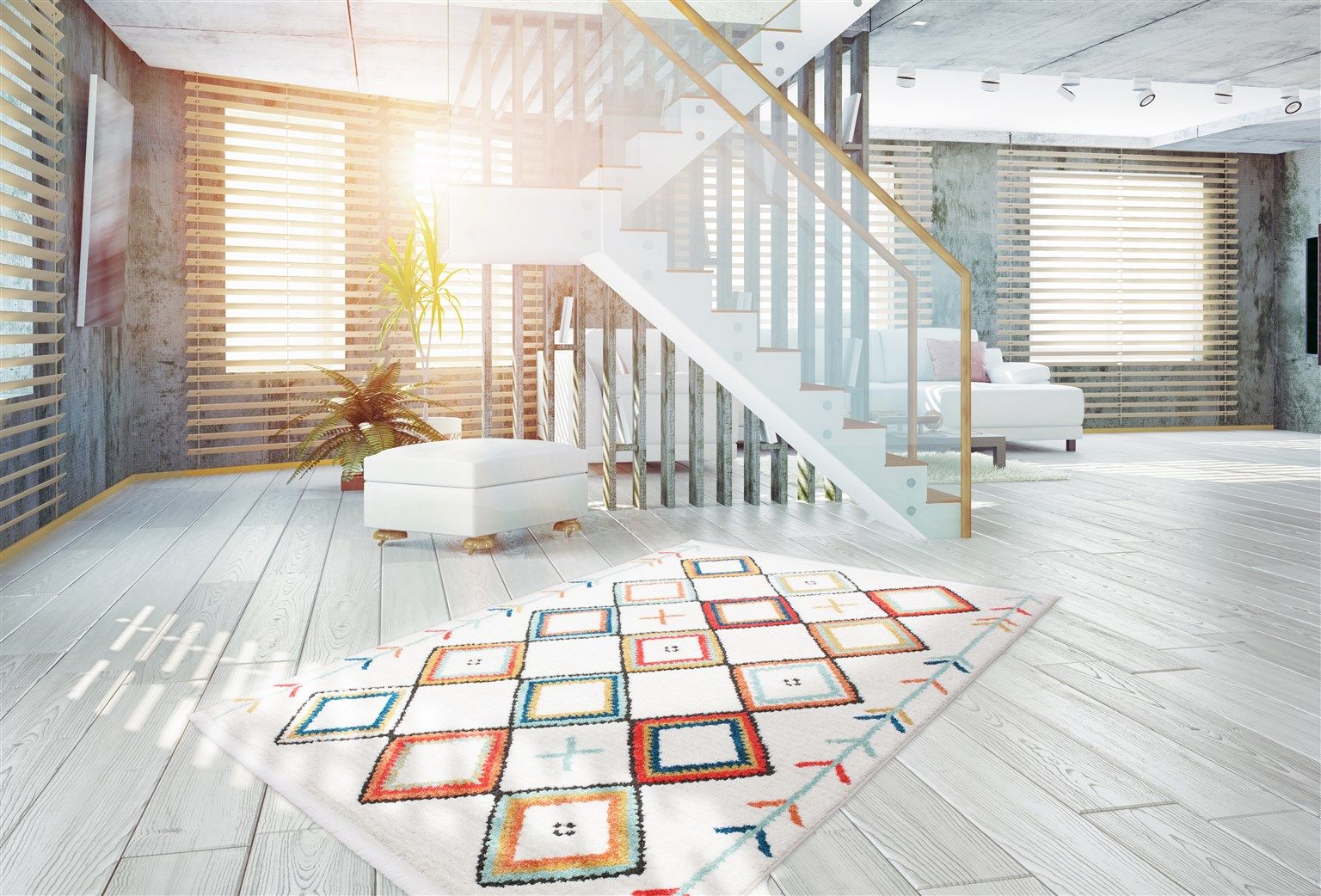 - moderner Look, buntes Rauten-Muster auf hellem Teppich, wie handgemalt wirkende Muster, erhältlich in verschiedenen Größen