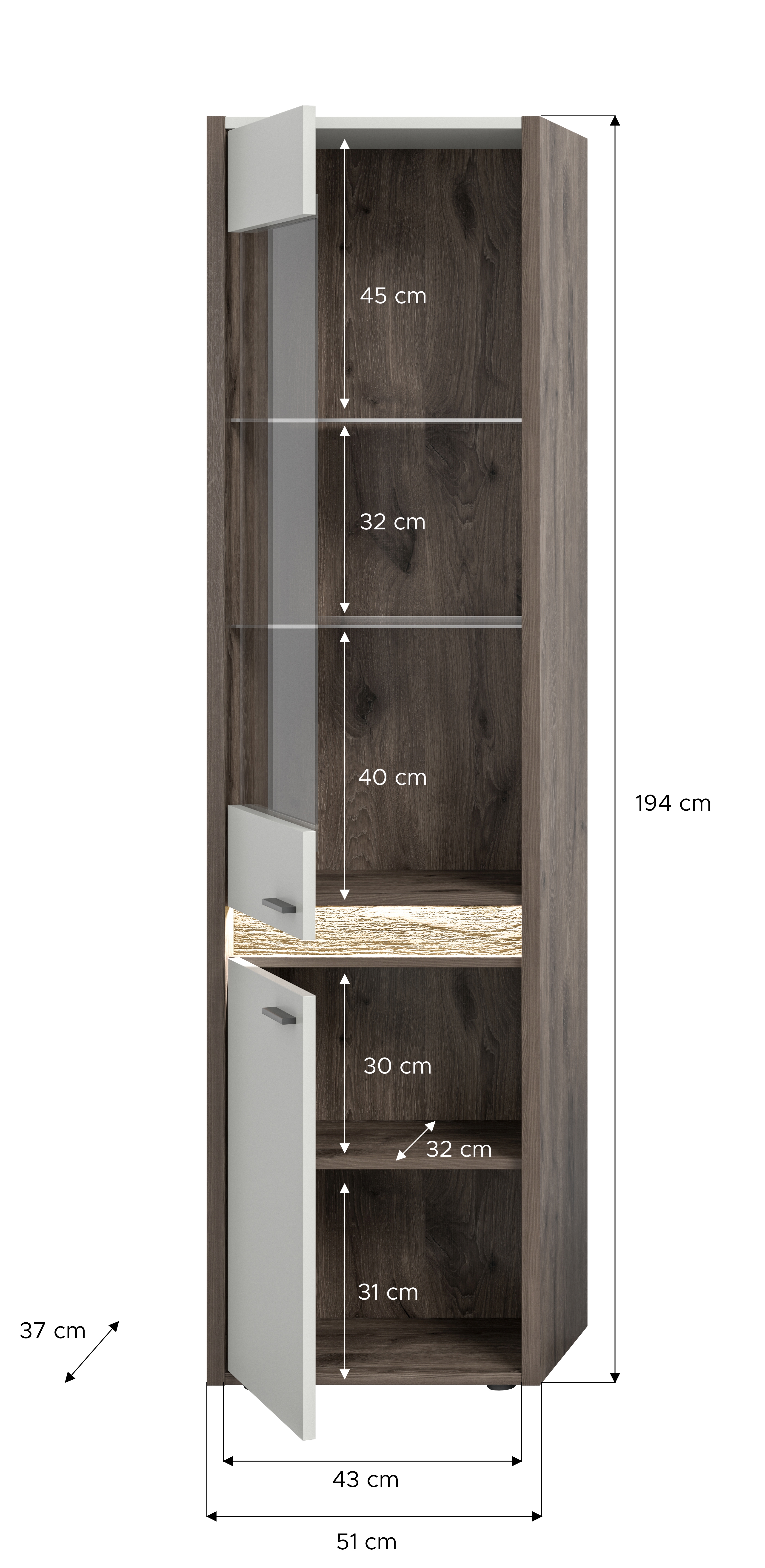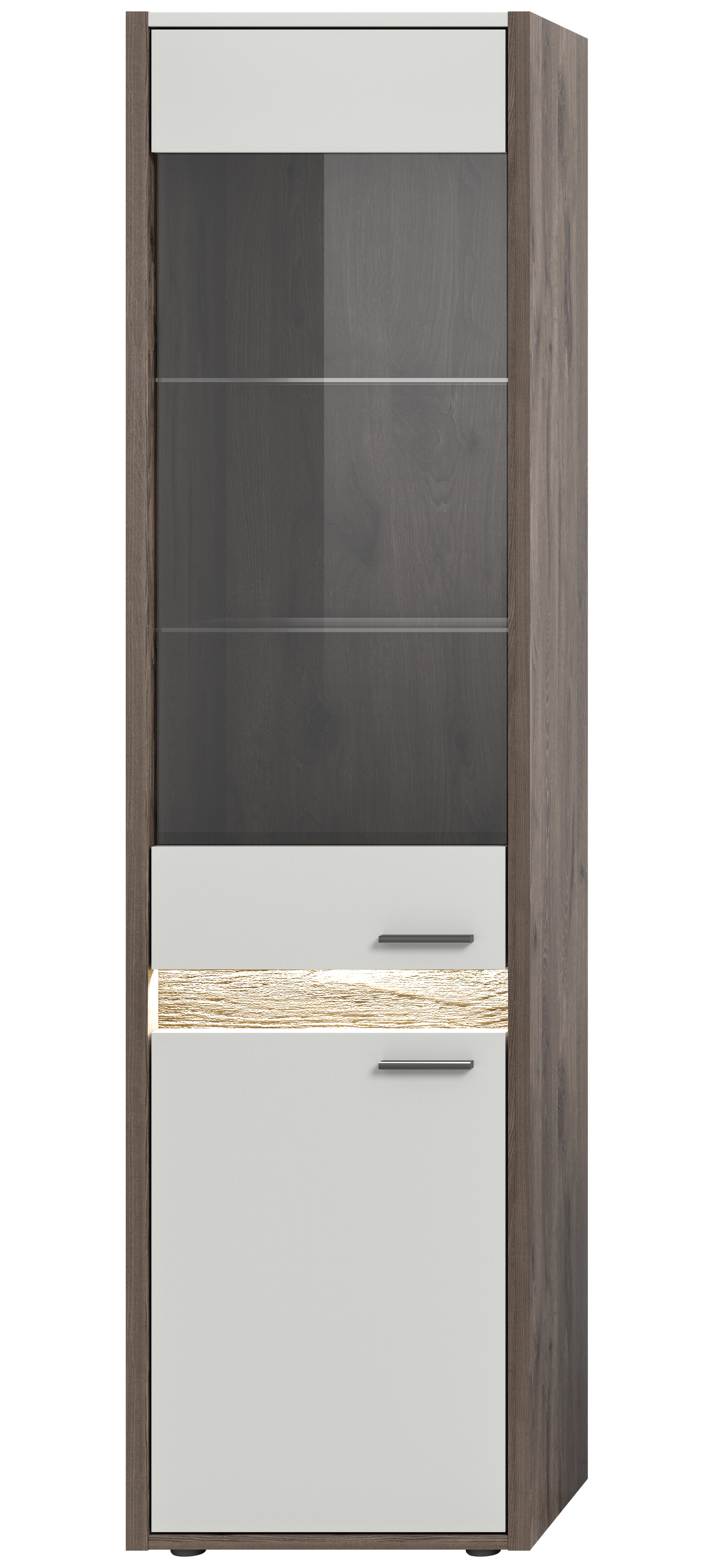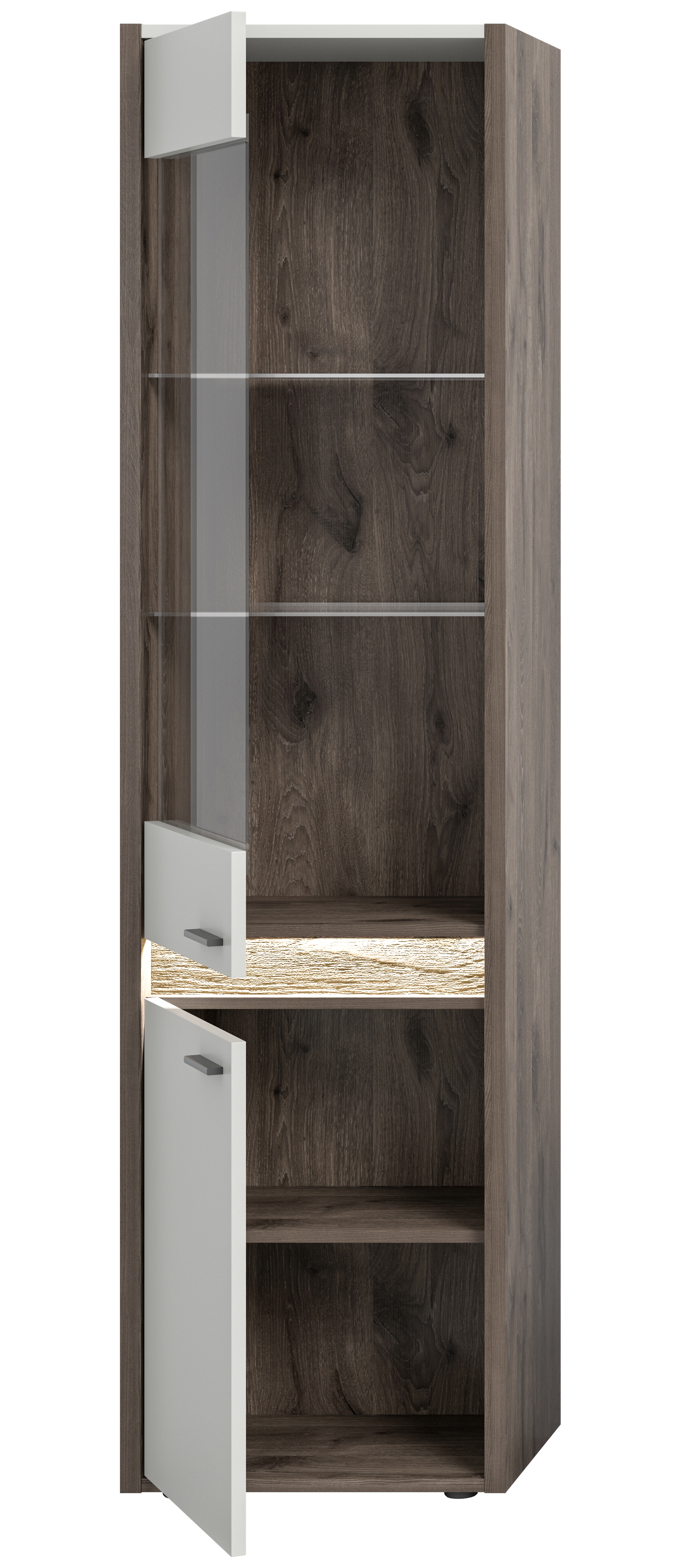 - Design/Stil: Moderne Vitrine in Nox Oak Dunkel und Hellgrau, die mit ihrem zeitgemäßen Design und der eleganten Farbkombination eine stilvolle Ergänzung darstellt und einen Hauch von Raffinesse in den Raum bringt.