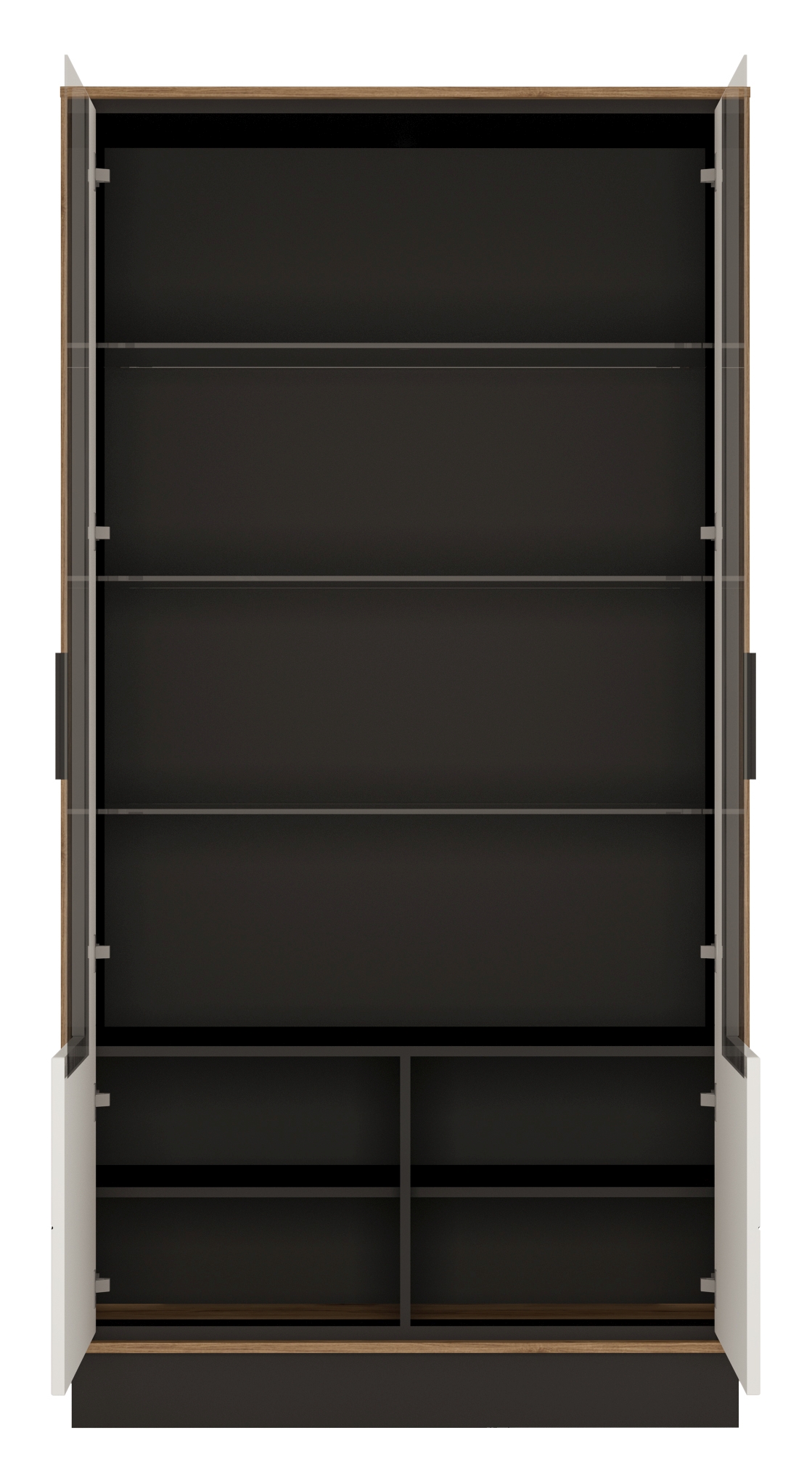 Front: MDF Weiß Hochglanz PVC / MDF Schwarz Masse / Glas