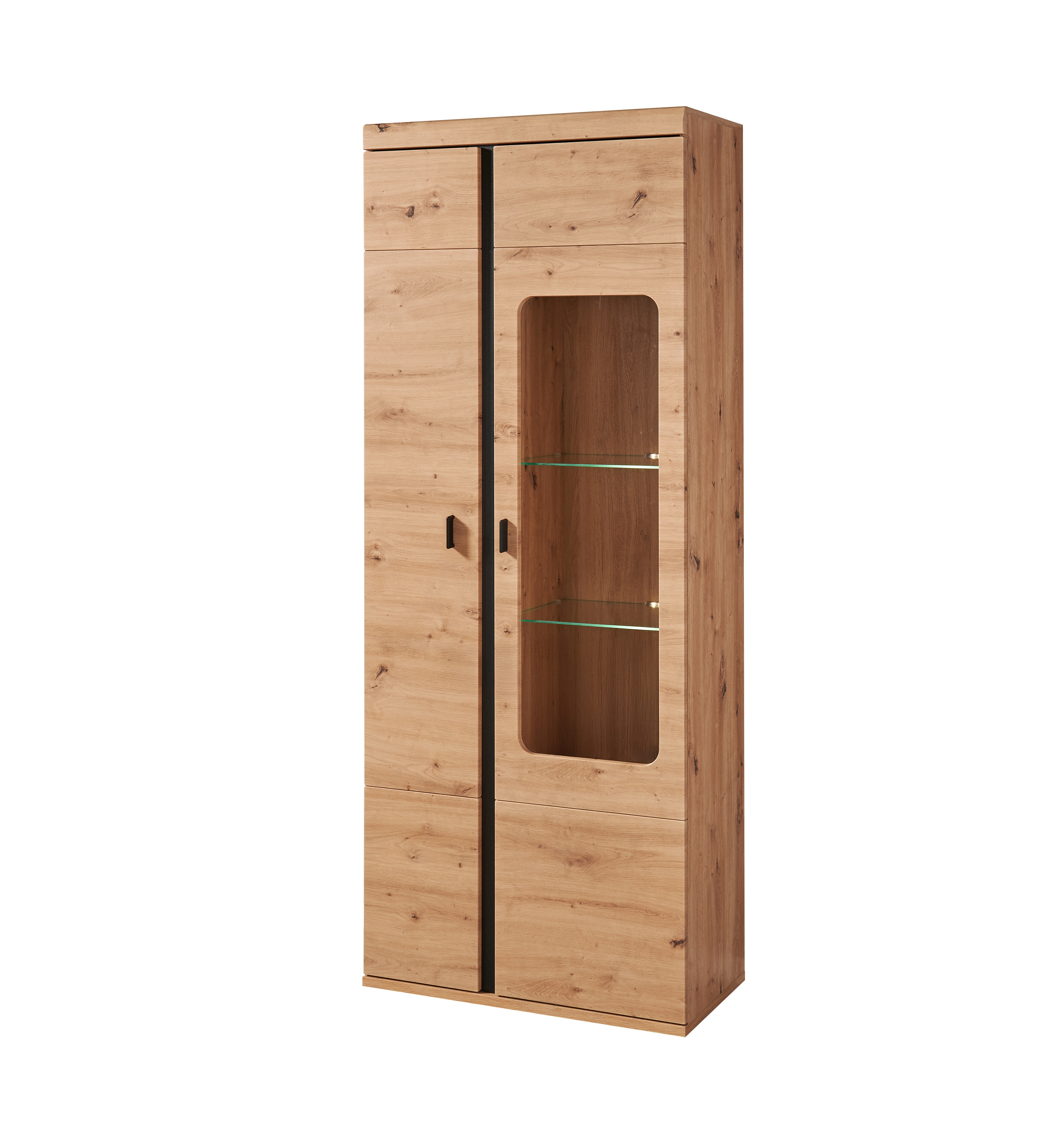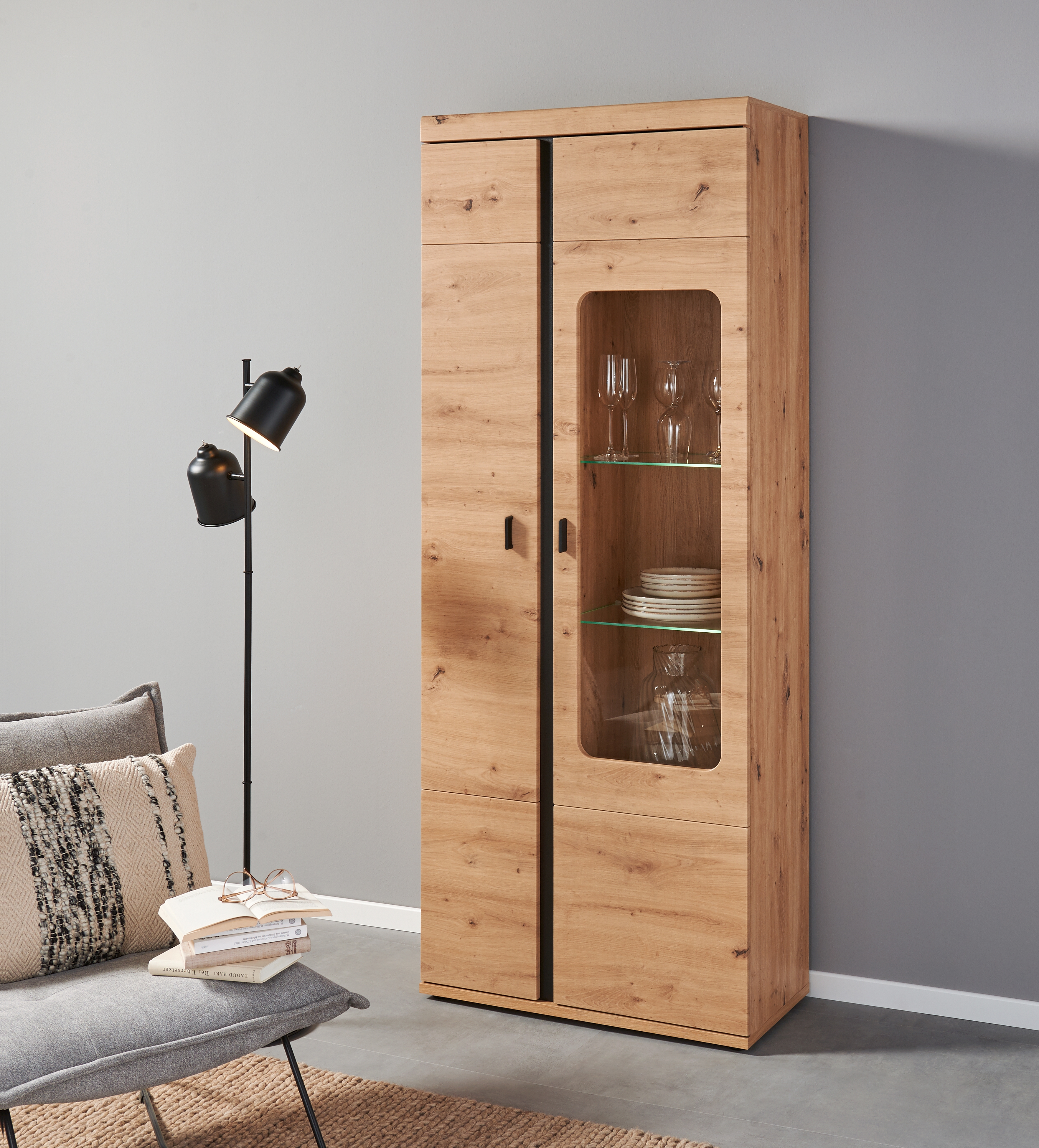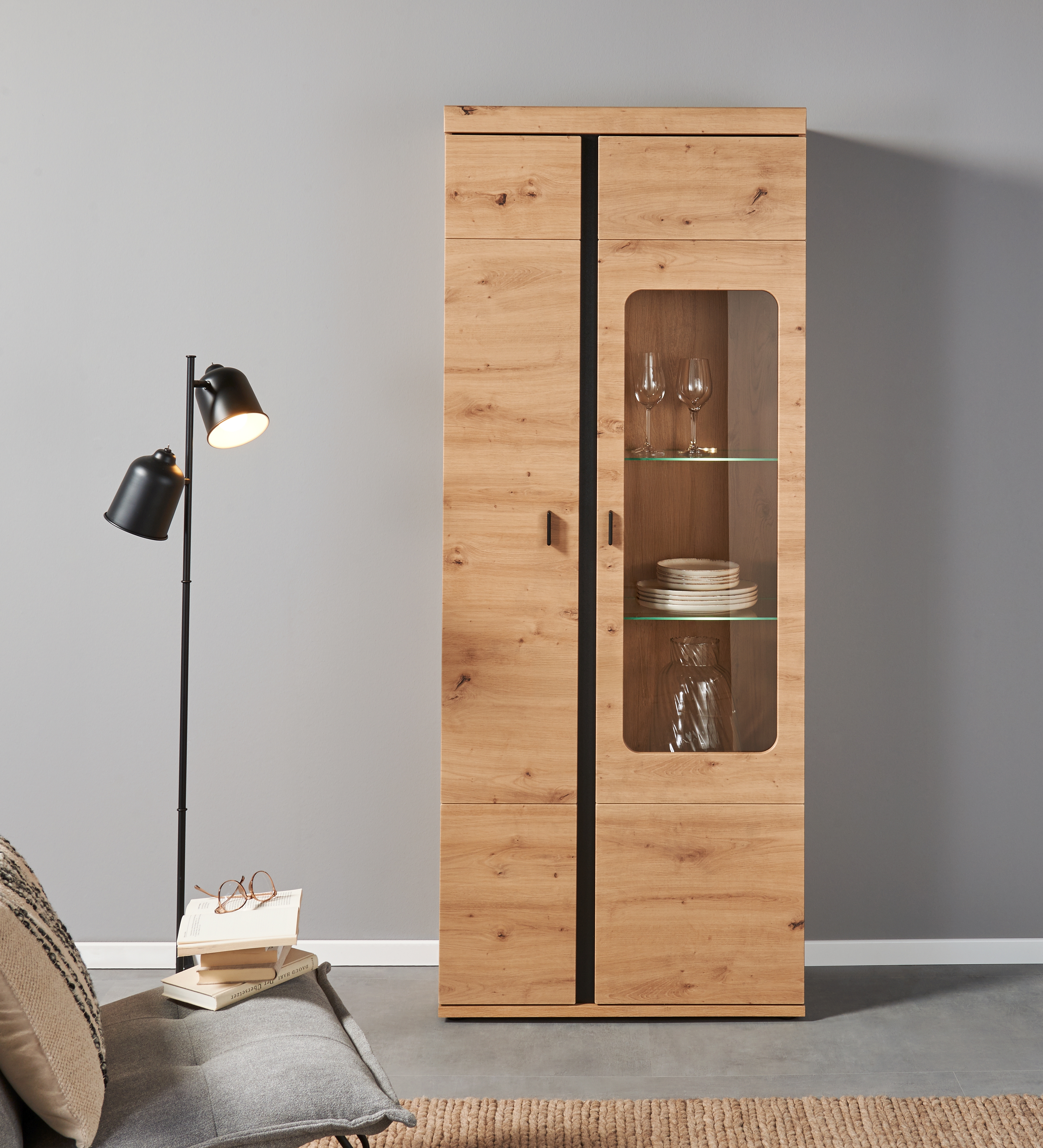 Front: Artisan Eiche Holznachbildung, MDF (Mitteldichte Holzfaserplatte) foliert mit Absetzungen in Schwarz (Spanplatte Melaminbeschichtung) / Glas