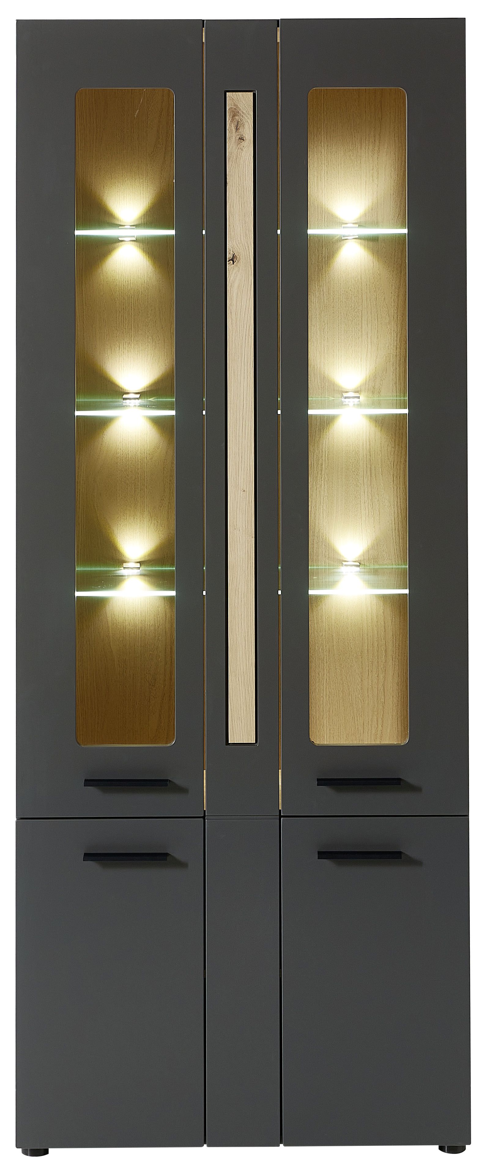 Front: Lack Laminat graphit supermatt MDF mit Absetzung in MDF Artisan Eiche Holznachbildung / Klarglas