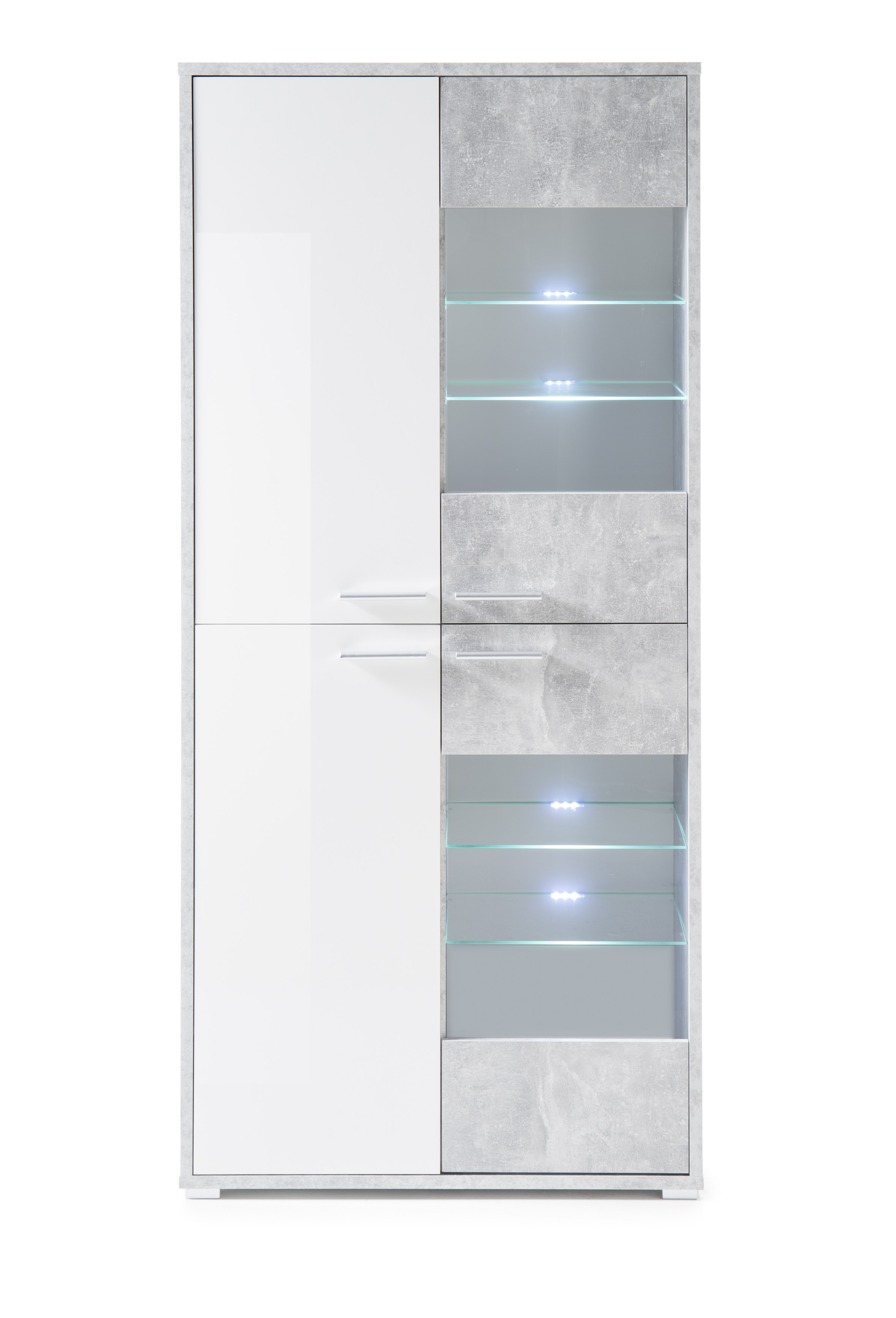 - Modernes Design mit Betonoptik und Hochglanzfront
