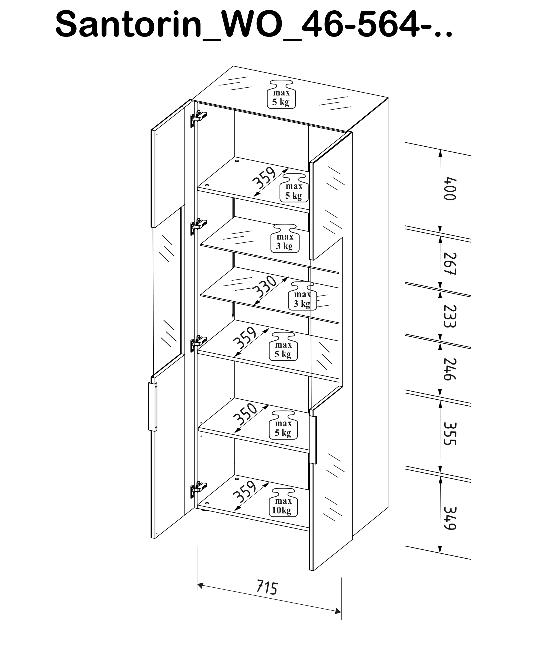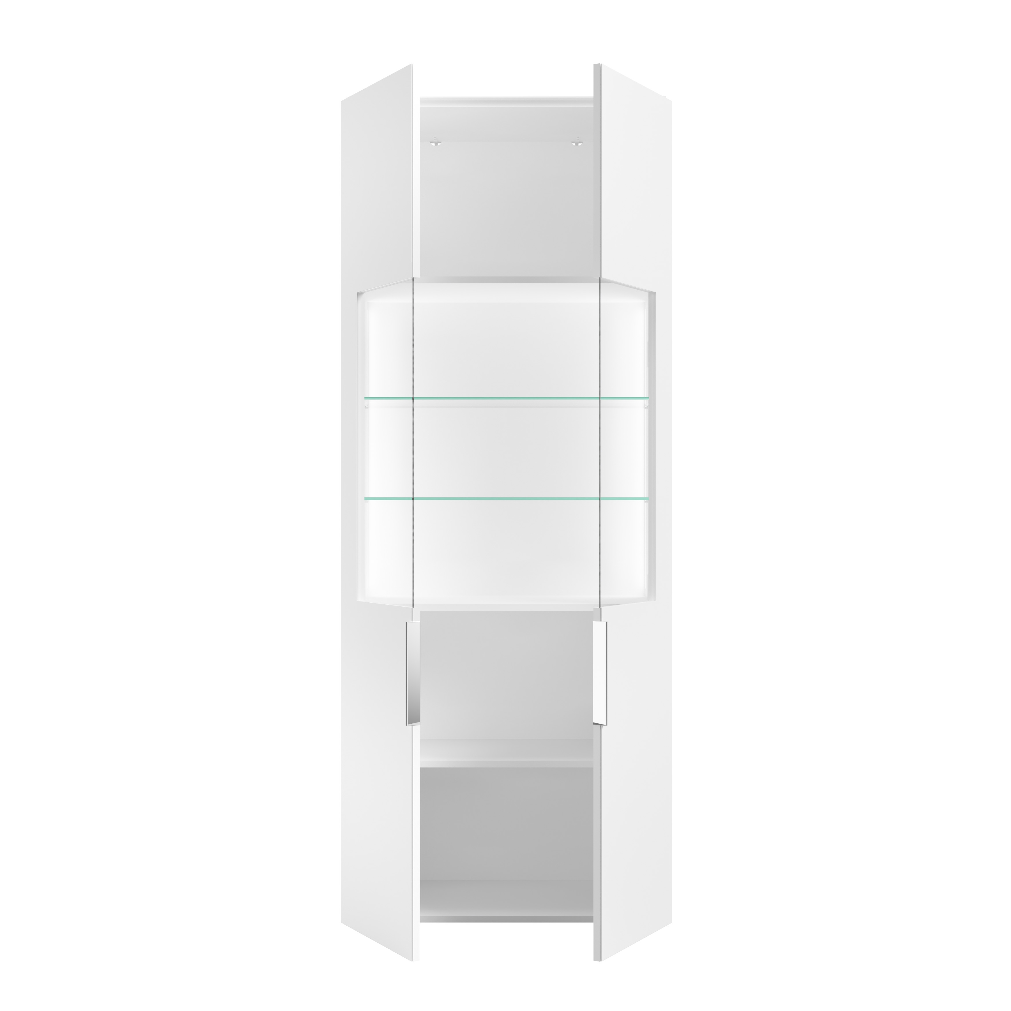 Korpus und Front sind aus melaminbeschichteter Spanplatte in Weiß gefertigt – pflegeleicht und strapazierfähig. Die Fronten mit Glaselementen ermöglichen einen gezielten Blick auf Ihre Ausstellungsstücke. Schwarze Kunststofffüße mit runden Möbelgleitern sorgen für einen sicheren Stand und schonen den Boden.