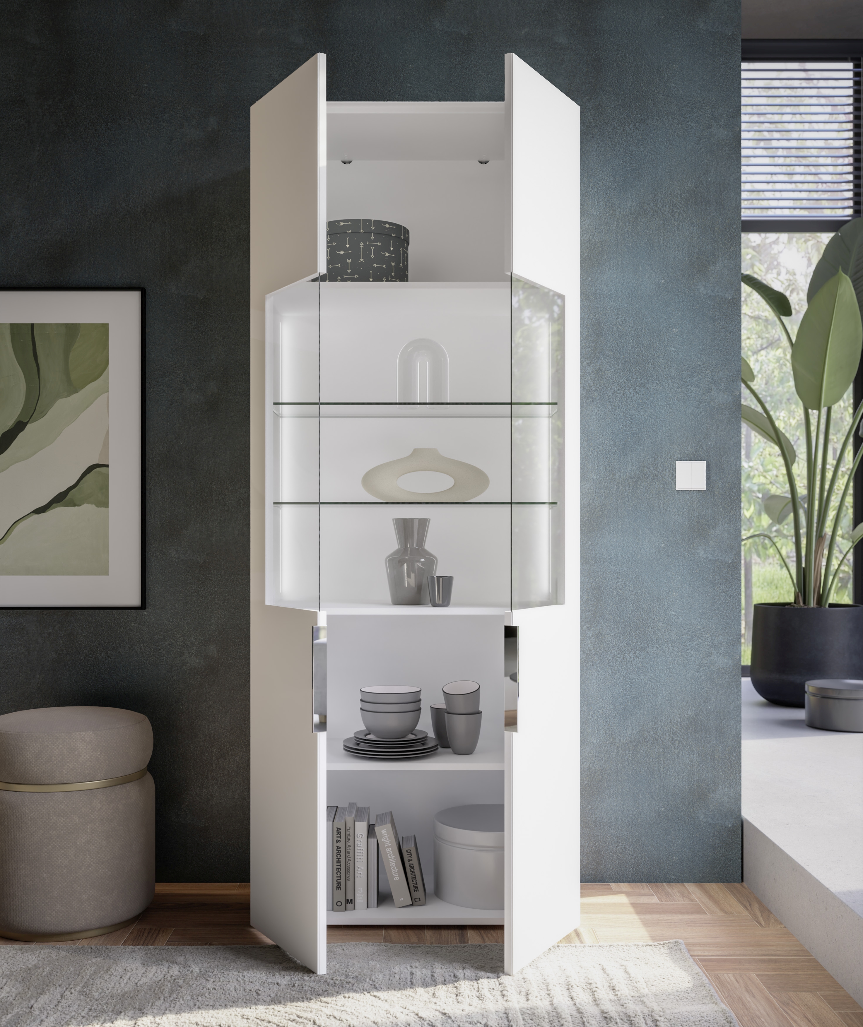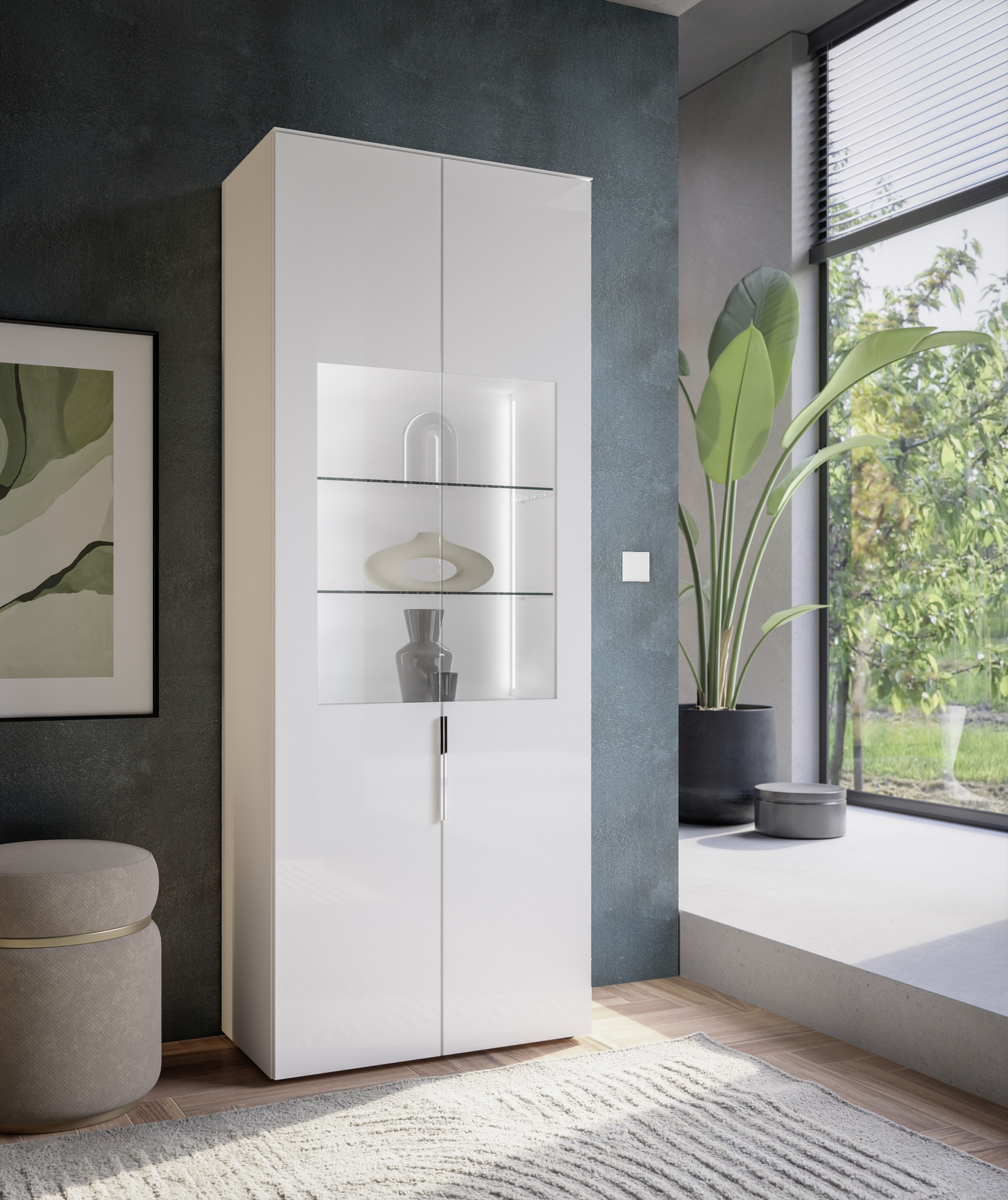 Die Vitrine verfügt über 2 Türen mit Teilverglasung, hinter denen sich 2 Glasböden für dekorative Gegenstände und 3 zusätzliche Einlegeböden für weiteren Stauraum befinden. Die integrierte Beleuchtung setzt Ihre Lieblingsstücke wirkungsvoll in Szene.