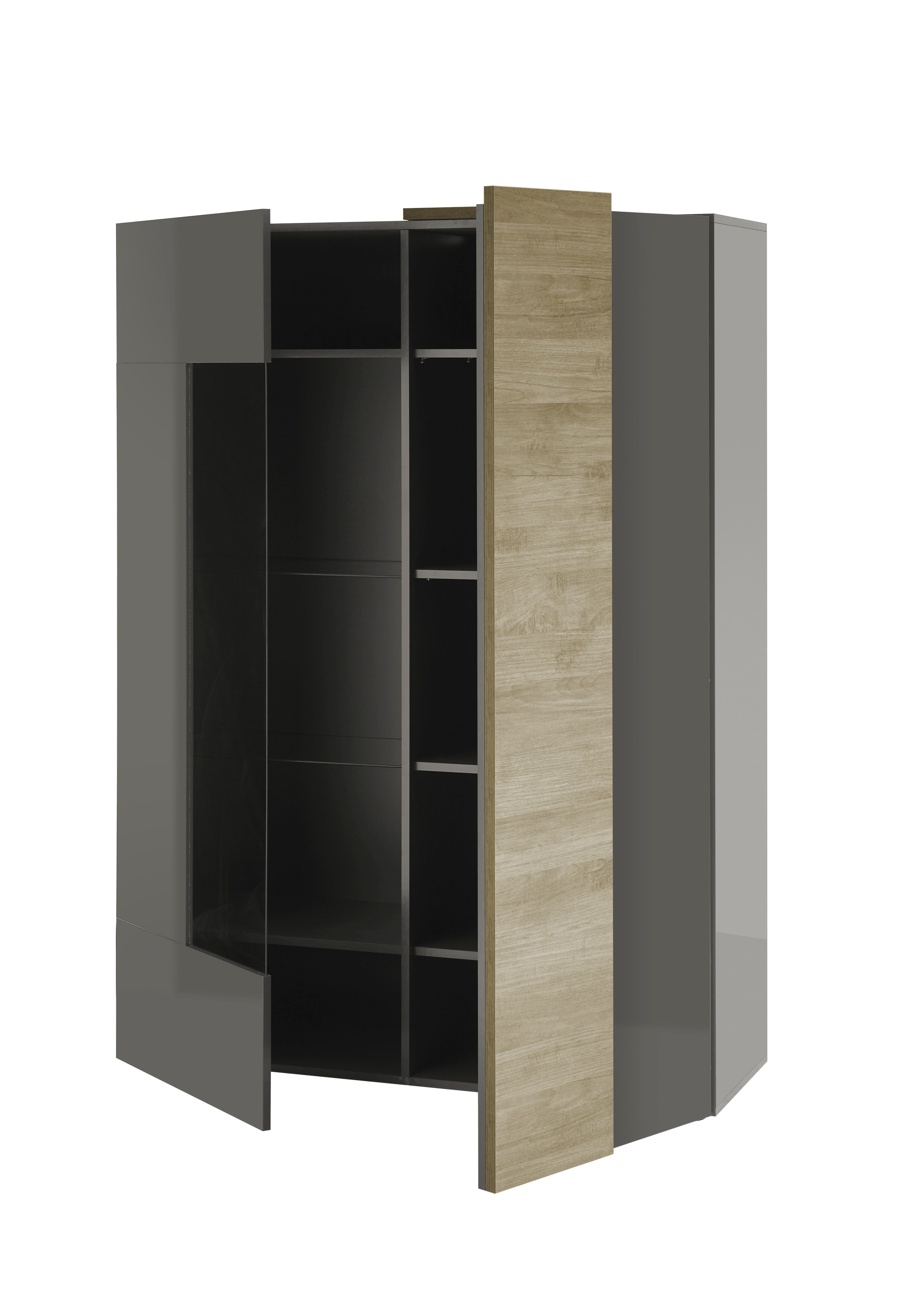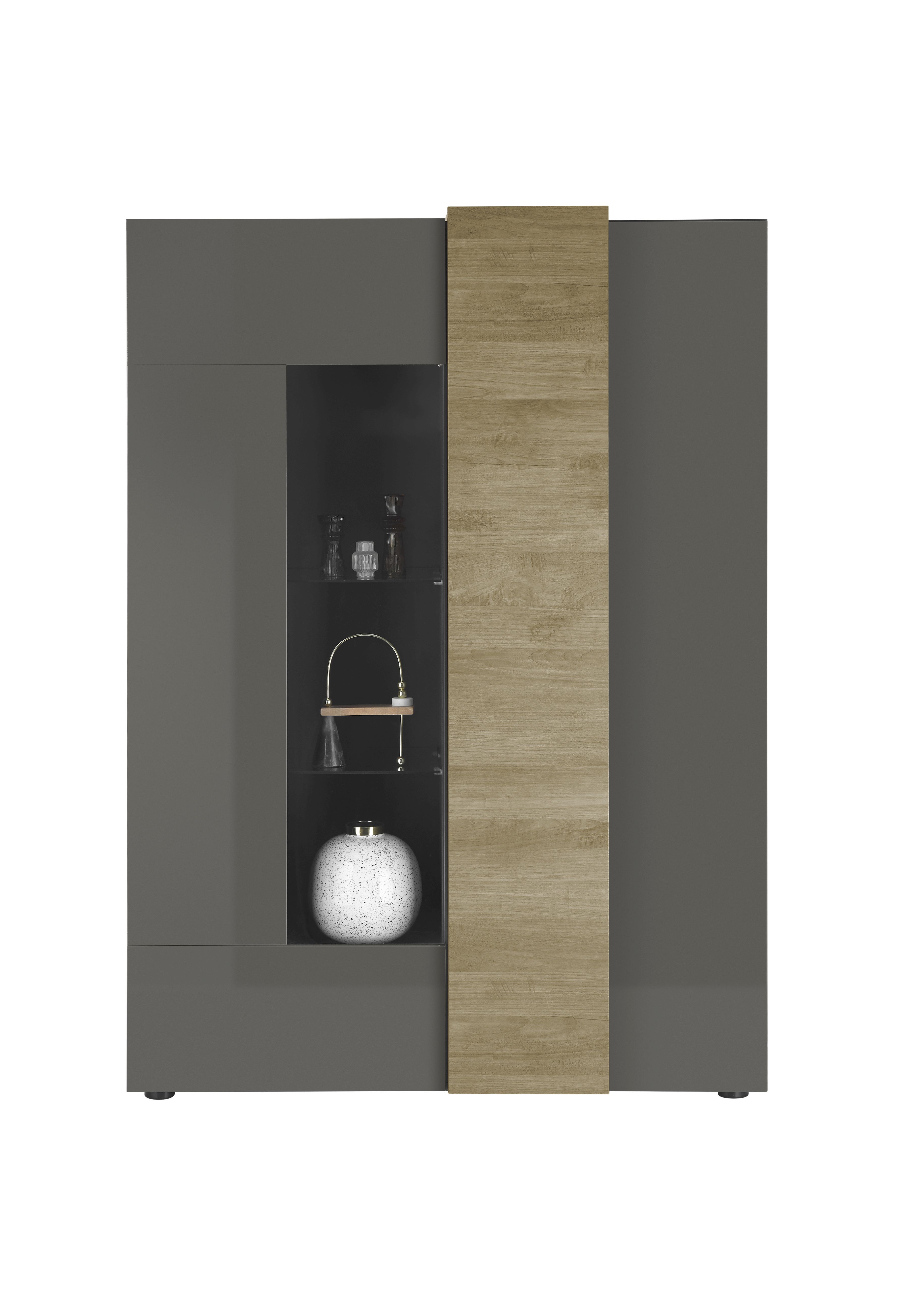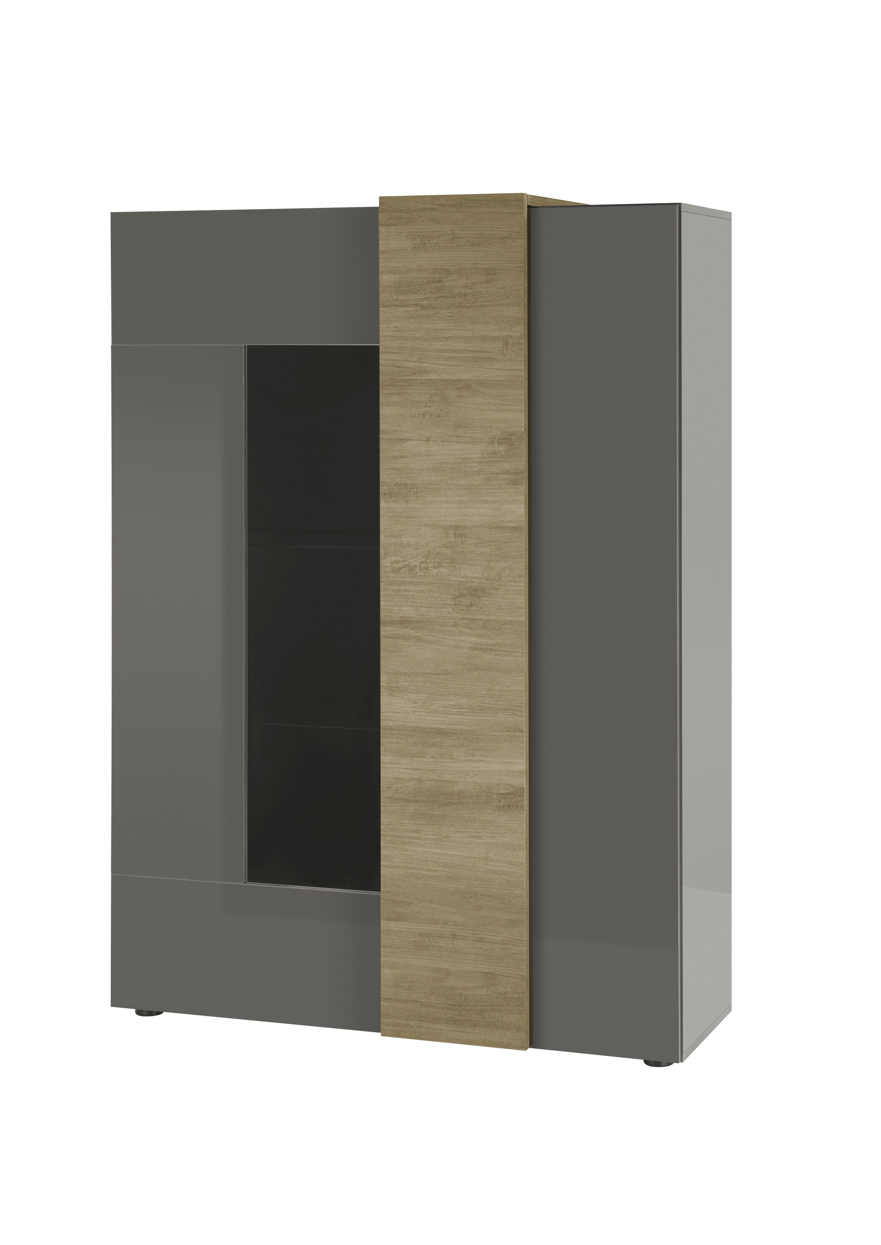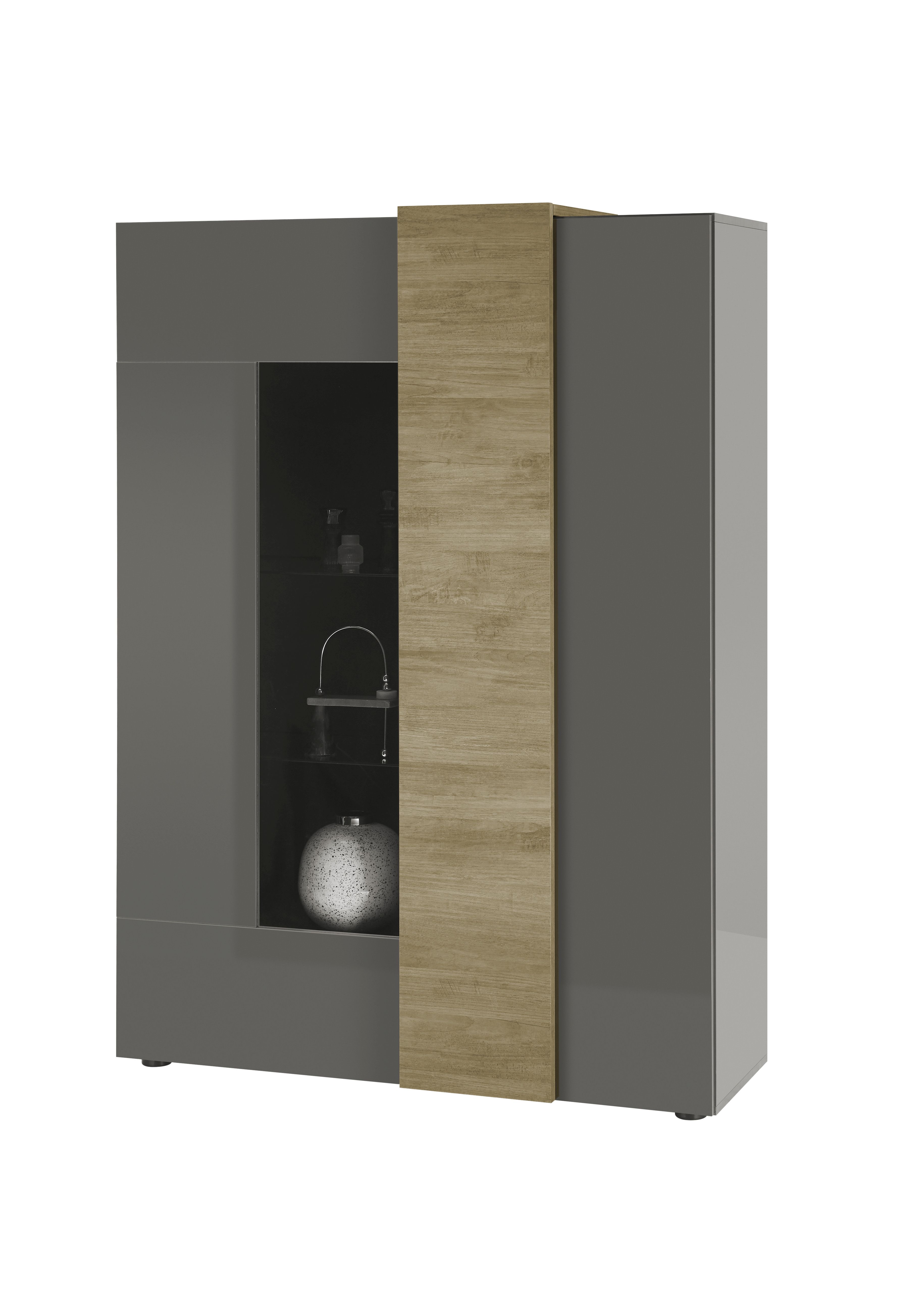 Front und Korpus: Hochglanz Dunkelgrau mit Absetzungen in Mercure Holznachbildung / Glas
