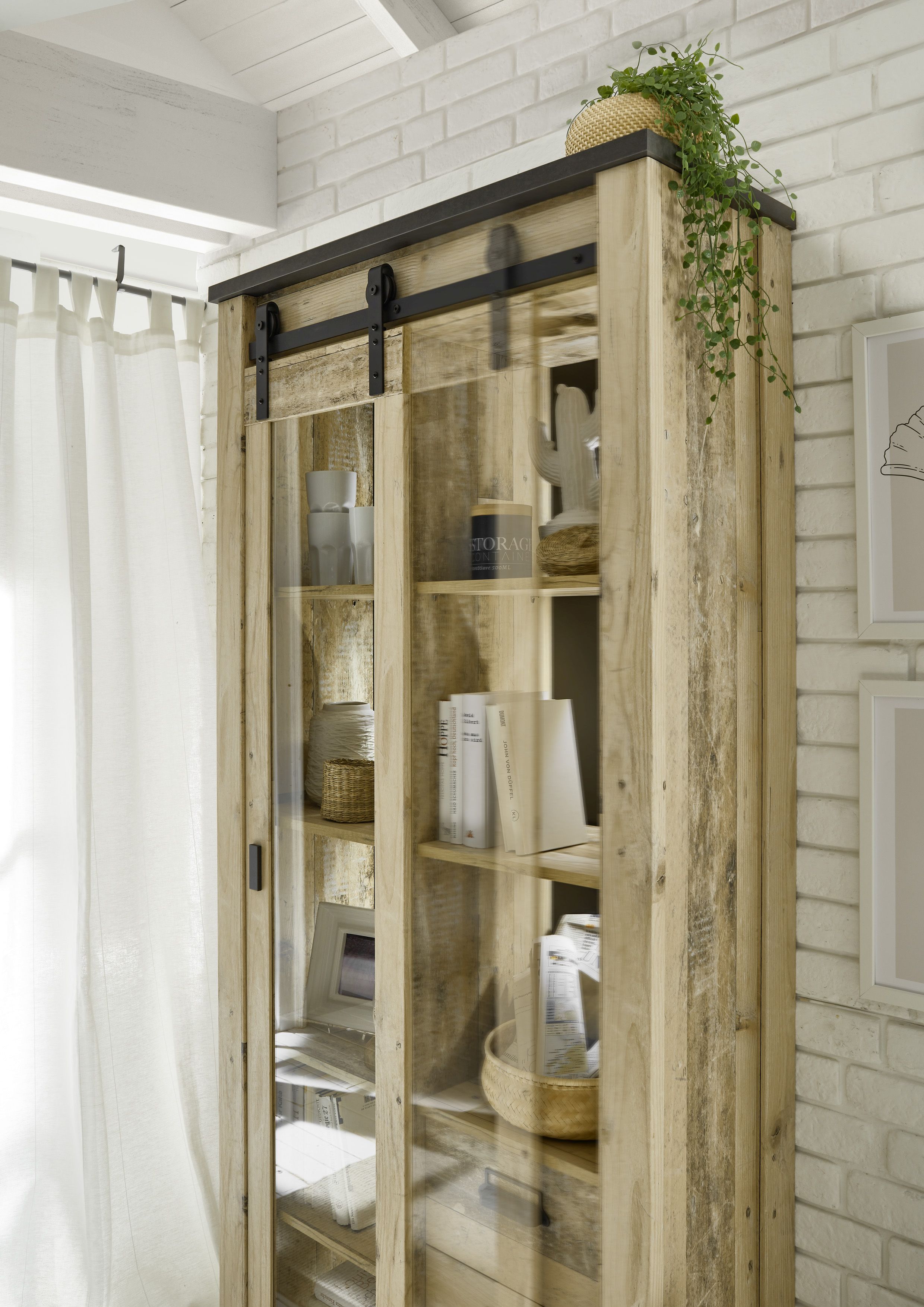 1 Glasrahmentür (Schiebetür), dahinter 4 Böden