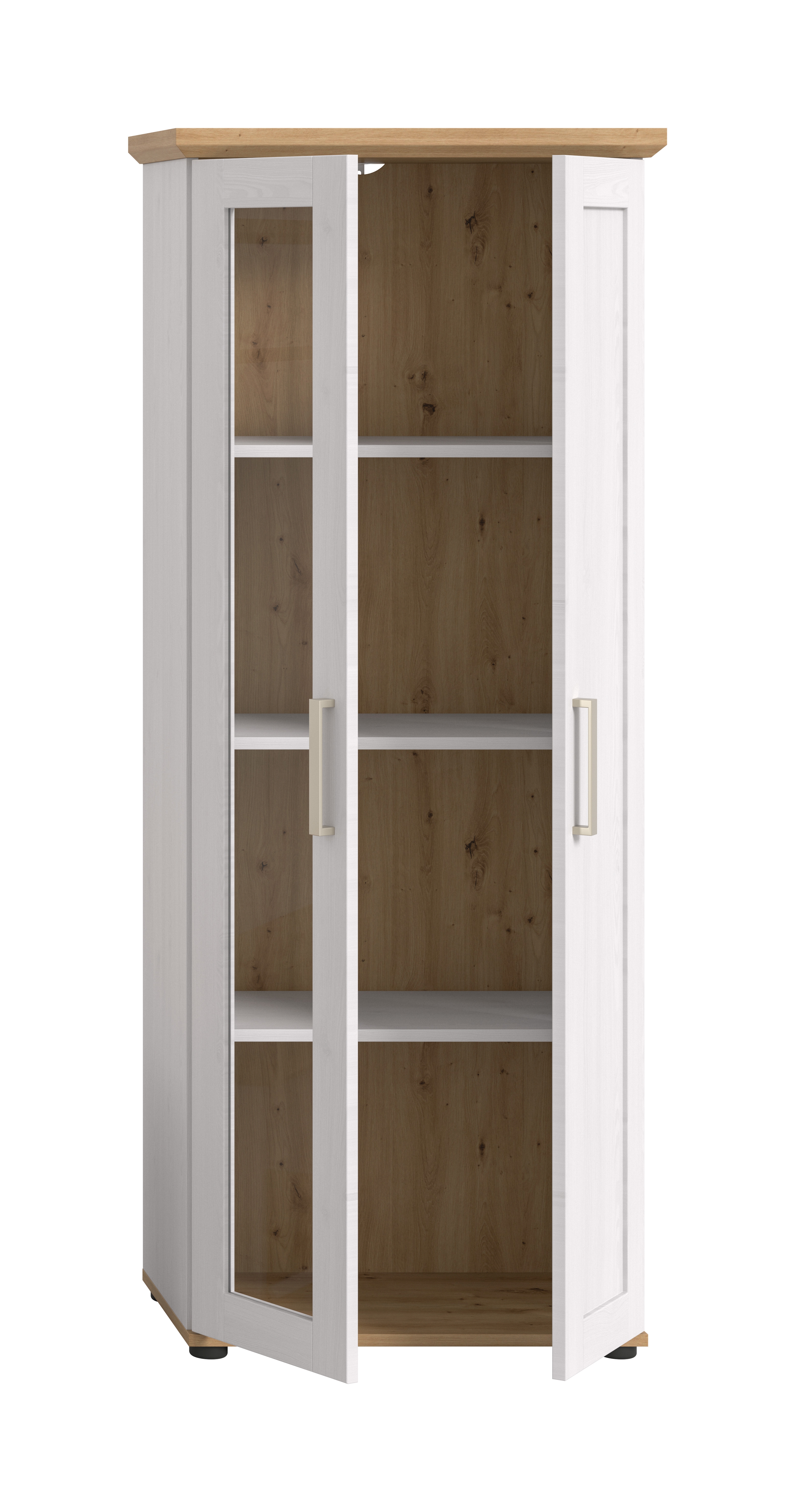 Präsentieren Sie Ihre Lieblingsstücke stilvoll in unserer eleganten Vitrine im Landhaus-Look! Ausgestattet mit einer Holztür und einer Glastür sowie drei herausnehmbaren, höhenverstellbaren Einlegeböden und vier Fächern, bietet sie sowohl Stauraum als auch eine ansprechende Präsentationsfläche. Der farblich abgesetzte Ober- und Unterboden rundet das moderne Design ab.