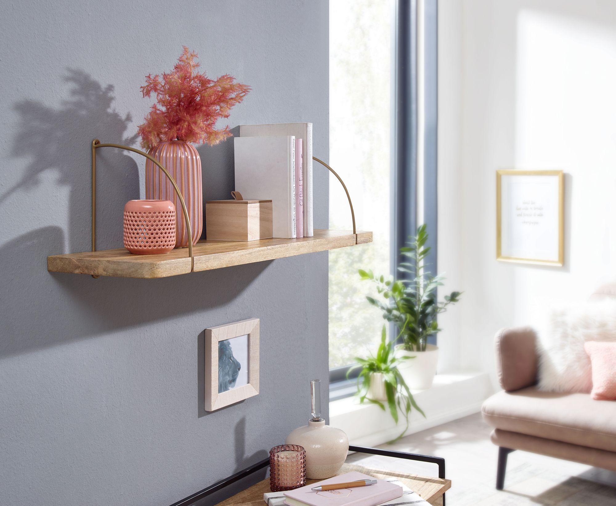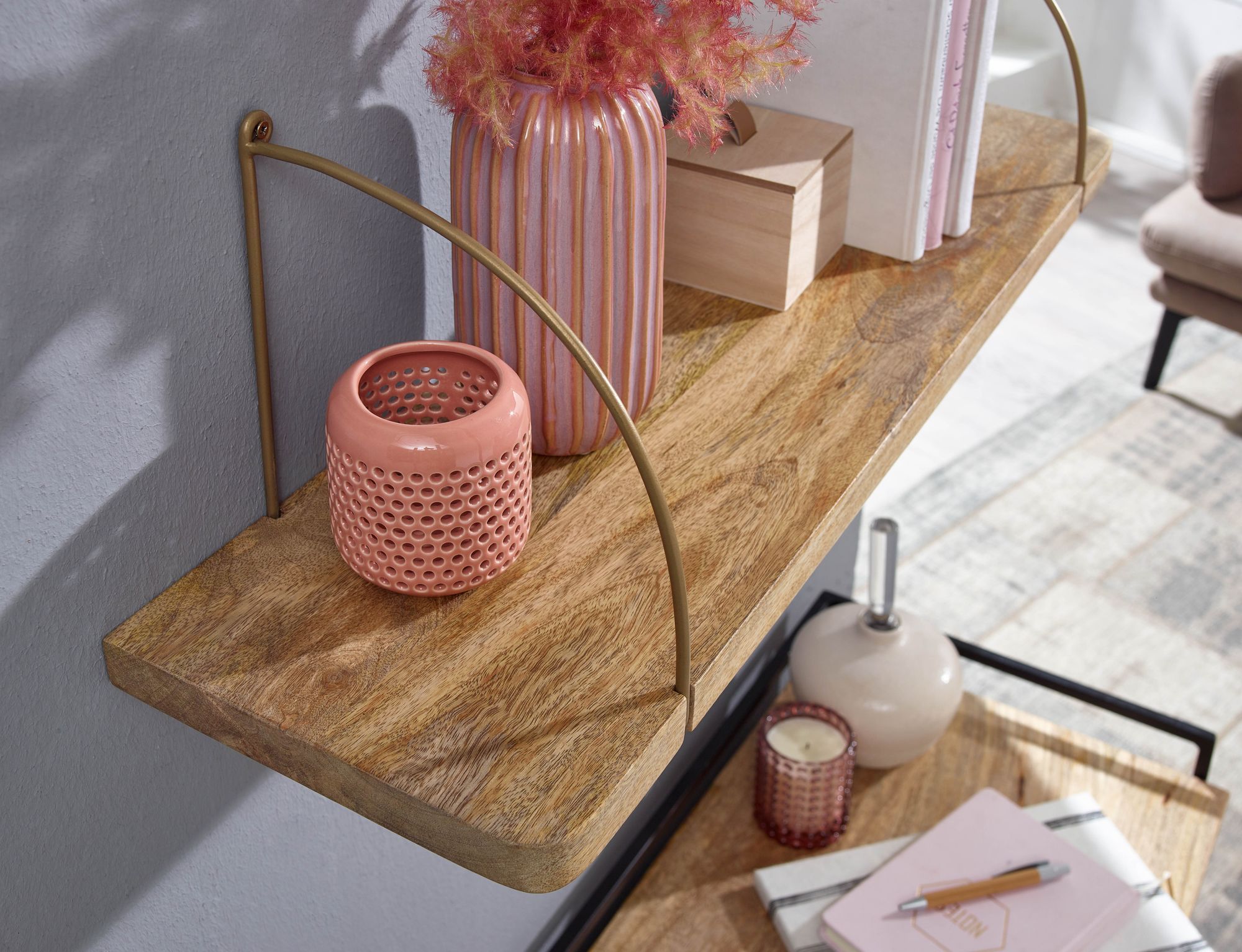 MATERIAL ✔ Die Ablageflächen sind massivem Mangoholz, welches zusätzlich mit klarem Schutzlack versiegelt ist. Die Halterungen bestehen aus pulverbeschichtetem Eisen (goldfarben).
