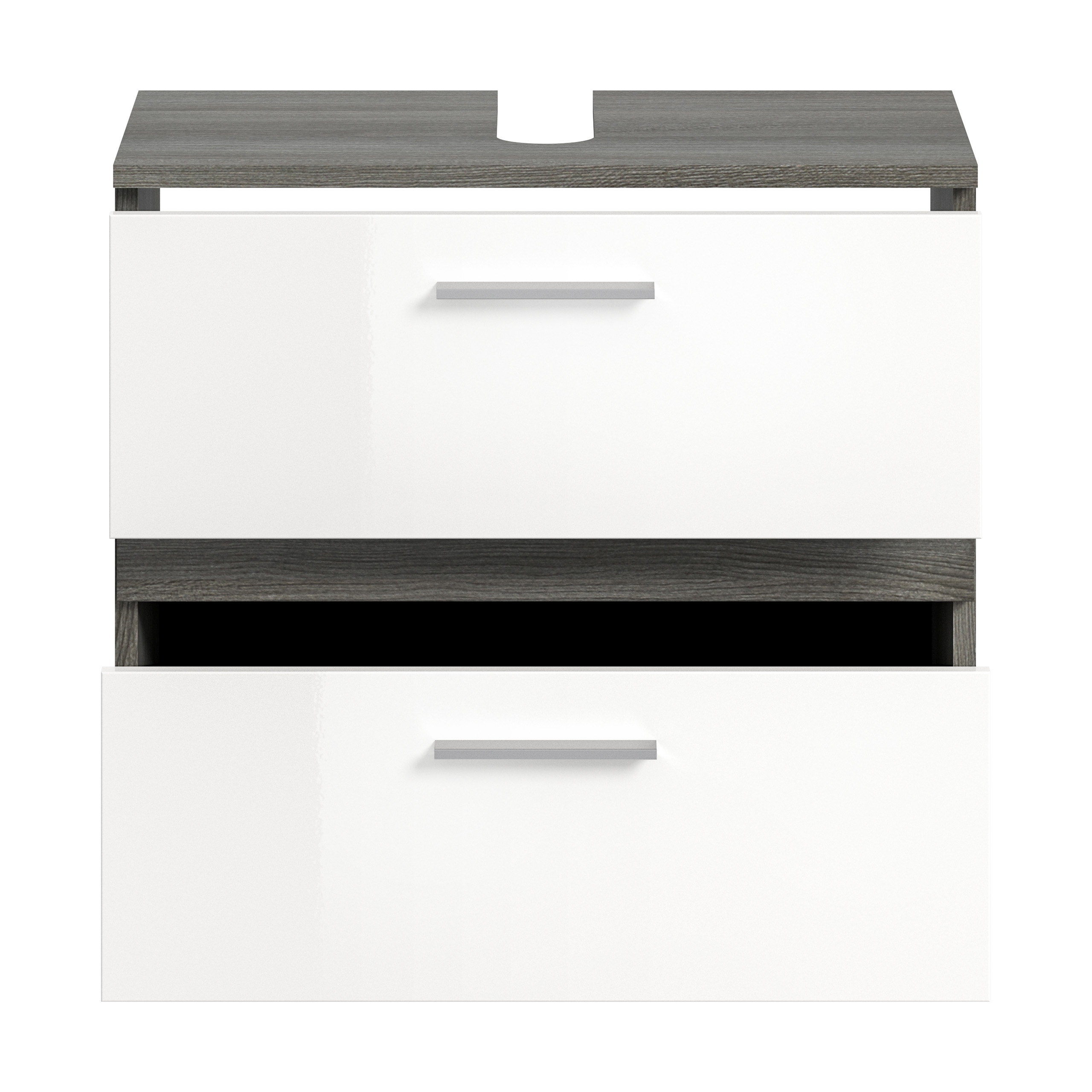 Entdecken Sie unseren Waschbeckenunterschrank mit den Maßen 60x57x34 cm in eleganter Rauchsilber-Nachbildung und strahlendem Weiß-Hochglanz-Finish. Mit seinem stilvollen Design und großzügigem Stauraum ist dieser Schrank die ideale Ergänzung für Ihr Badezimmer. Eine perfekte Kombination aus Ästhetik und Funktionalität.