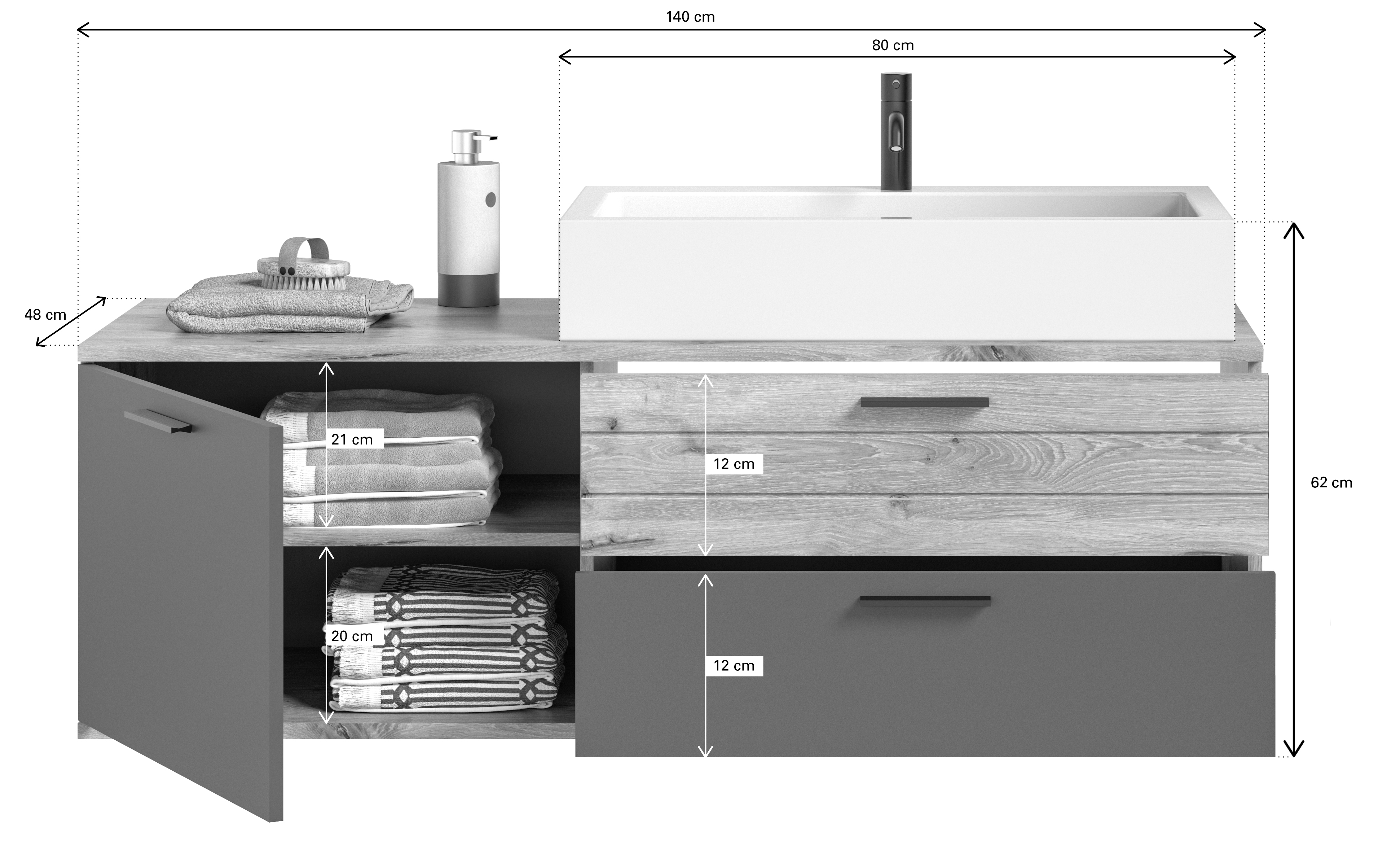 - Funktionalität: Bietet eine großzügige Waschbeckenfläche und ausreichend Stauraum für Badutensilien dank des geräumigen Unterschranks und der zusätzlichen Ablagefläche. Die großzügigen Abmessungen ermöglichen eine komfortable Nutzung und bieten viel Platz für die tägliche Pflege.
