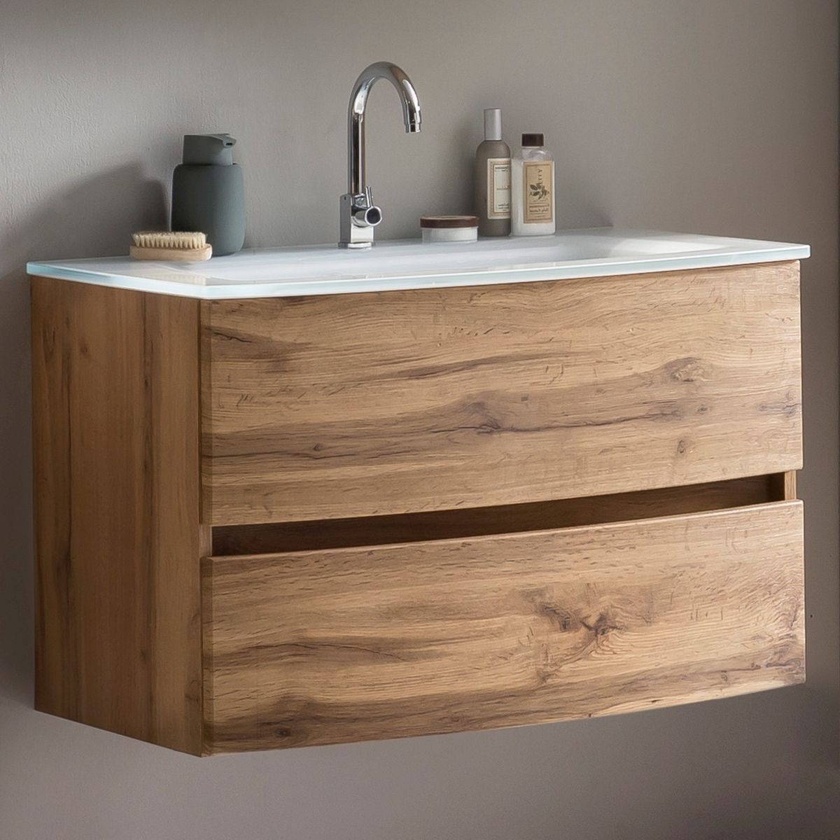 1 Waschbeckenunterschrank mit 2 Metall-Vollauszügen mit Softclose-Funktion, inklusiv gebogenen Fronten