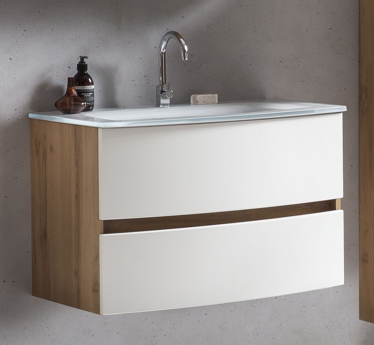 1 Waschbeckenunterschrank mit 2 Metall-Vollauszügen mit Softclose-Funktion, inklusiv gebogenen Fronten