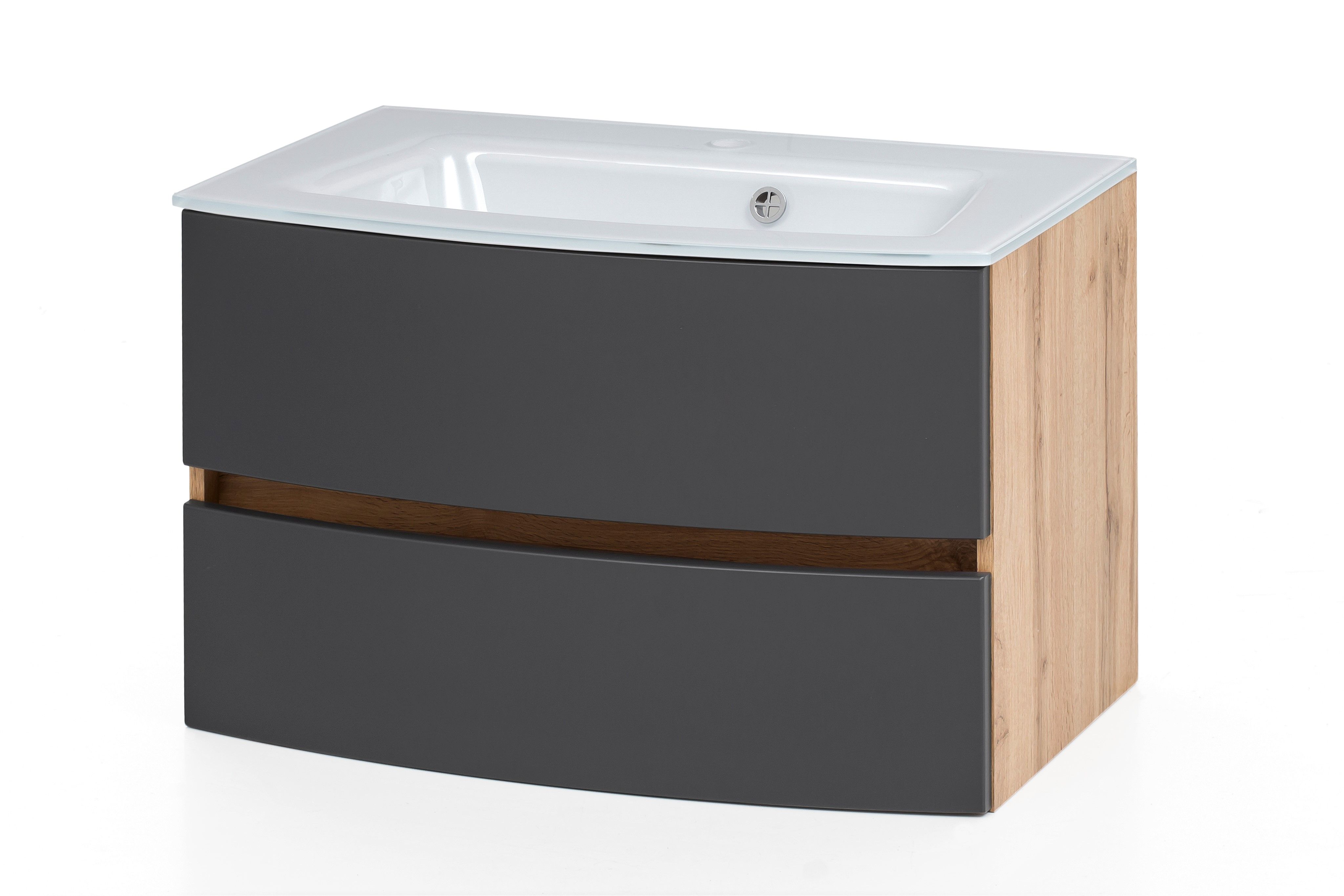 1 Waschbeckenunterschrank mit 2 Metall-Vollauszügen mit Softclose-Funktion, inklusiv gebogenen Fronten