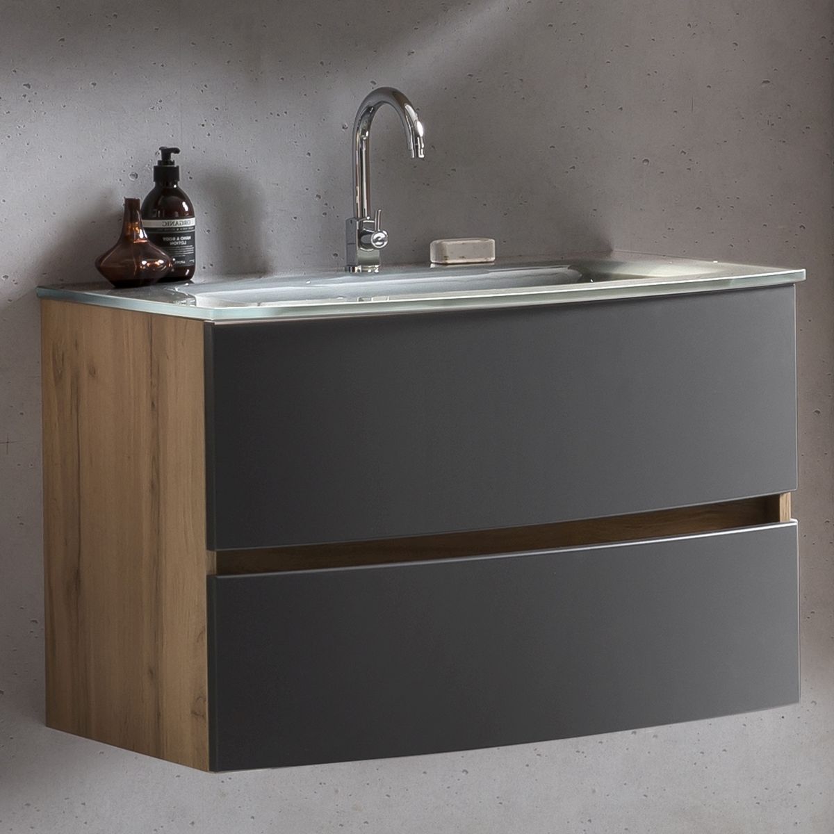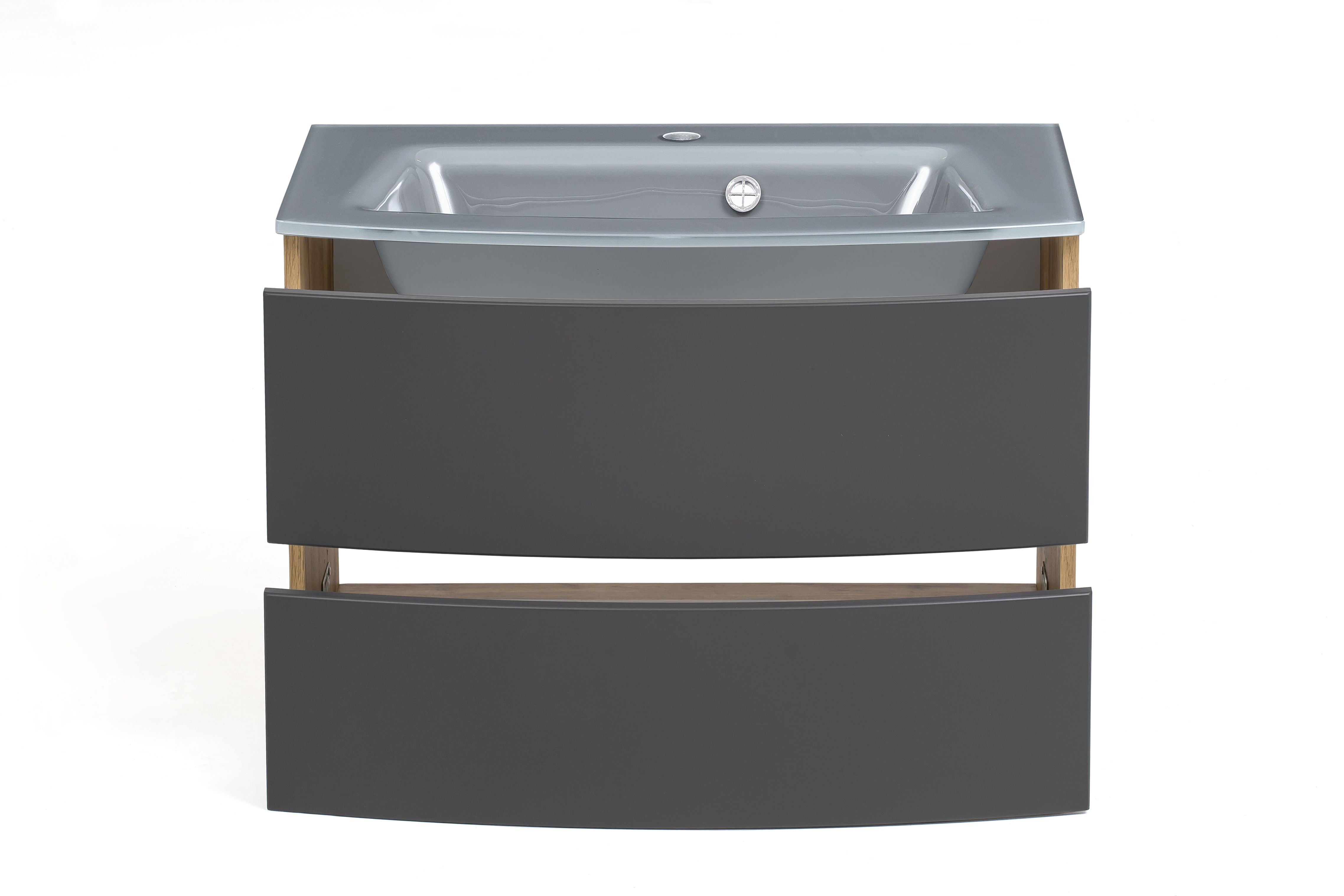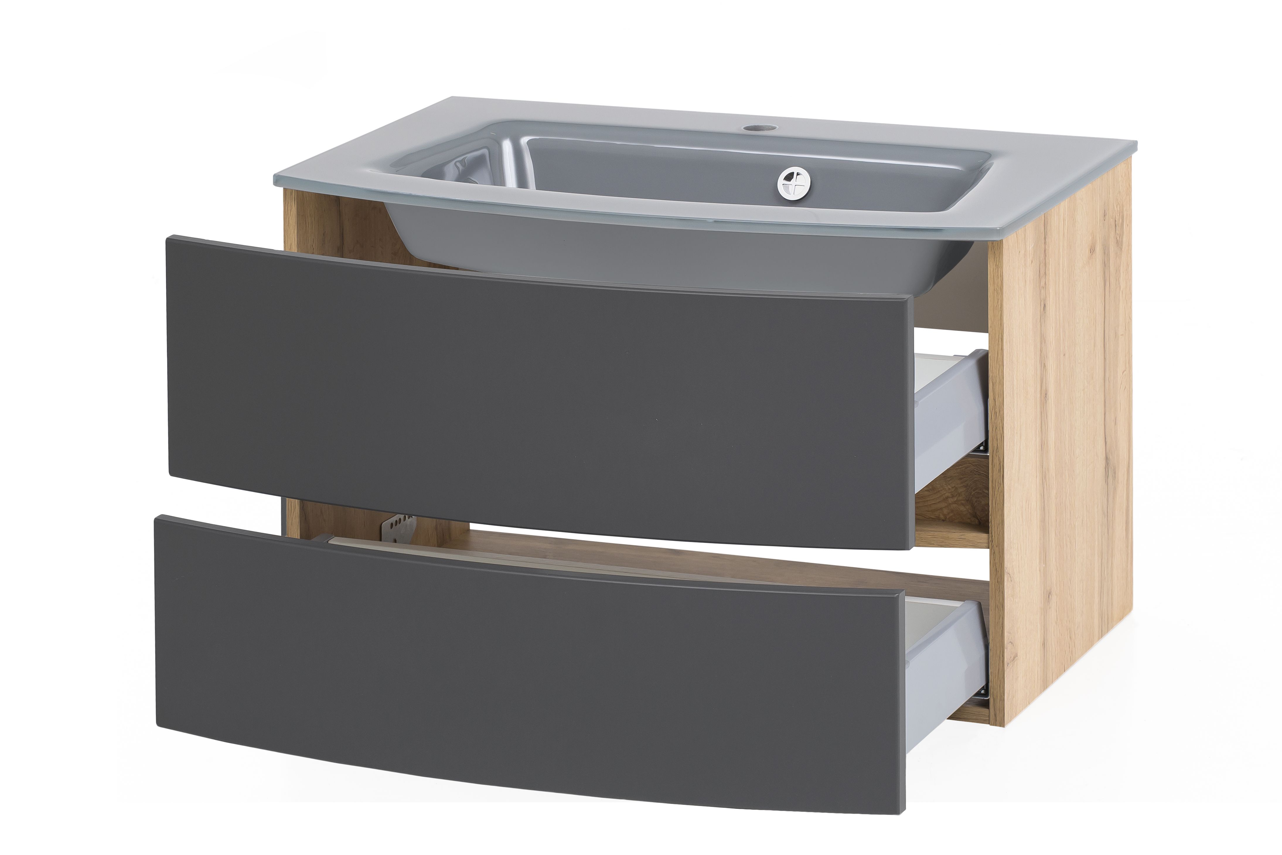 1 Waschbeckenunterschrank mit 2 Metall-Vollauszügen mit Softclose-Funktion, inklusiv gebogenen Fronten