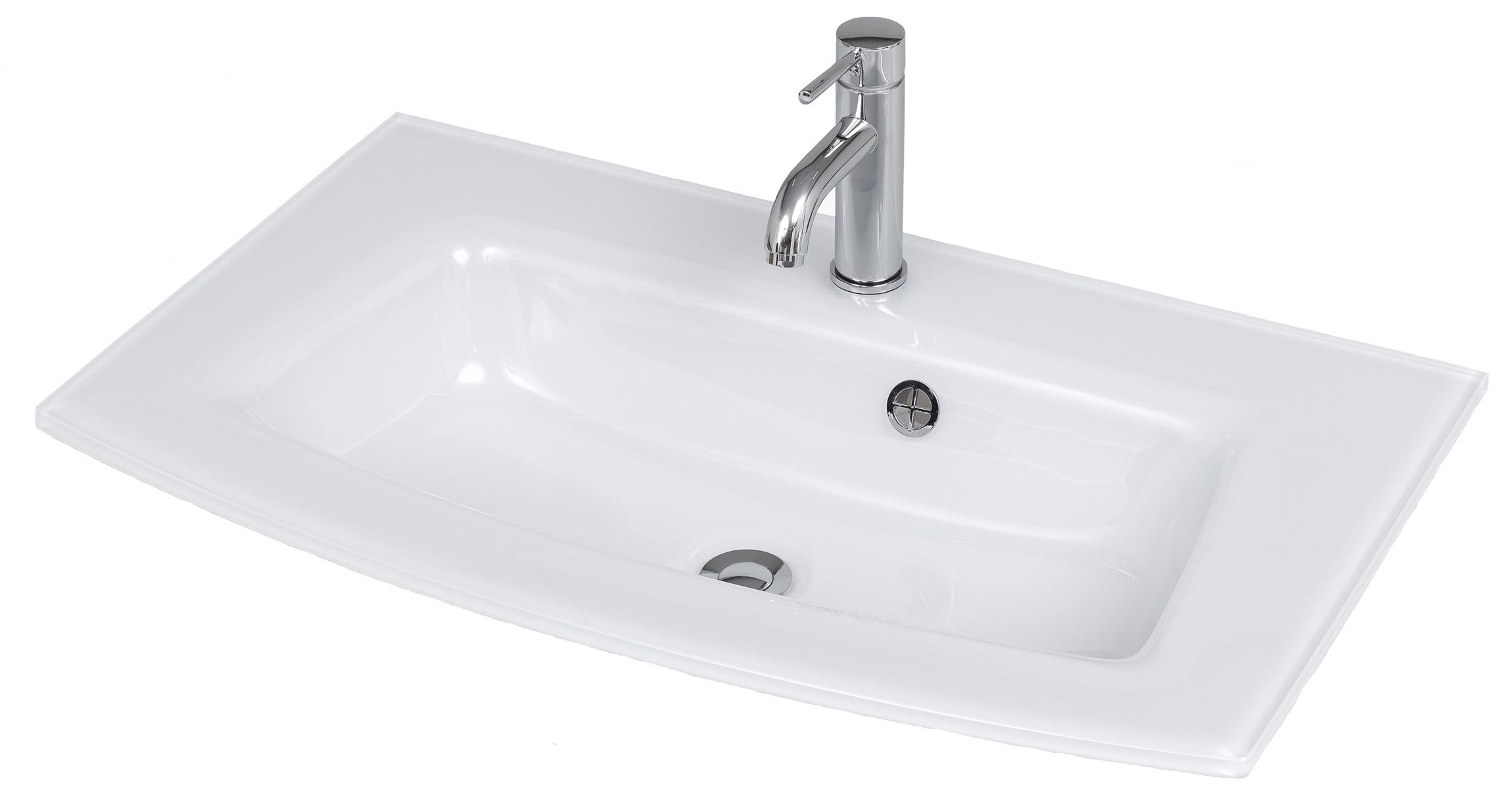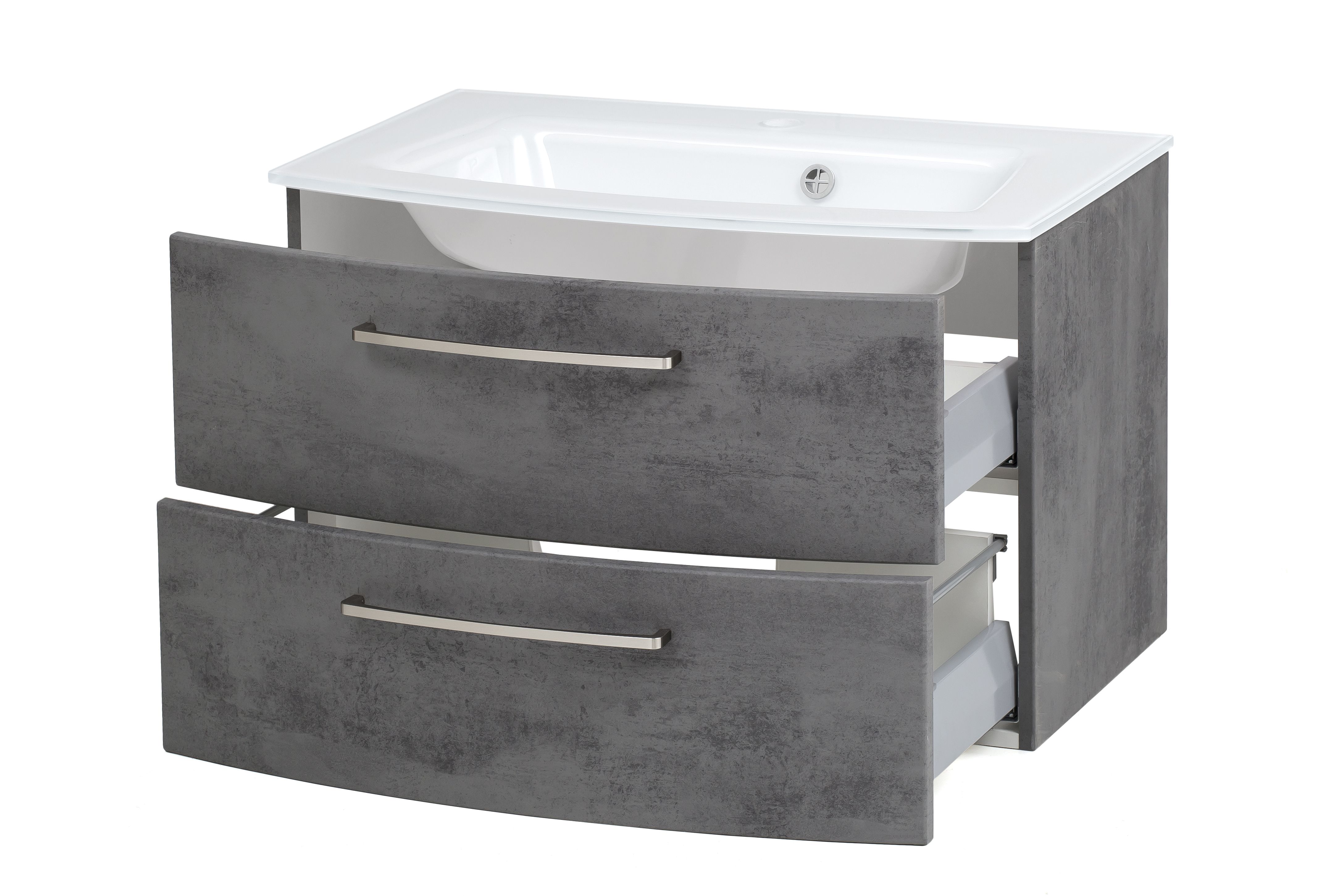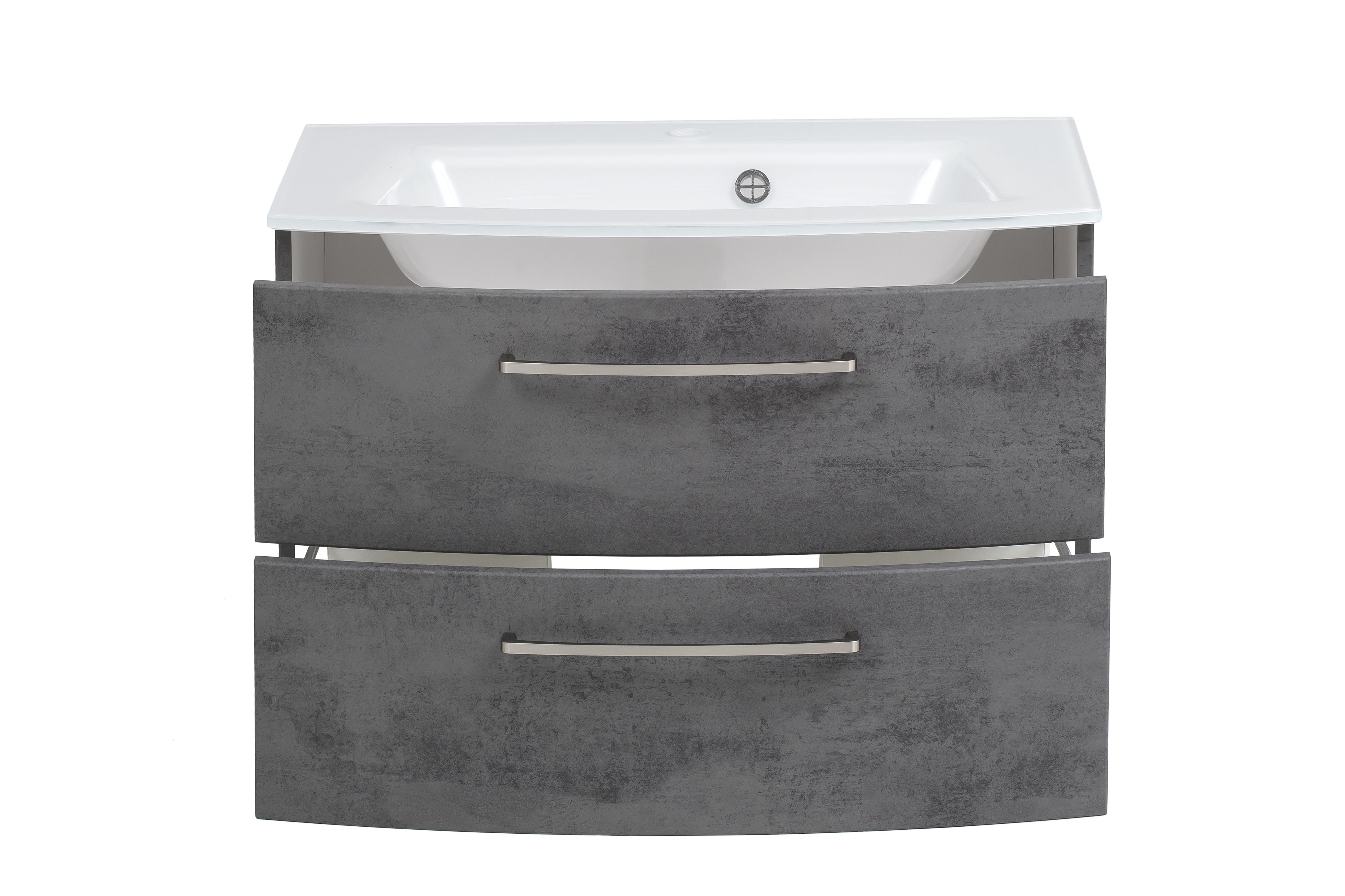 1 Waschbeckenunterschrank mit 2 Schubkästen mit Softclose-Funktion (Vollauszüge), unterer Auszug mit Reling inklusive gebogenen Fronten
