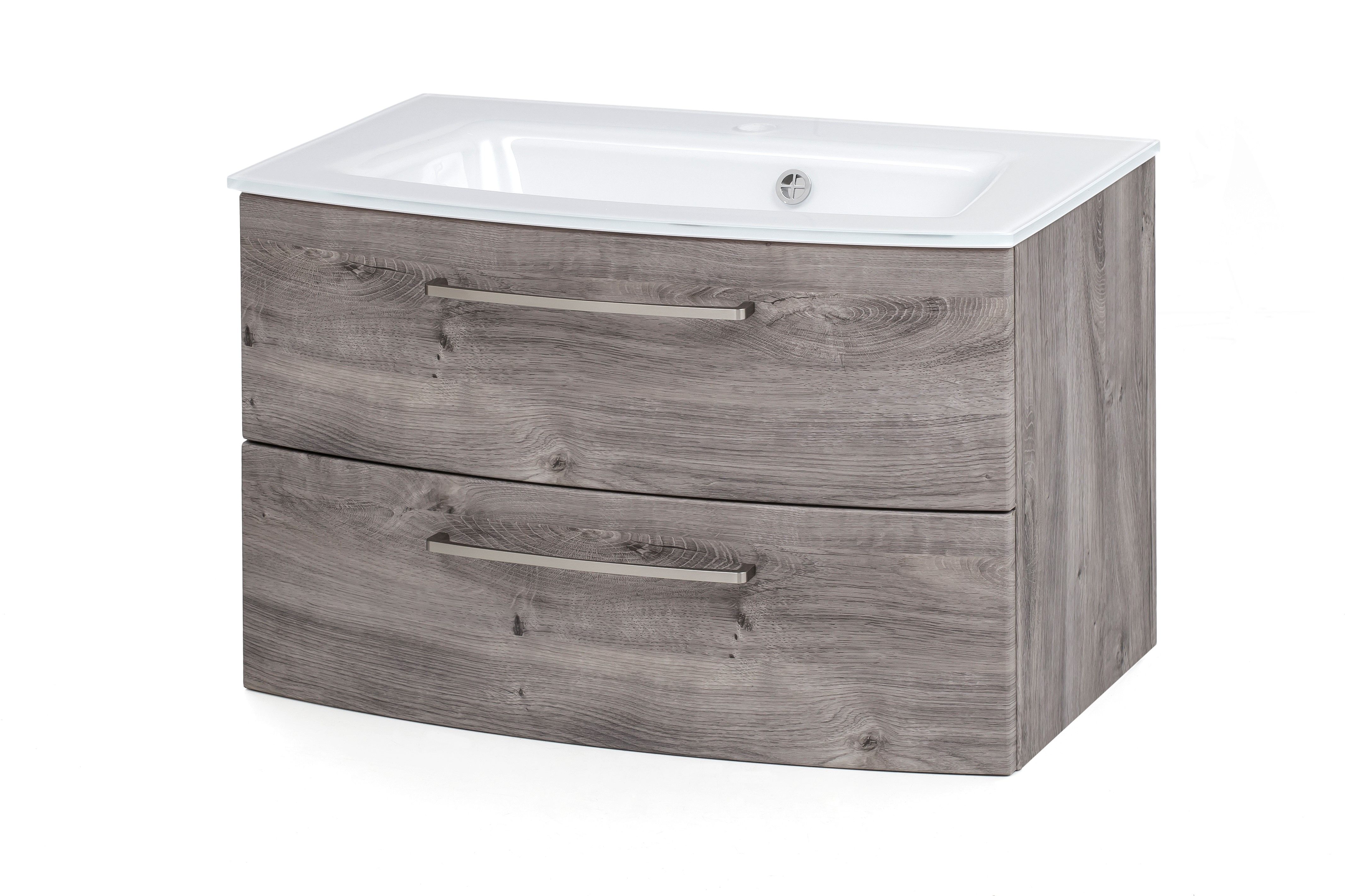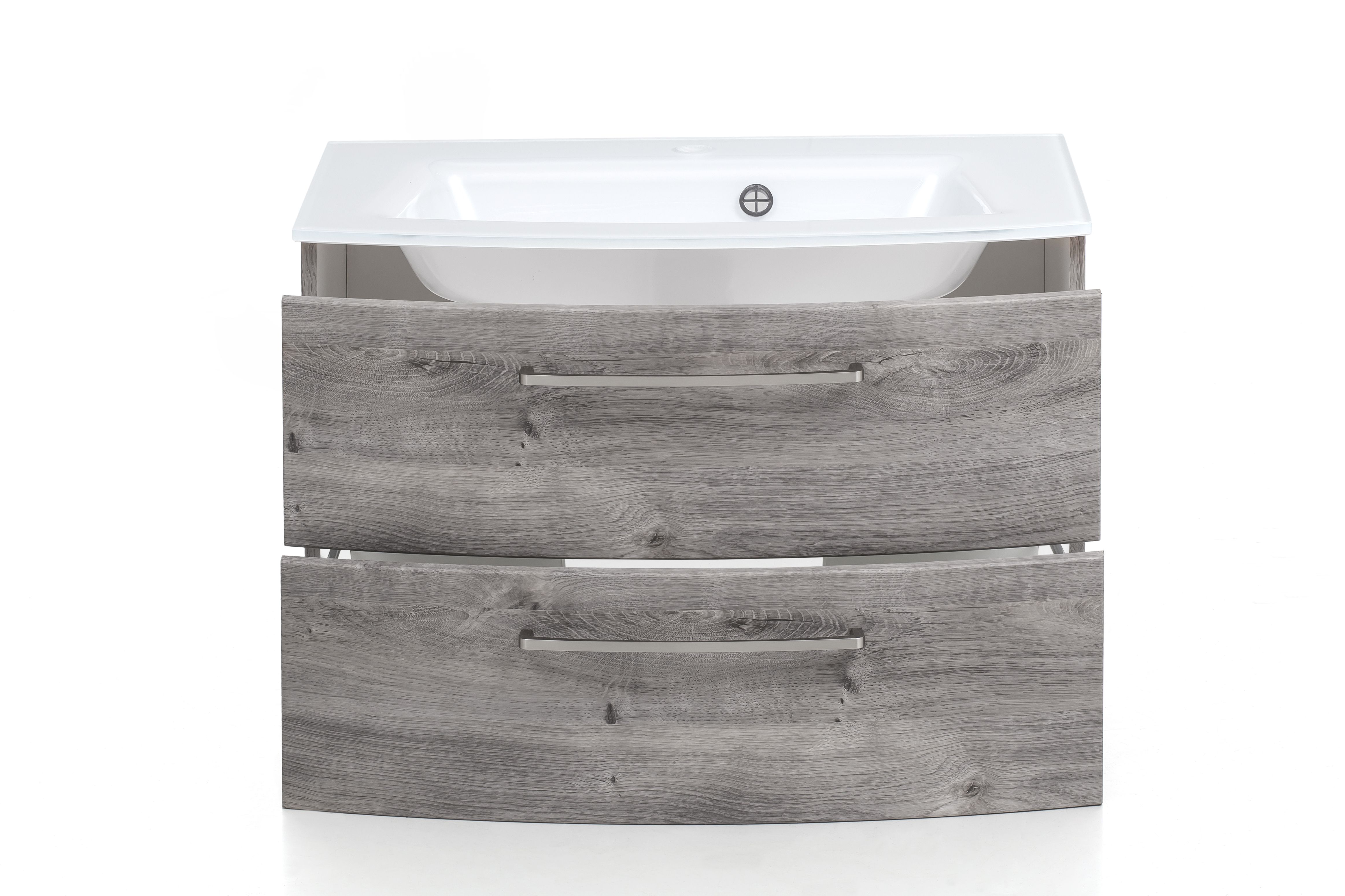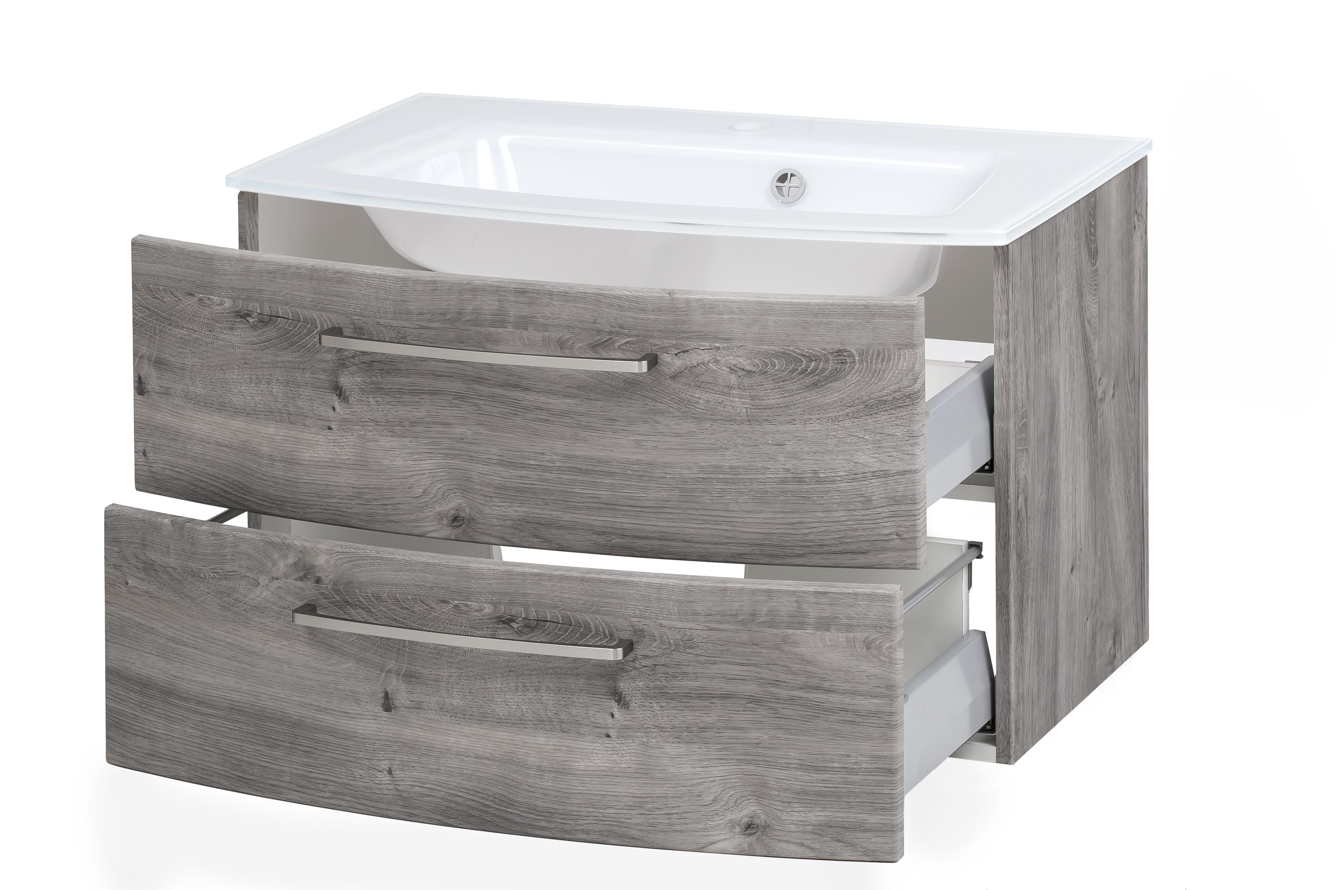 1 Waschbeckenunterschrank mit 2 Schubkästen mit Softclose-Funktion (Vollauszüge), unterer Auszug mit Reling inklusive gebogenen Fronten