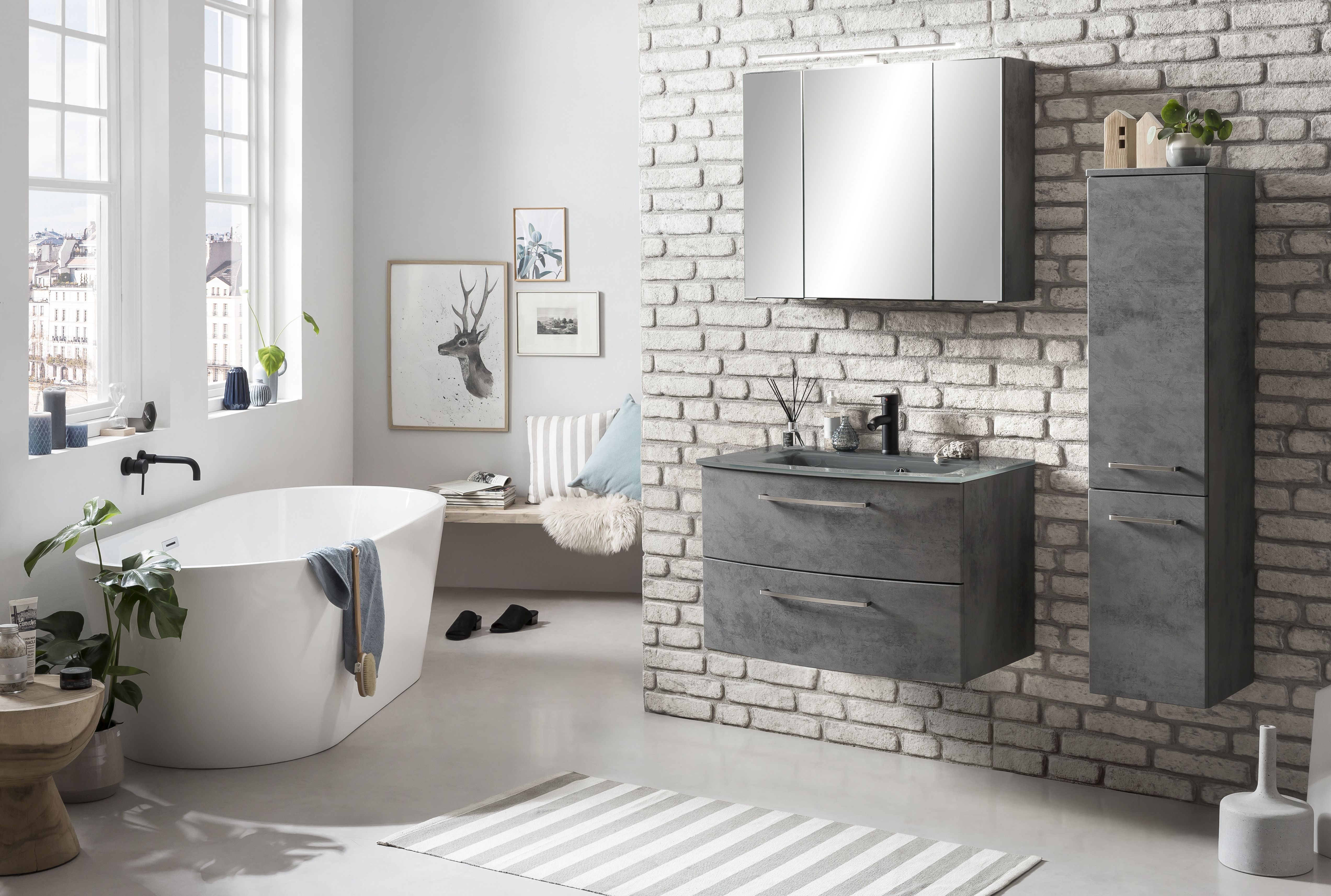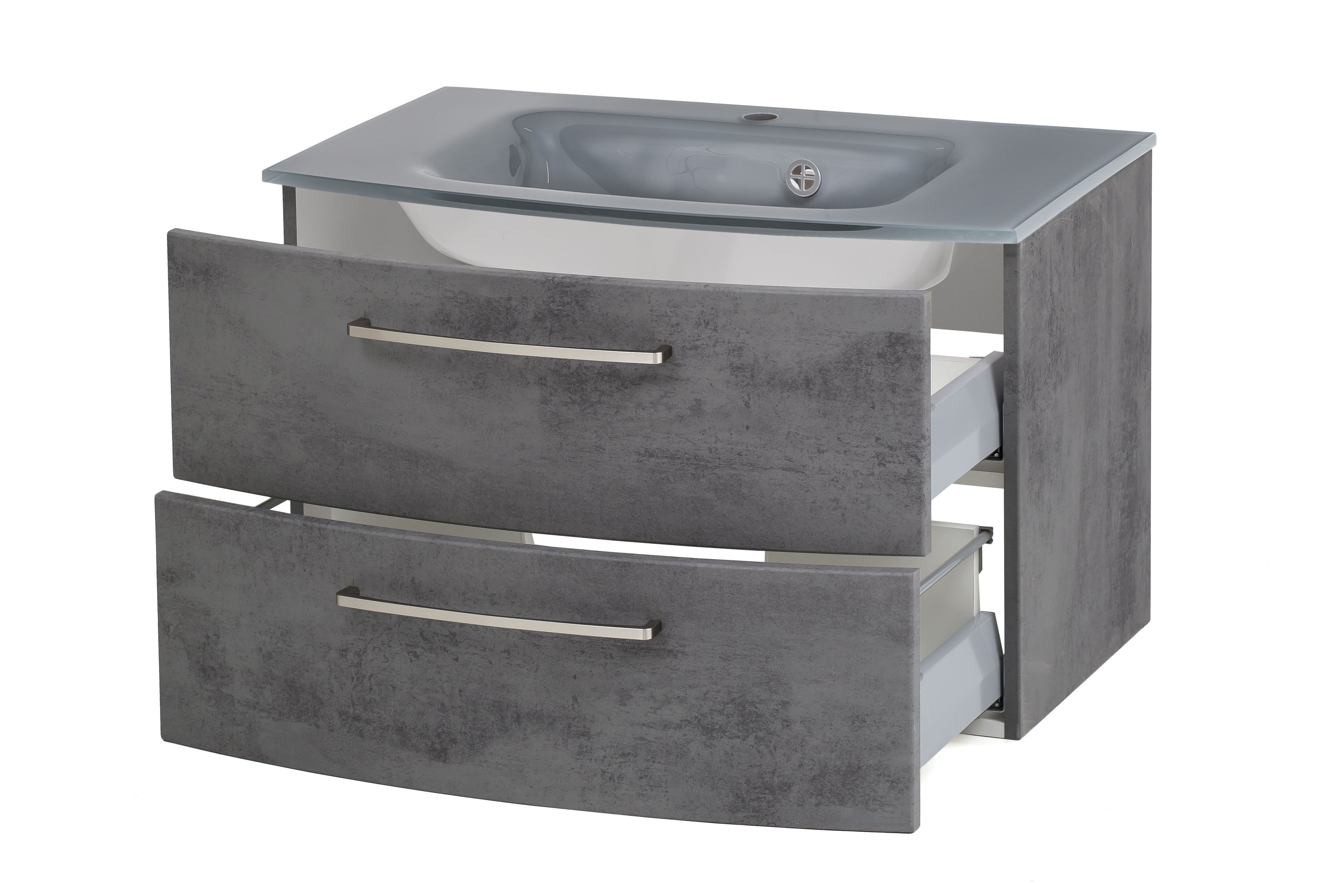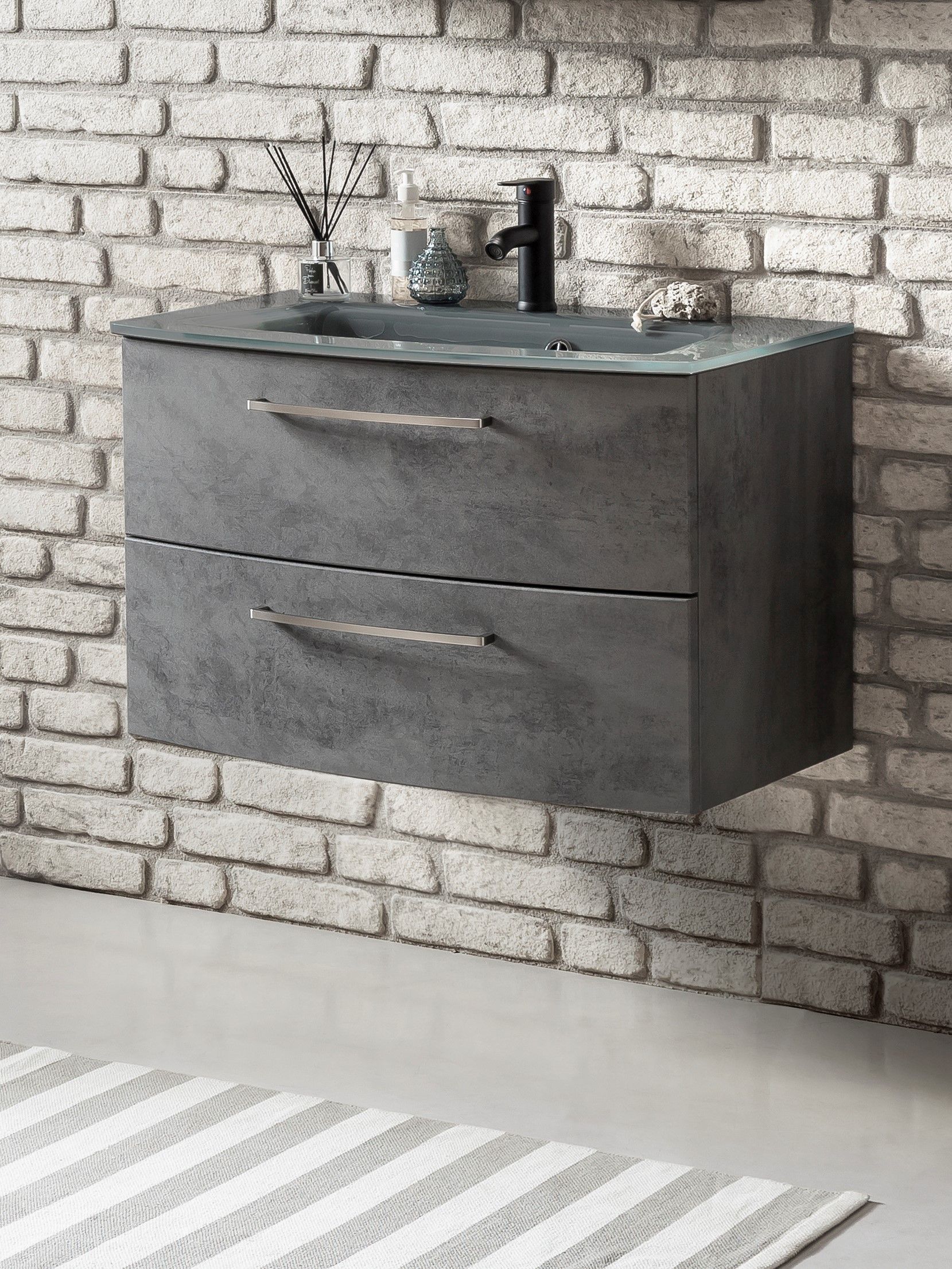 1 Waschbeckenunterschrank mit 2 Schubkästen mit Softclose-Funktion (Vollauszüge), unterer Auszug mit Reling inklusive gebogenen Fronten