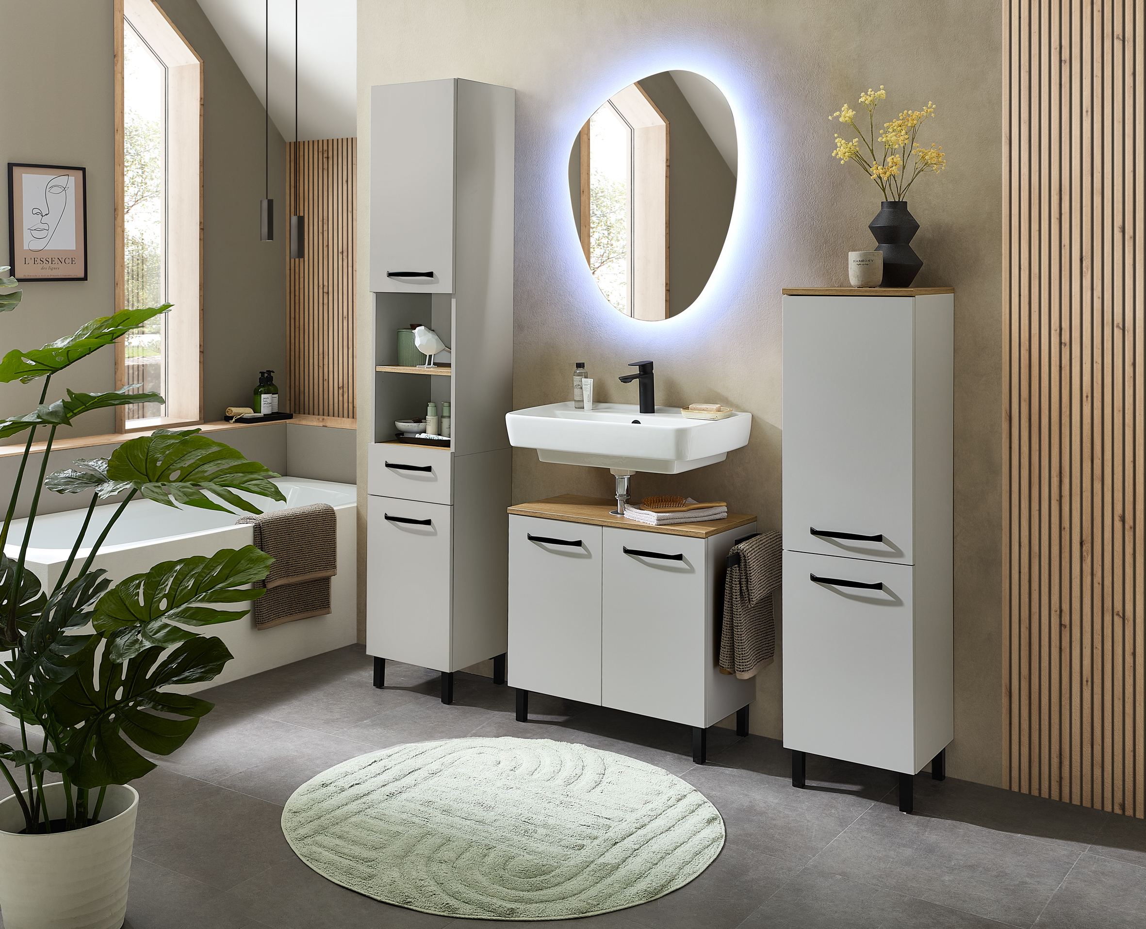 Der Waschbeckenunterschrank wird in Deutschland hergestellt und überzeugt durch hochwertige Verarbeitung, langlebige Materialien und präzise Fertigung, für langfristige Freude im Badezimmer.