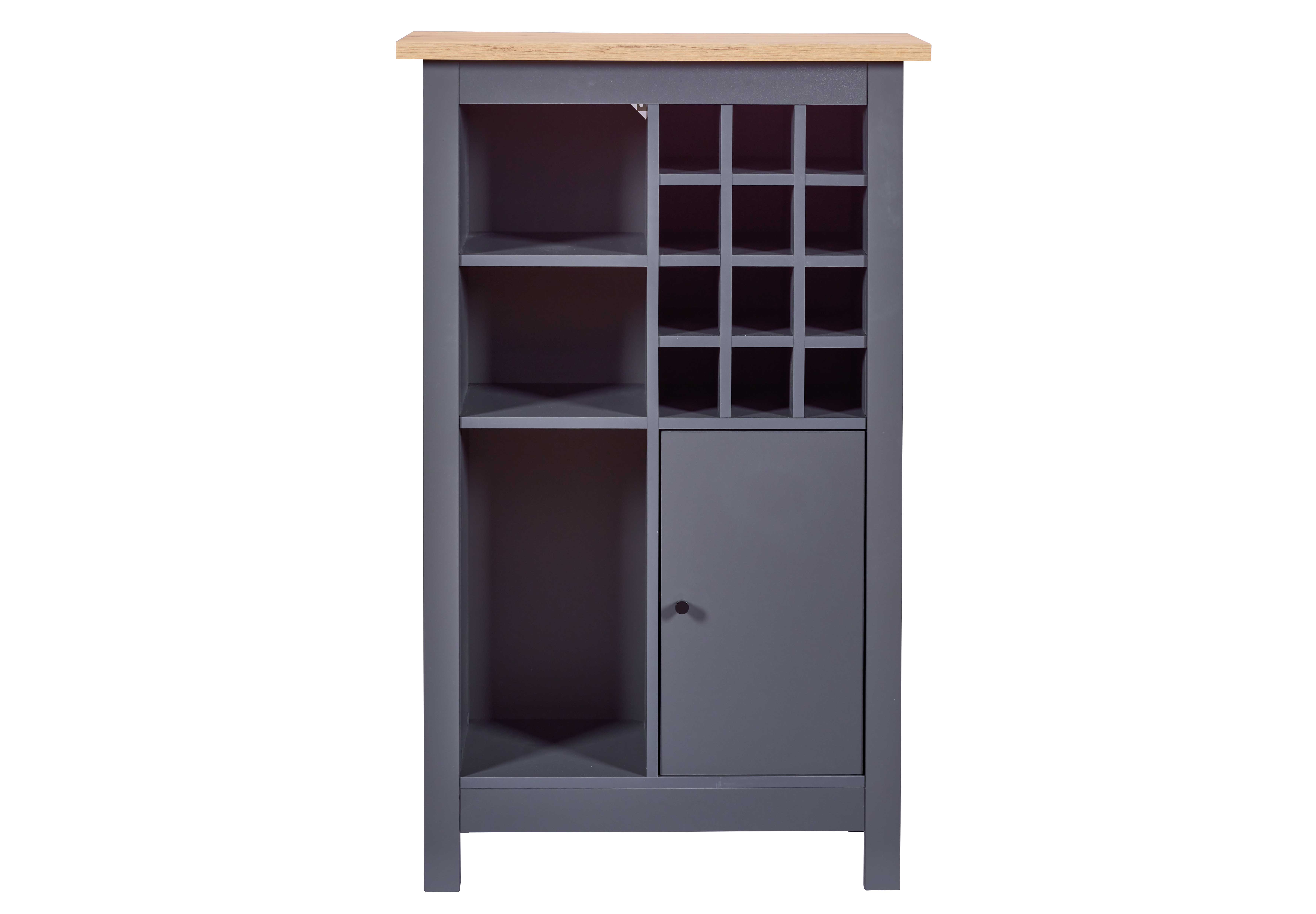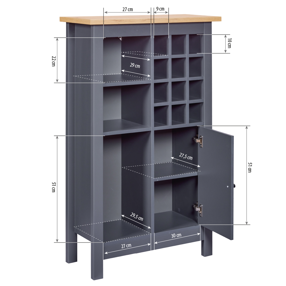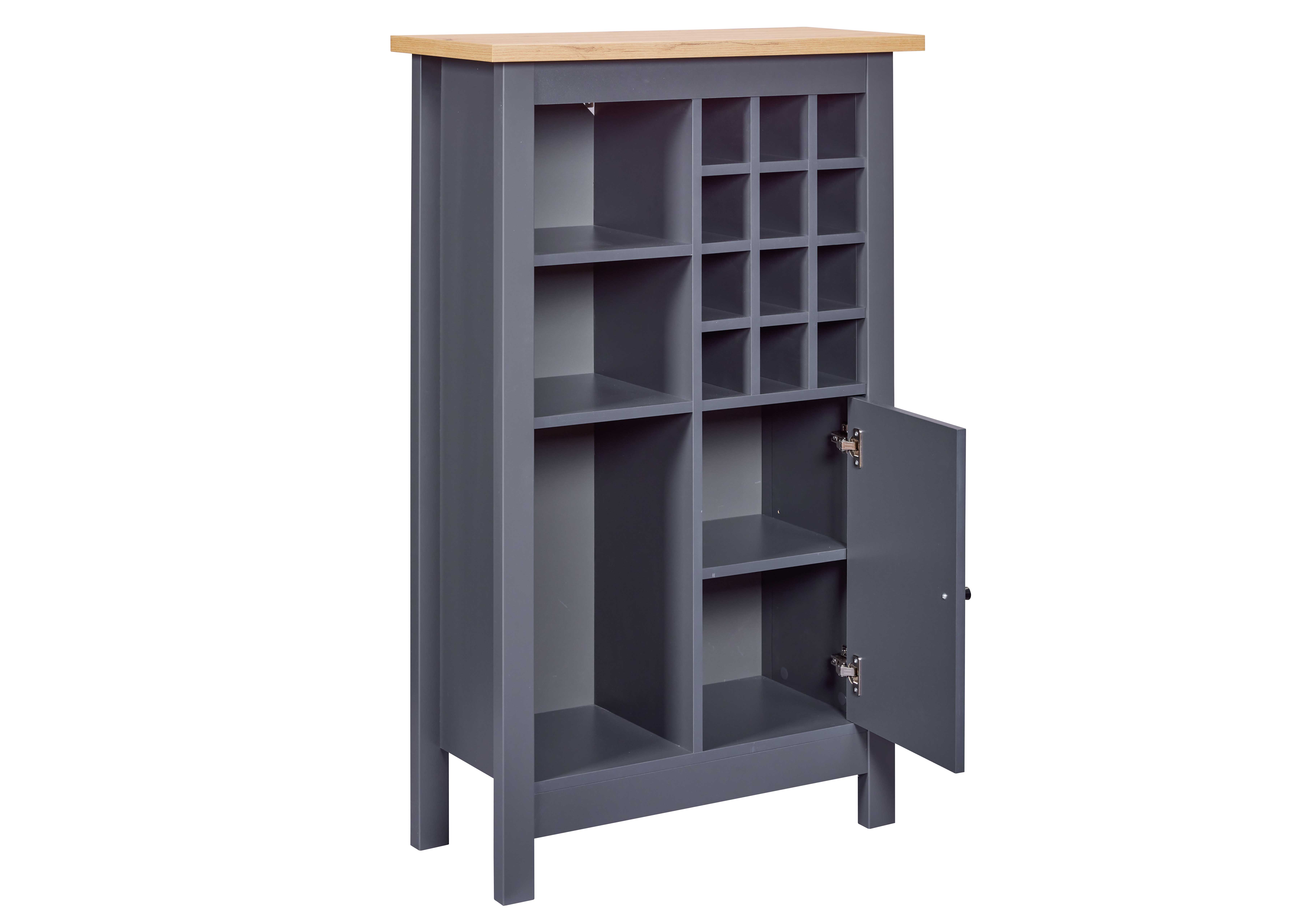 Mit seinen Maßen von 76,8 x 33 x 124,4 cm passt dieser Schrank perfekt in Ihr Zuhause und bietet gleichzeitig ausreichend Platz für Ihre Weinflaschen. Er verfügt über drei große Fächer und zwölf kleine Fächer, die speziell für die sichere und stilvolle Aufbewahrung Ihrer Flaschen konzipiert wurden. Eine Tür sorgt dafür, dass Ihre Weine vor Staub und anderen äußeren Einflüssen geschützt sind, während das elegante Anthrazit-Finish dem Schrank eine zeitlose Eleganz verleiht.