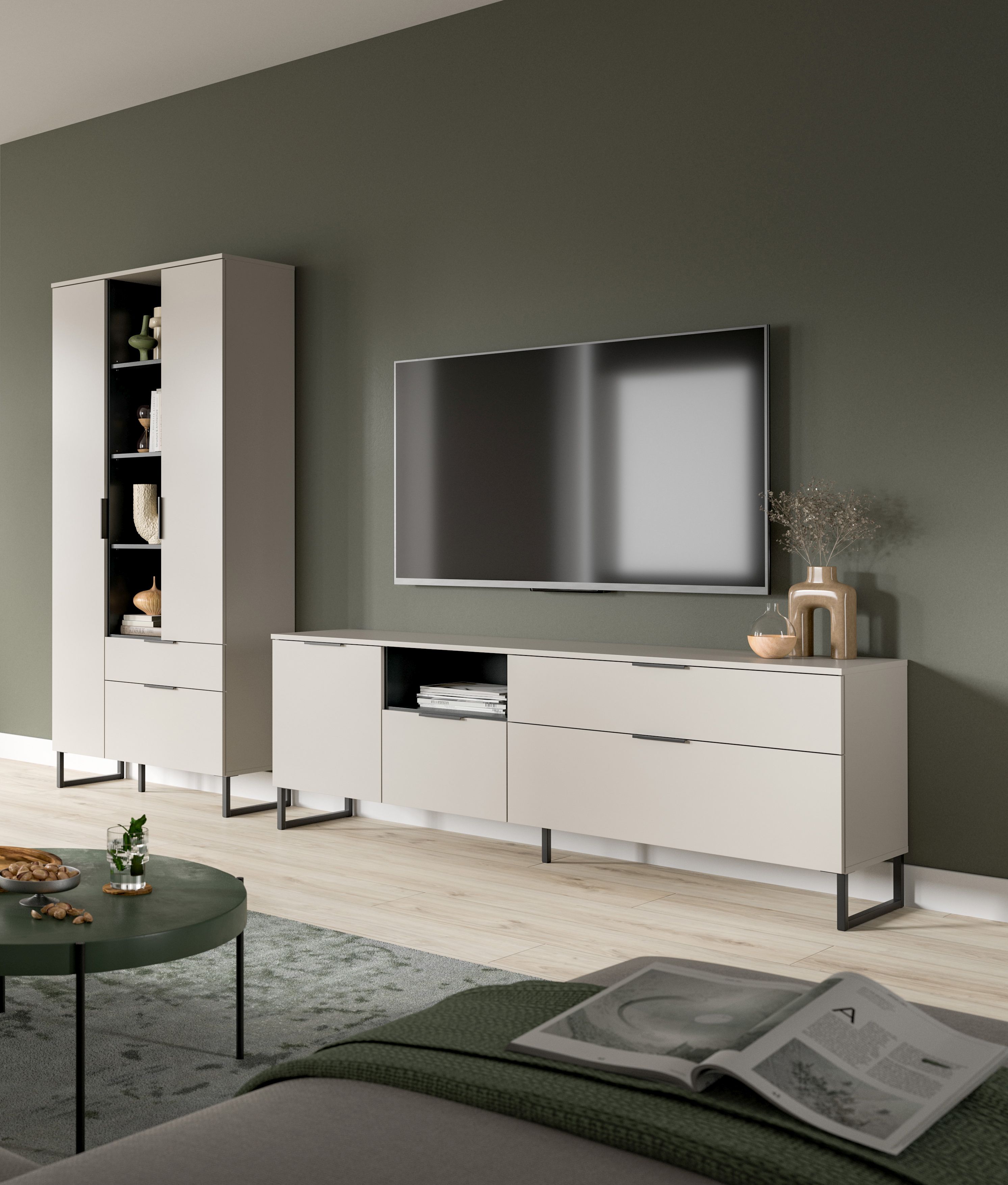 Die 2-teilige Wohnkombination in Kaschmir Nachbildung (290 x 192 x 41 cm) besteht aus einer Stauraumtype und einem TV Lowboard. Die pflegeleichte Oberfläche in trendiger Farbausführung sorgt für eine elegante Optik und einfache Reinigung. Diese Kombination bietet viel Stauraum zur Aufbewahrung und Organisation deiner Utensilien und unterstützt eine ordentliche und stilvolle Gestaltung deines Wohnzimmers. Die hochwertigen Möbel sind robust und langlebig und lassen sich flexibel kombinieren. Mit dieser Wohnkombination schaffst du eine harmonische Verbindung aus Design, Funktionalität und Komfort.