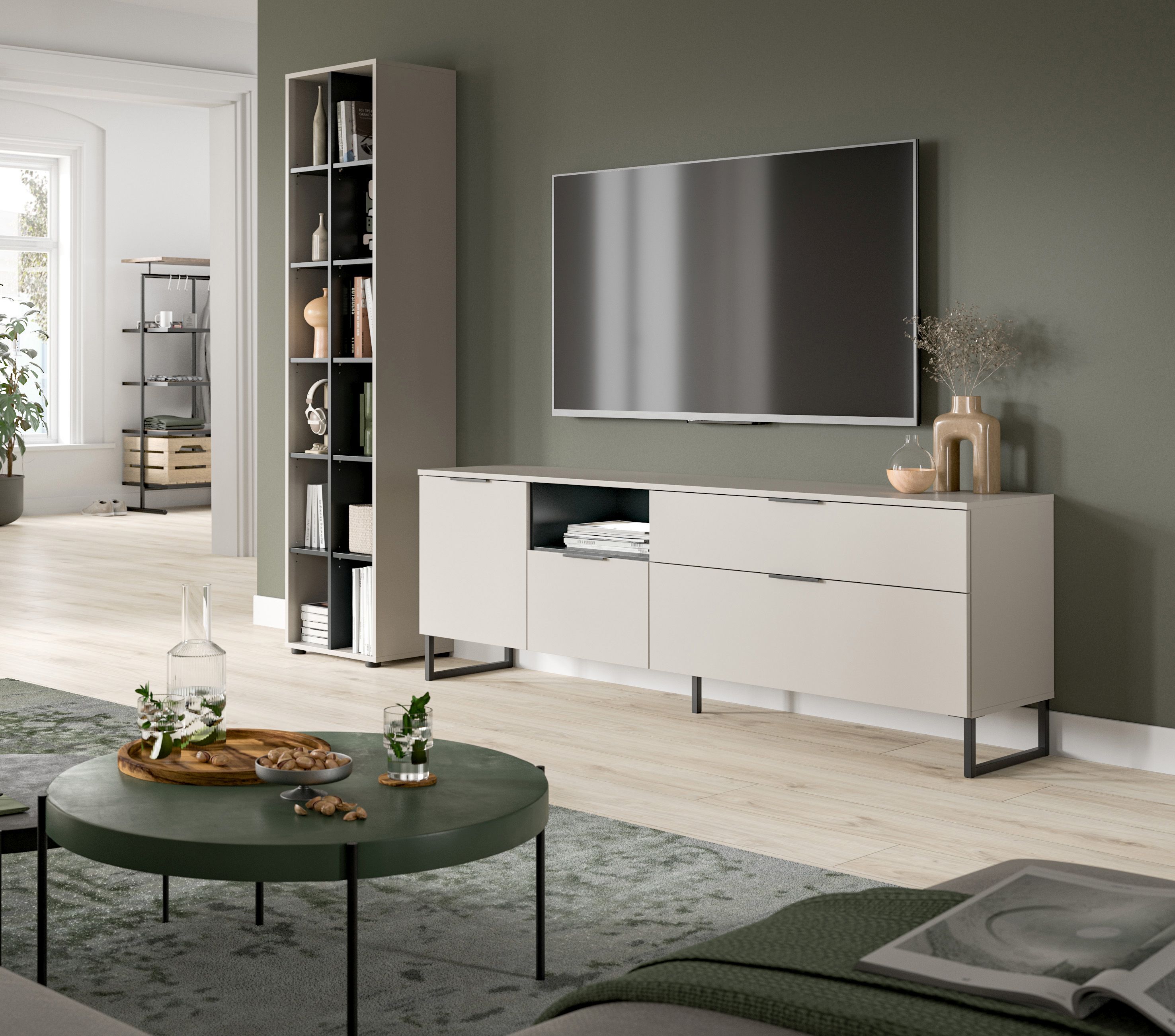 1 Lowboard mit 1 Tür, 1 Einlegeboden, 1 Schubkasten, 2 Klappen und 1 offenem Fach